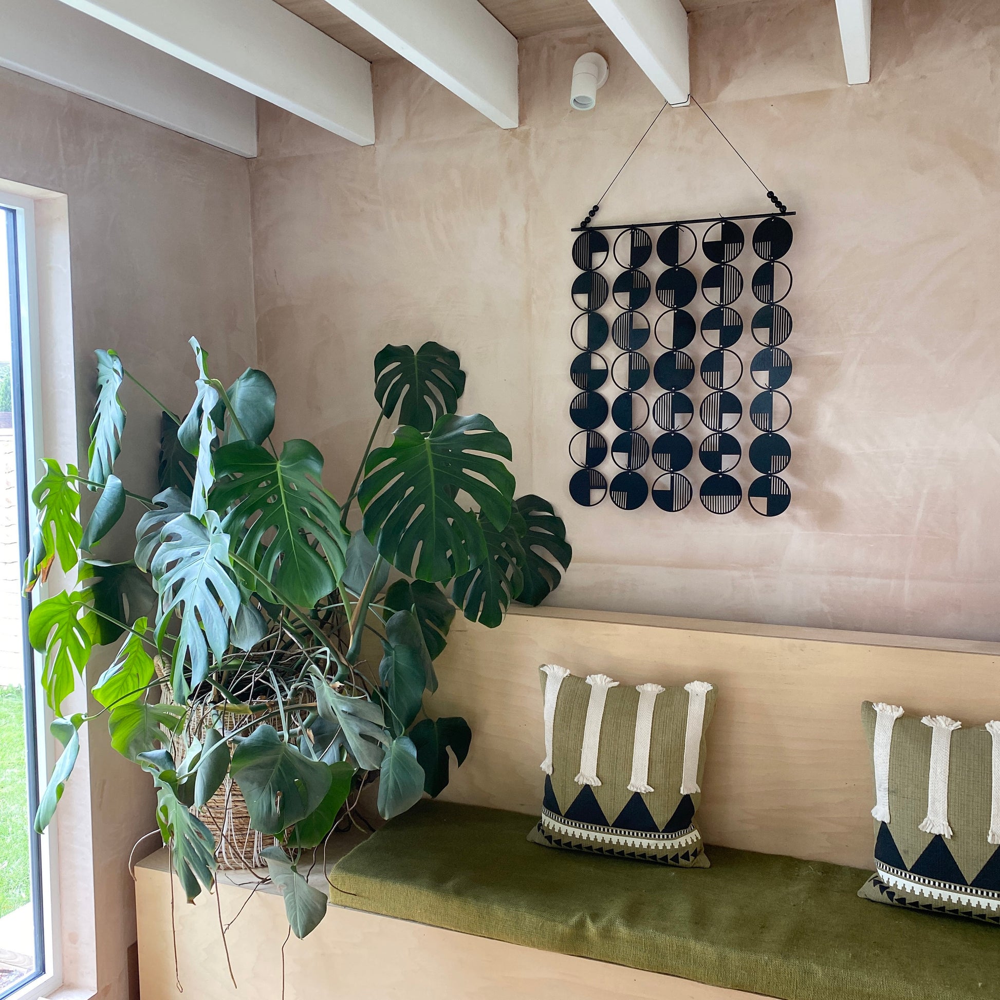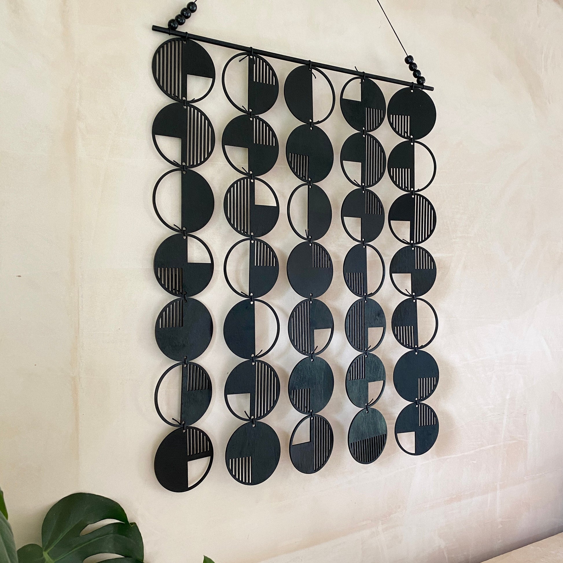 Lovingly handmade 28 disc wall hanging. This Black wall hanging would make a beautiful addition to any room to create a modern Contemporary feel. Designed and laser cut in the UK.
