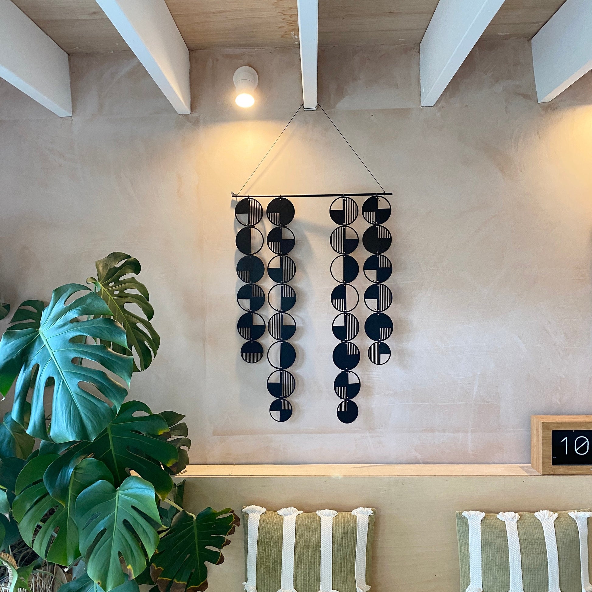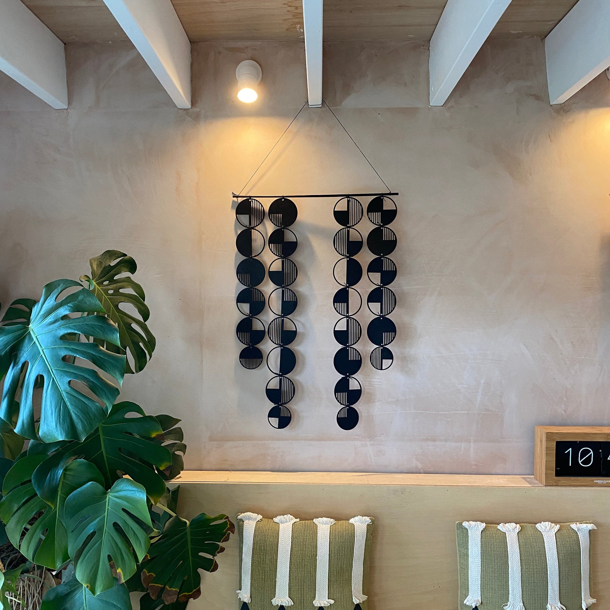 Lovingly handmade 28 disc wall hanging. This Black wall hanging would make a beautiful addition to any room to create a modern Contemporary feel. Designed and laser cut in the UK.