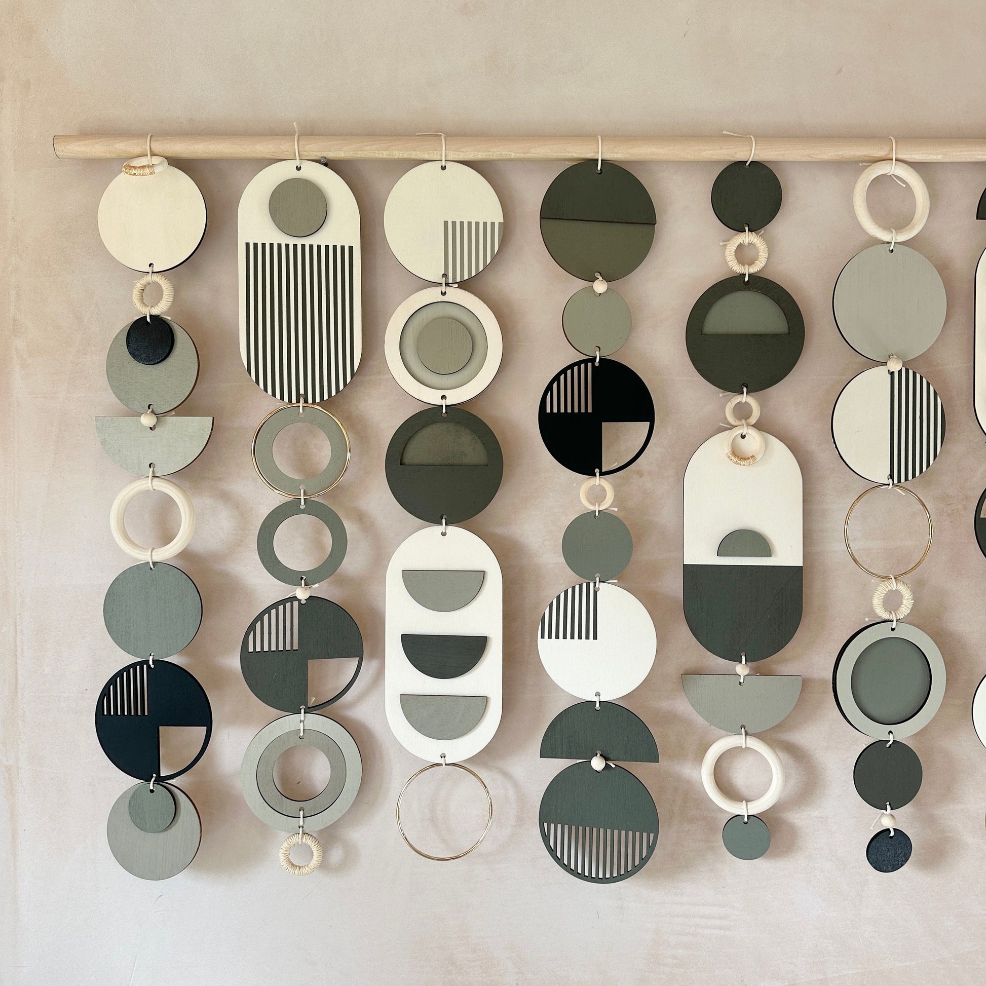 This large modern wall art hanging will make for a great statement piece in your home decor great for filling an empty wall with some interest. This geometric wall hanging is handmade and painted in a dark colour palette of grey tones. Some pieces are left unpainted to let the natural colour of the wood show.