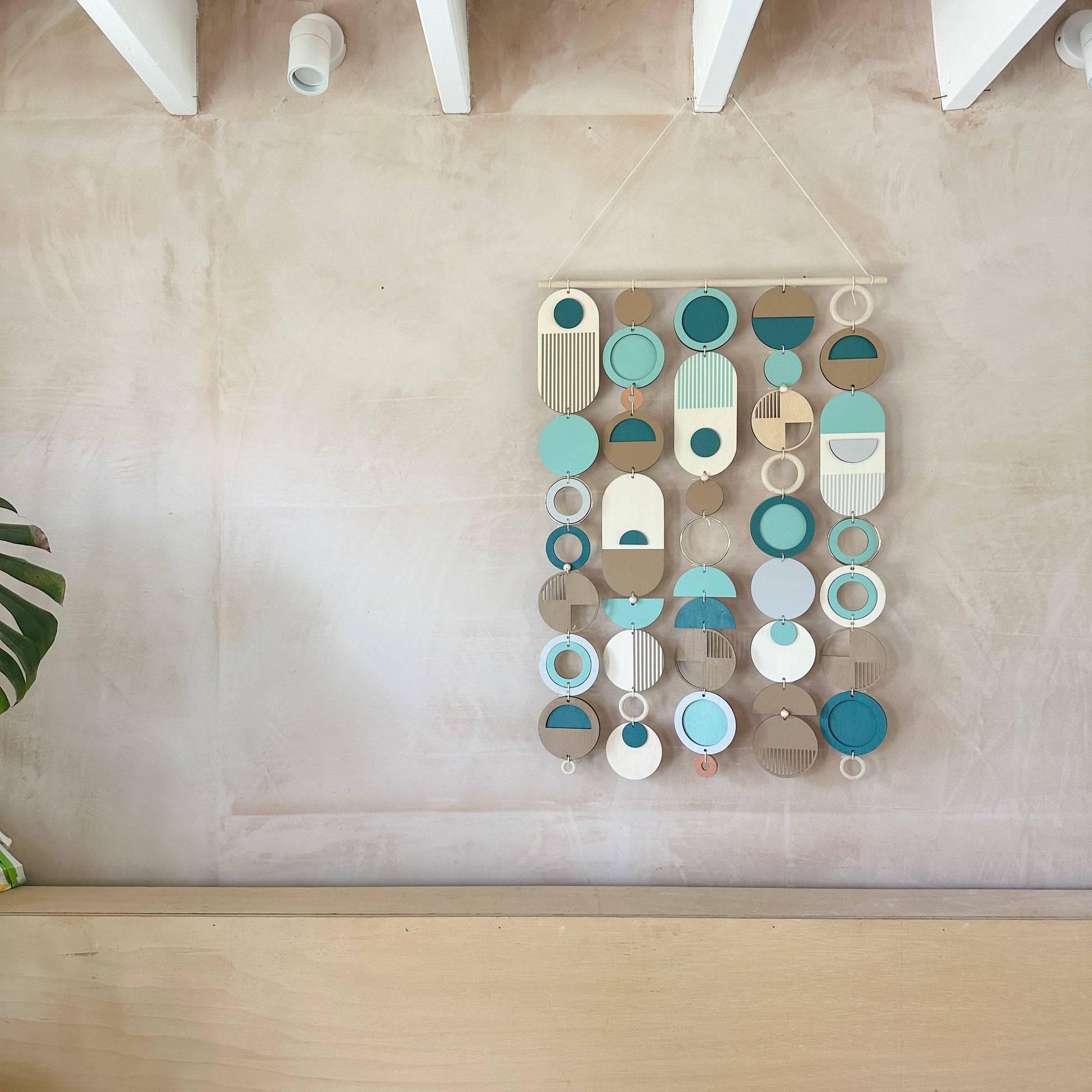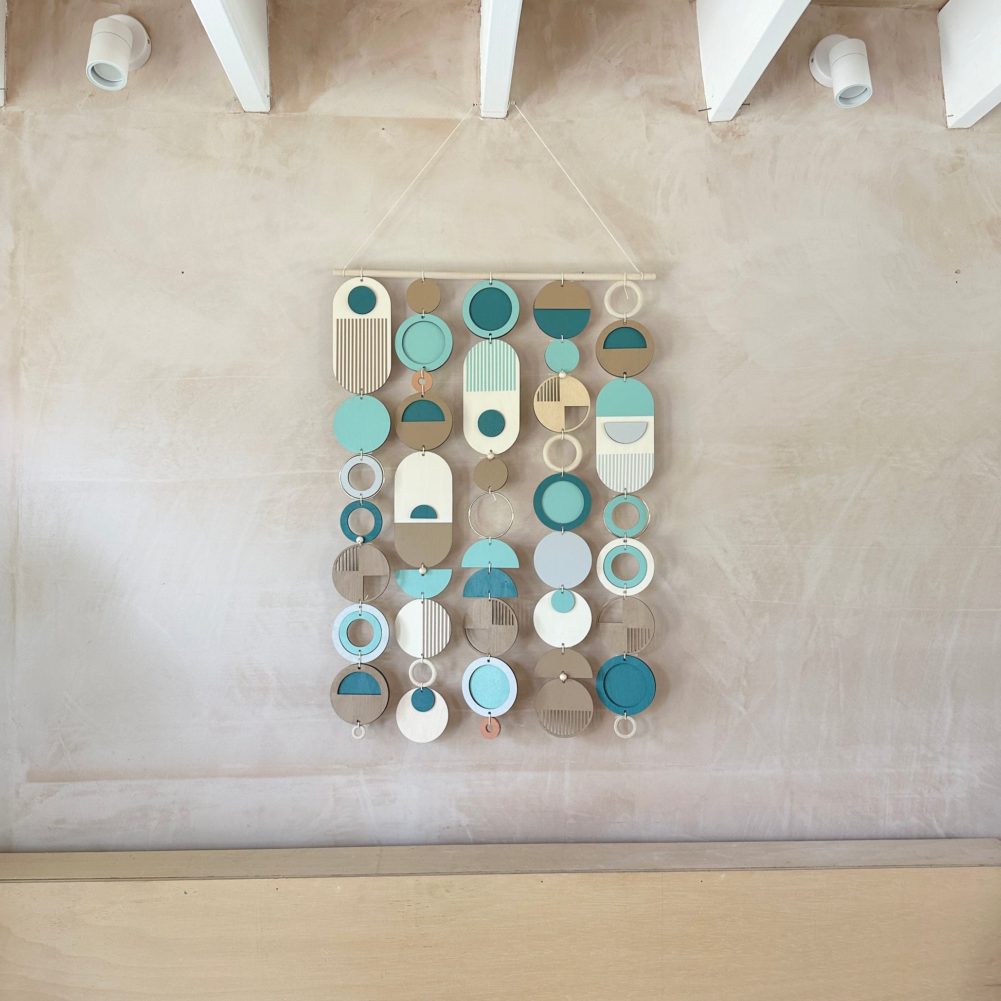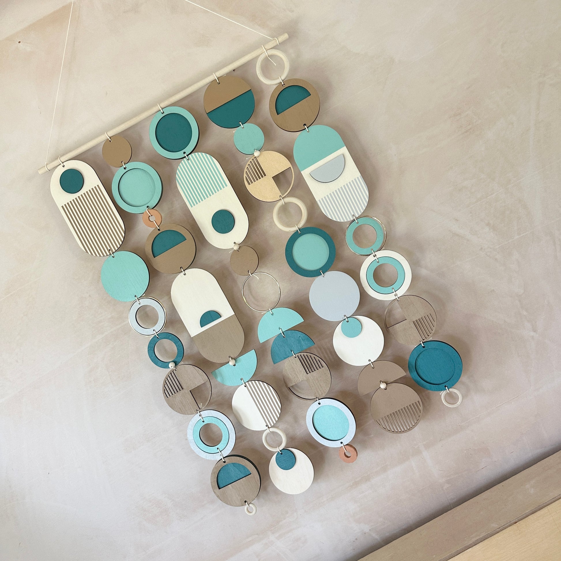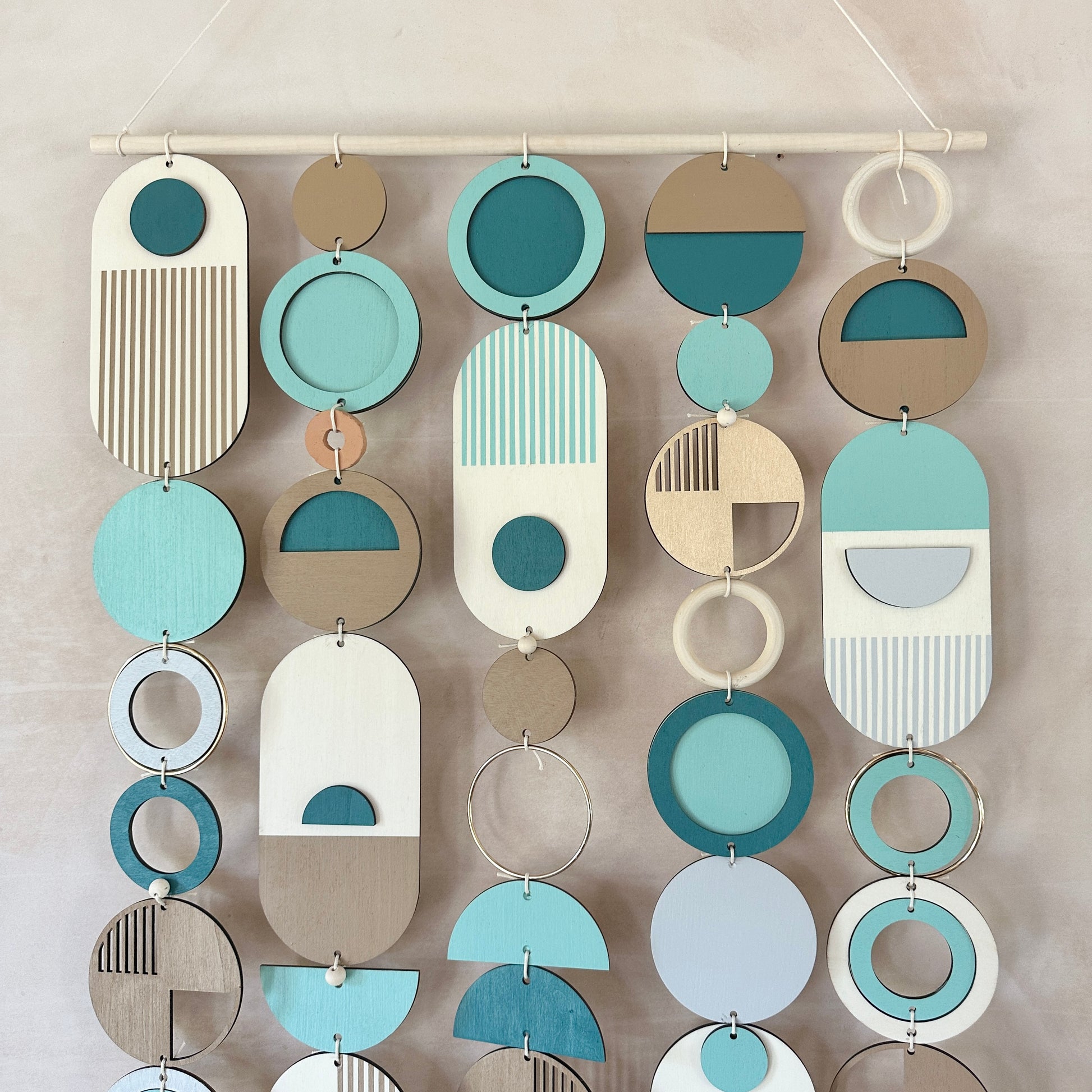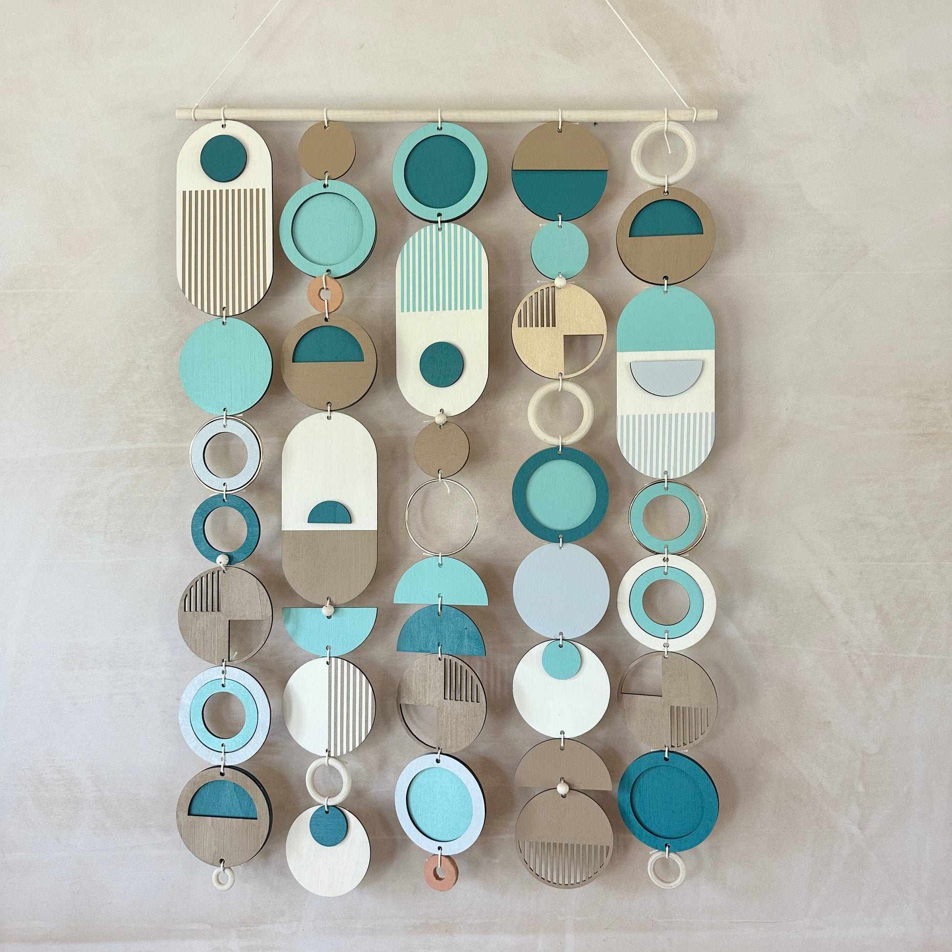 Lovingly handmade modern wall art. This collection is made from plywood, paint, metal, ceramics, waxed cord and wooden beads. The colours used are blues, earthy beige, light grey and gold. This collection of wall hangings would make a beautiful addition to any room to create a beachy mid-century feel. Made from sustainable plywood, hand painted and constructed in Milton Keynes, England.
