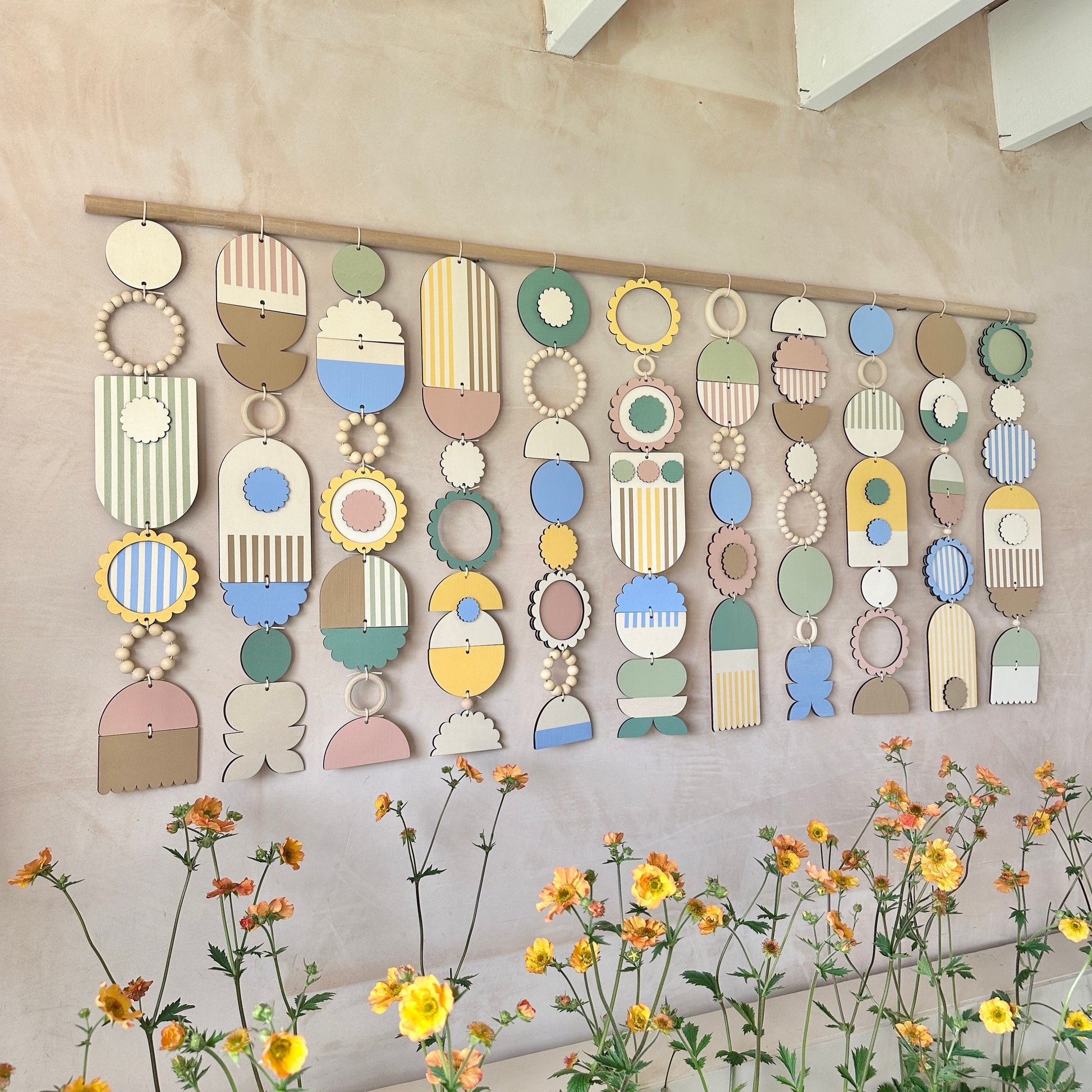 This floral inspired wall hanging is hand painted and constructed from sustainable plywood in Milton Keynes, England. Pastel tones and geometric floral shapes give this piece a soft and modern art feel. Great for bringing some colour and creativity into your home.