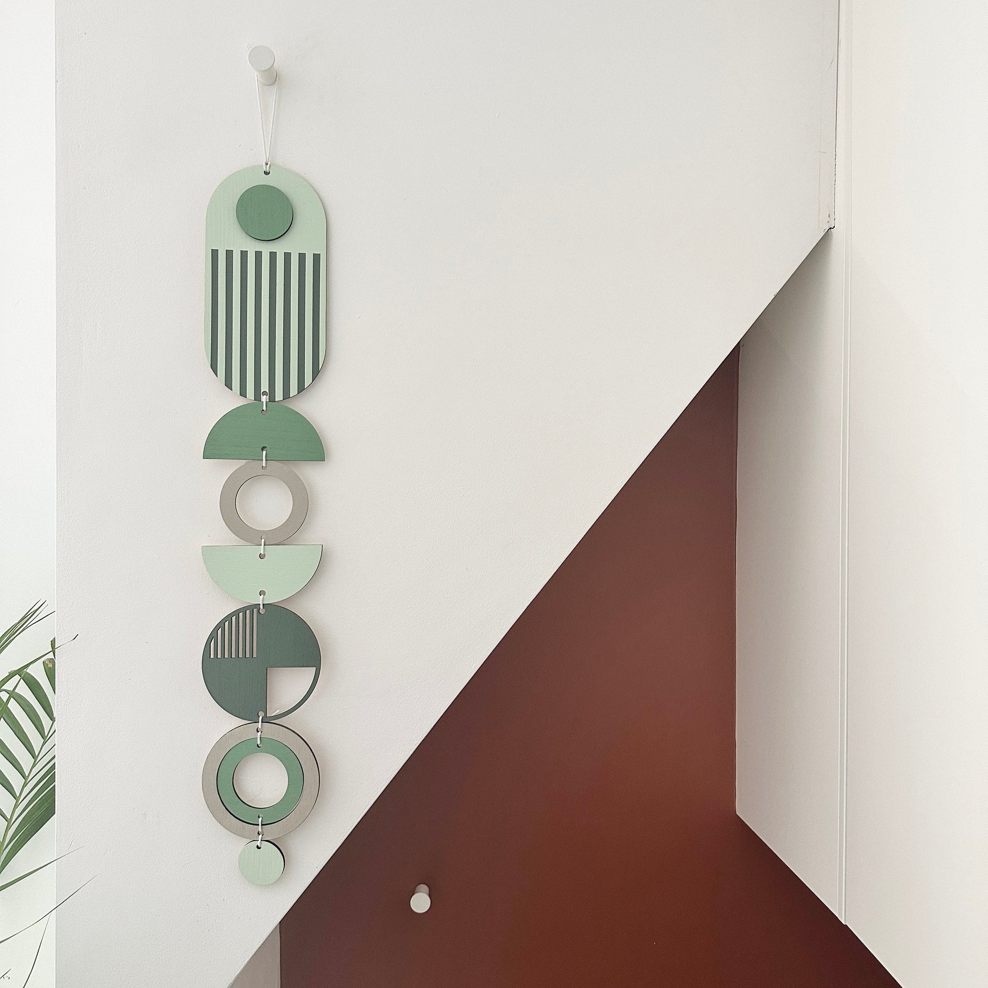 - Each plywood piece is hand painted in contrasting green tones