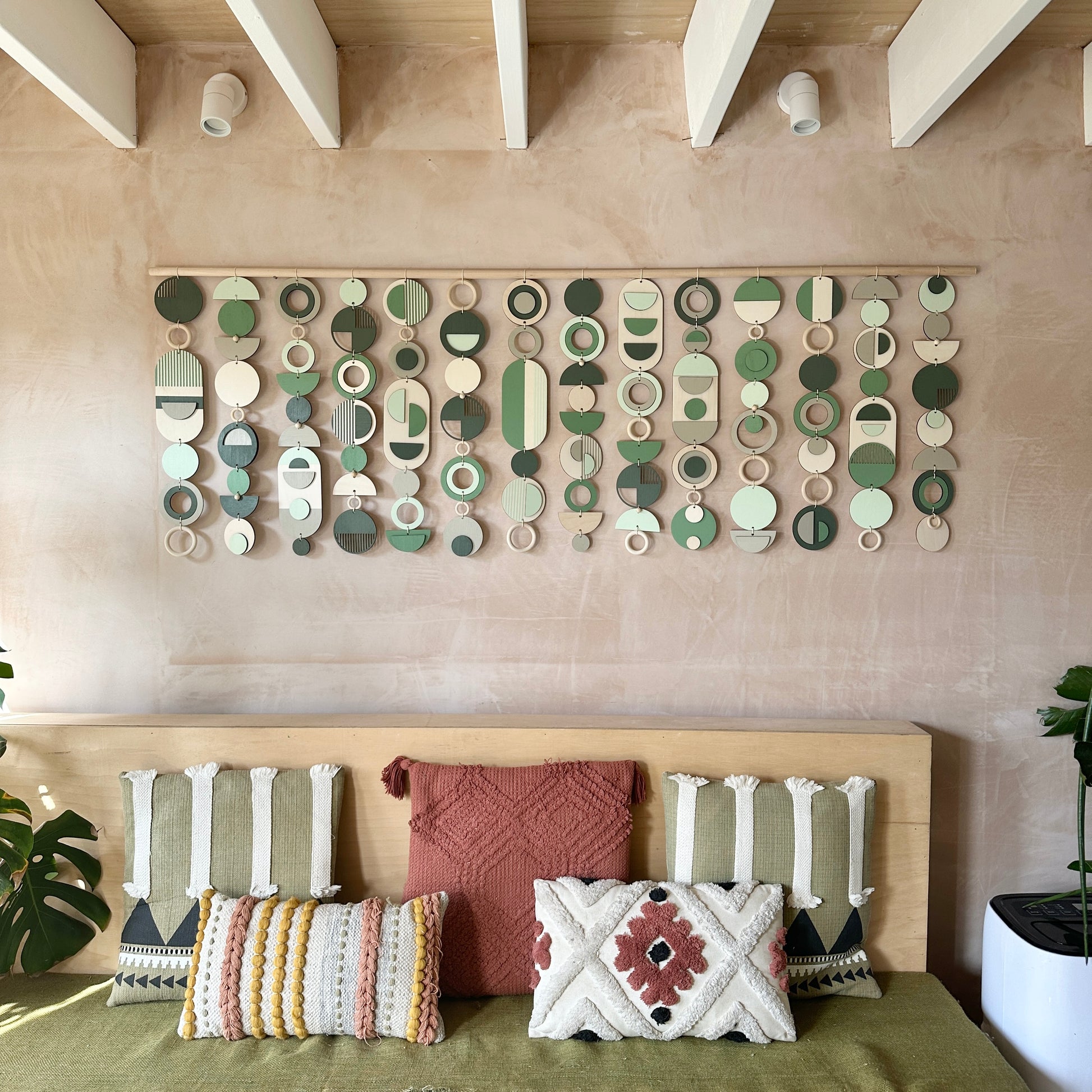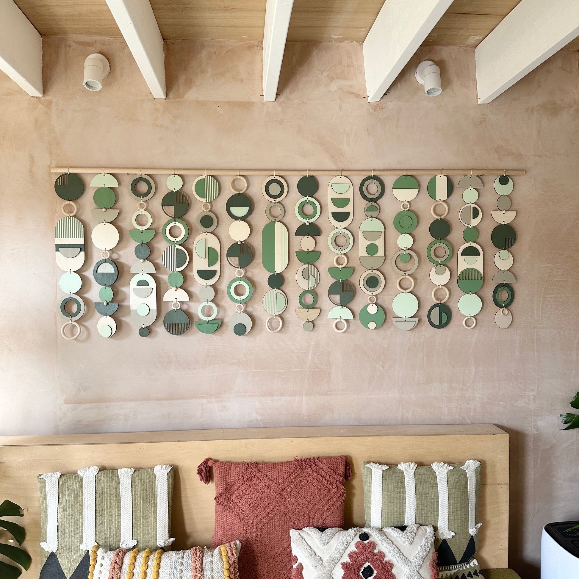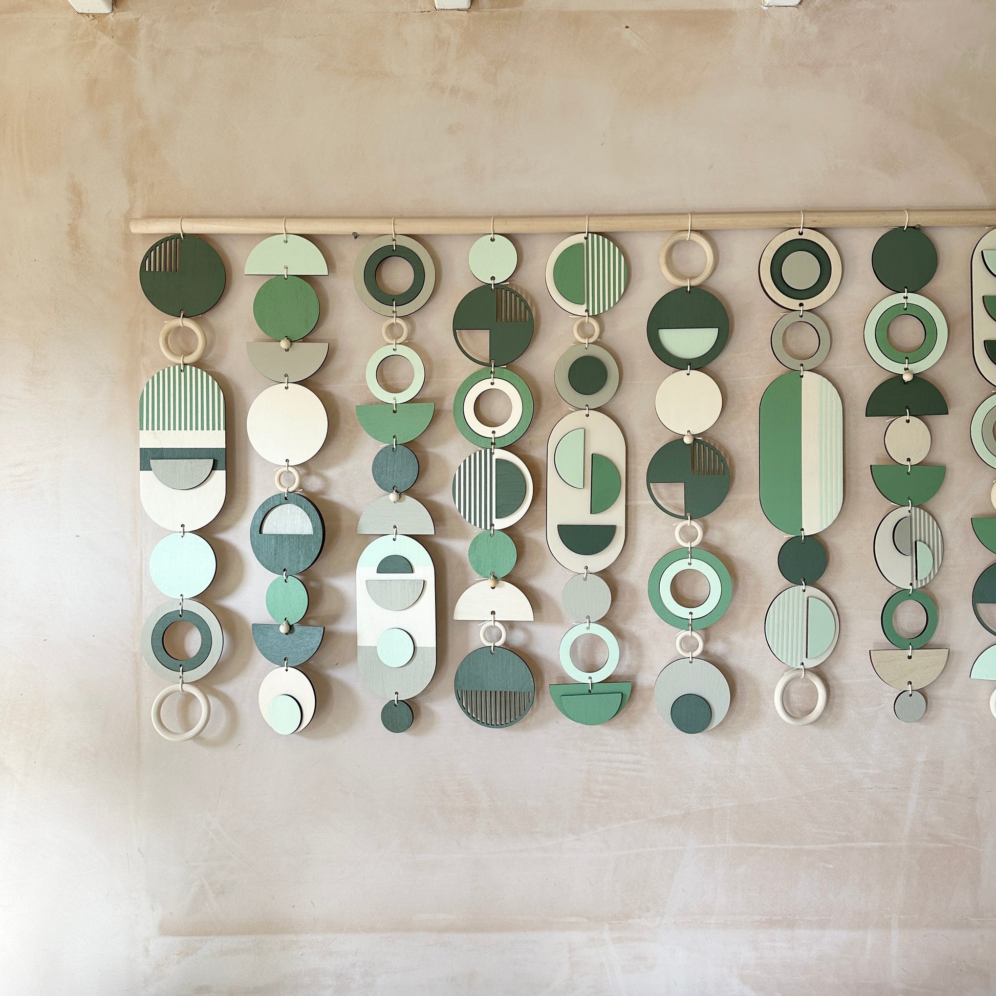 This large green wall art will make for a great statement piece in your home decor great for filling an empty wall with some interest. This big wall hanging is handmade and painted in beautiful blend of green tones adding a modern art flair to your home decor. Some pieces are left unpainted to let the natural colour of the wood show.
