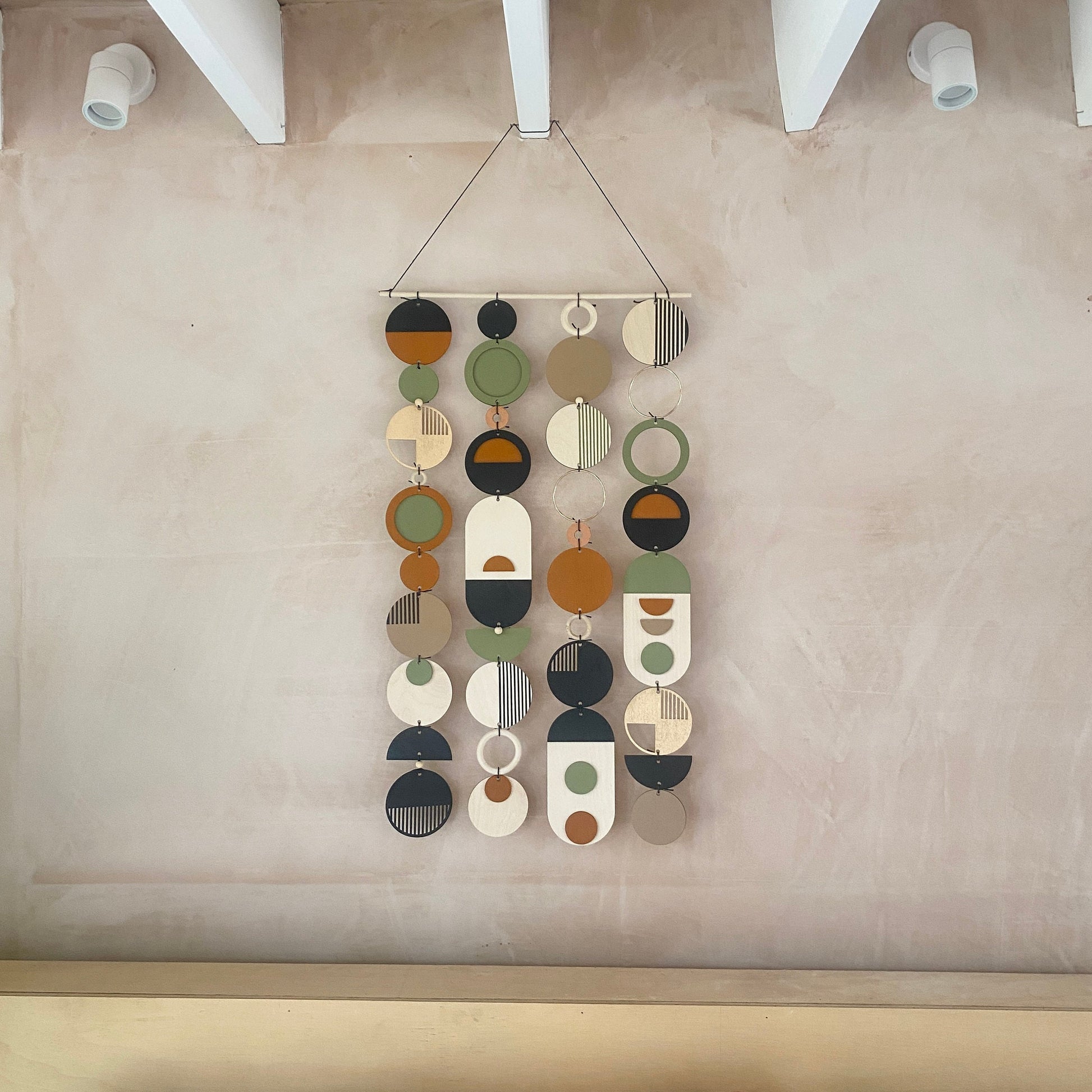 Lovingly handmade modern wall art. This Piece is made from plywood, paint, metal, ceramics, waxed cord and wooden beads. The colours used are a burnt orange, olive green, black, beige and gold. This slim wall hanging would make a beautiful addition to any room to create a modern mid-century feel. Made from sustainable plywood, hand painted and constructed in Milton Keynes, England.