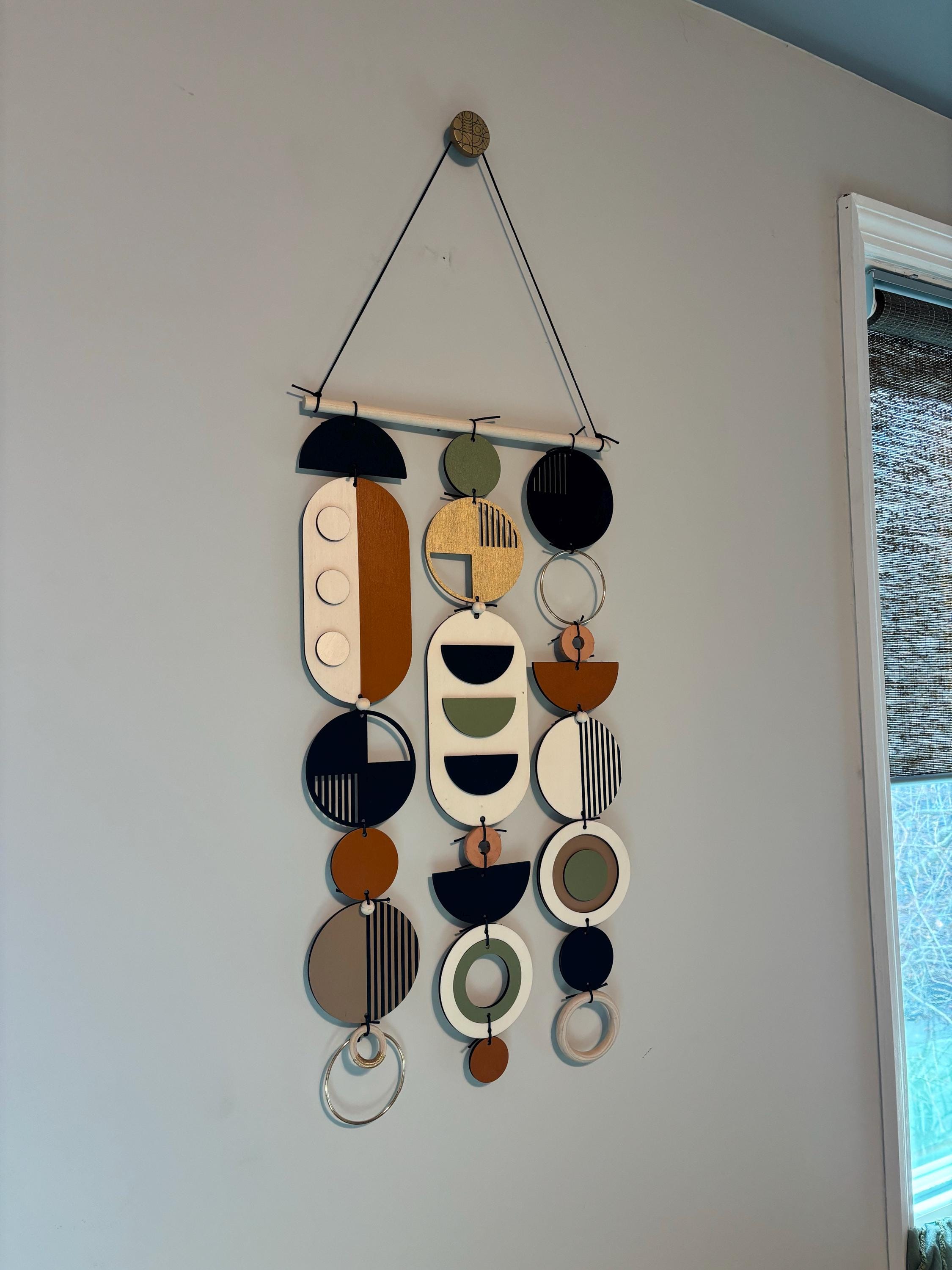 Lovingly handmade modern wall art. This Piece is made from plywood, paint, metal, ceramics, waxed cord and wooden beads. The colours used are a burnt orange, olive green, black, beige and gold. This slim wall hanging would make a beautiful addition to any room to create a modern mid-century feel. Made from sustainable Birch plywood, hand painted and constructed in Milton Keynes, England.