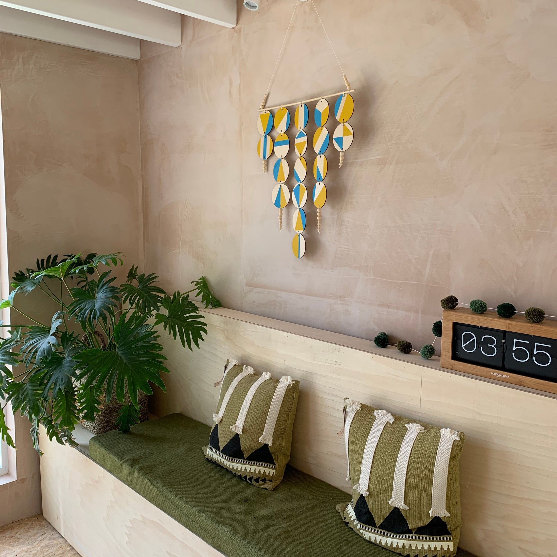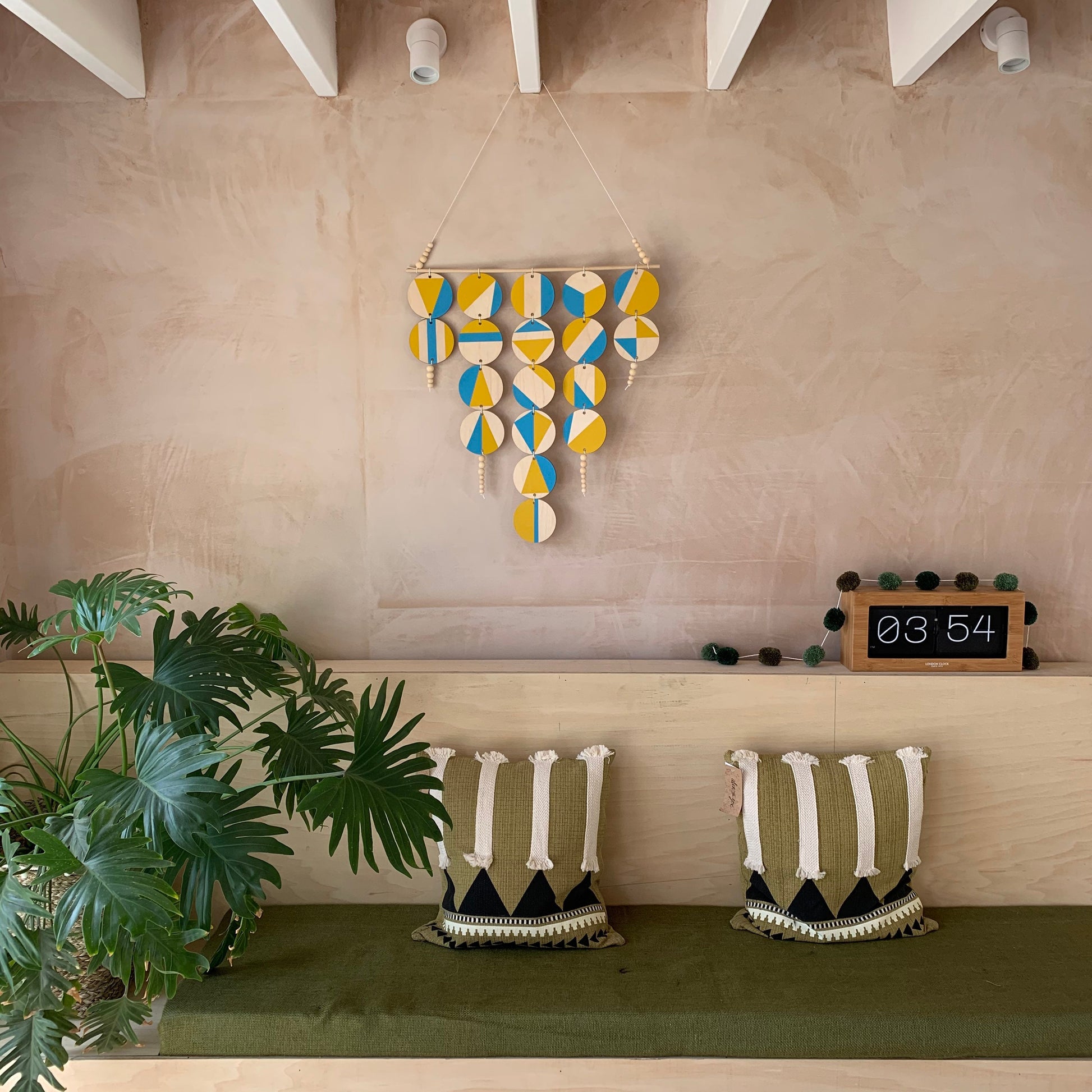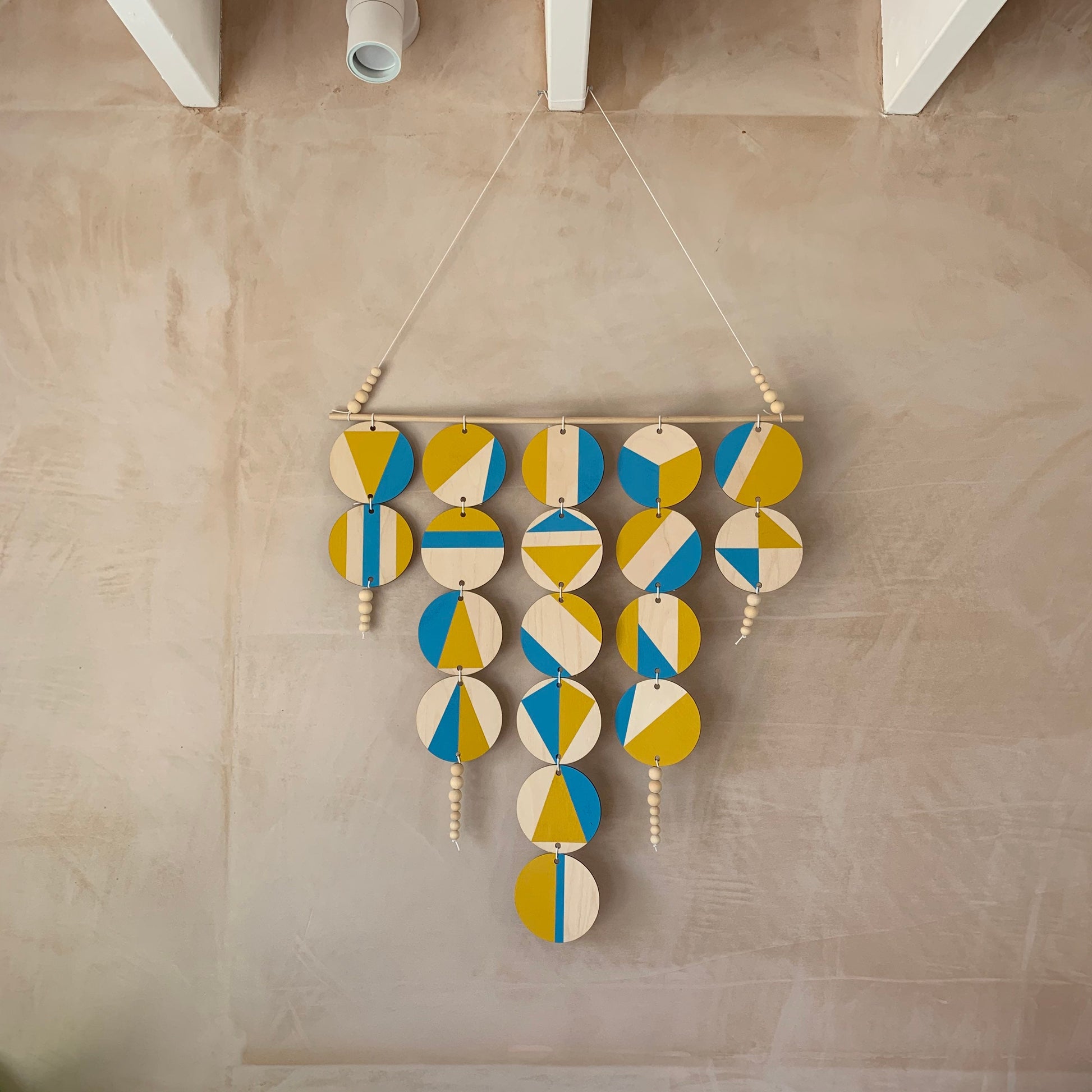 Lovingly handmade 18 disc hanger. This yellow and blue hanger would make a beautiful addition to any room to create a modern Scandinavian feel.