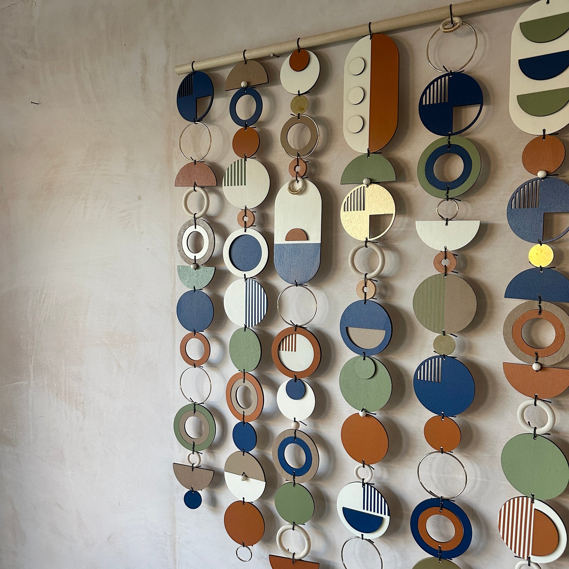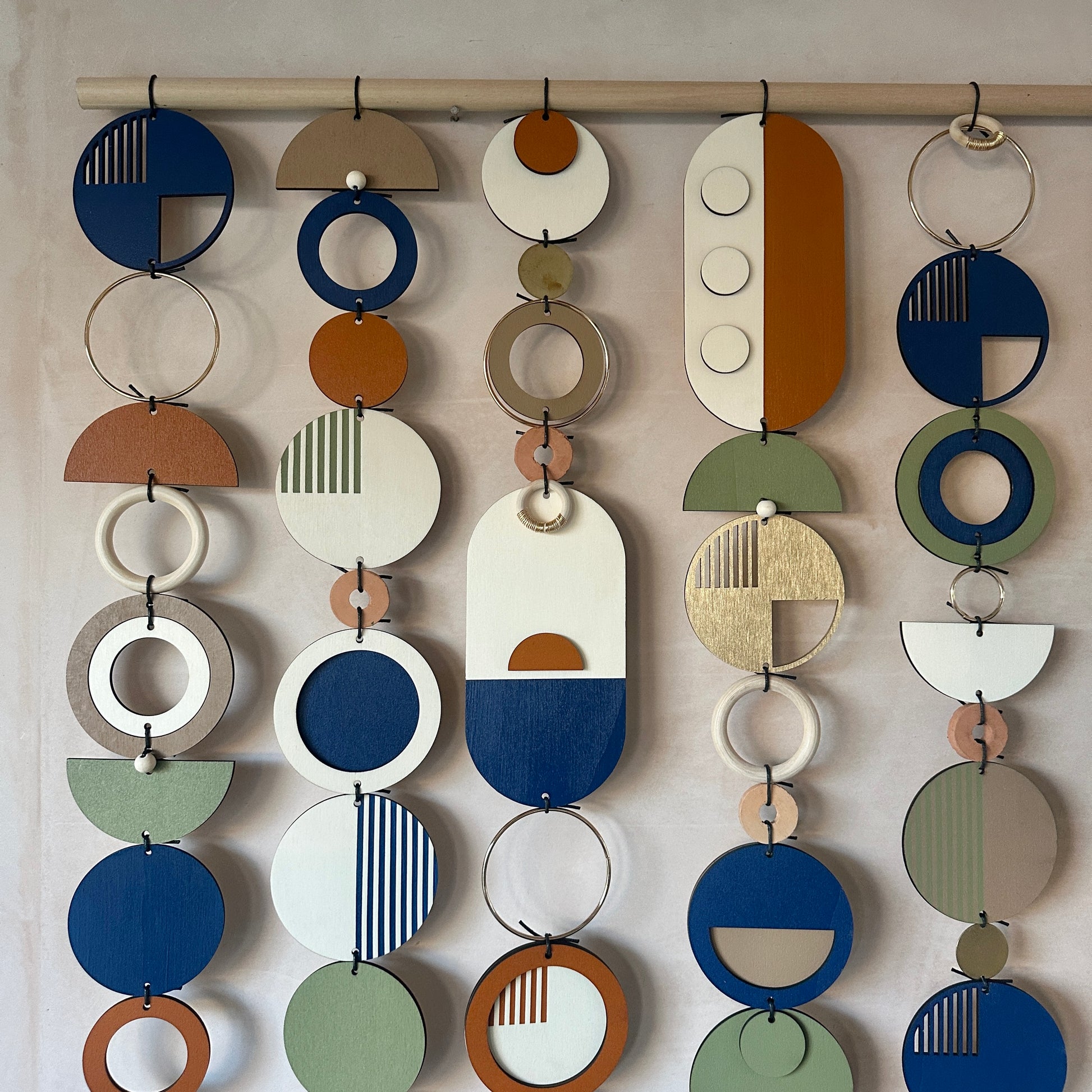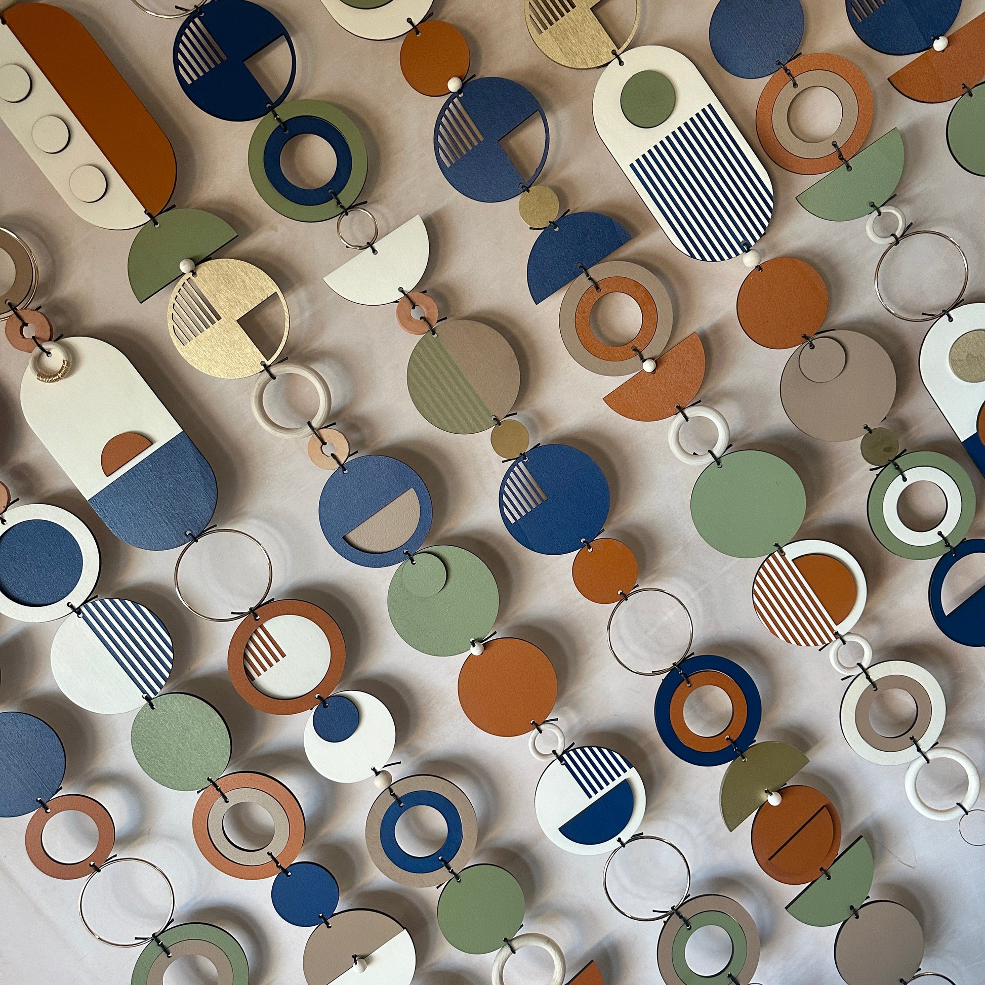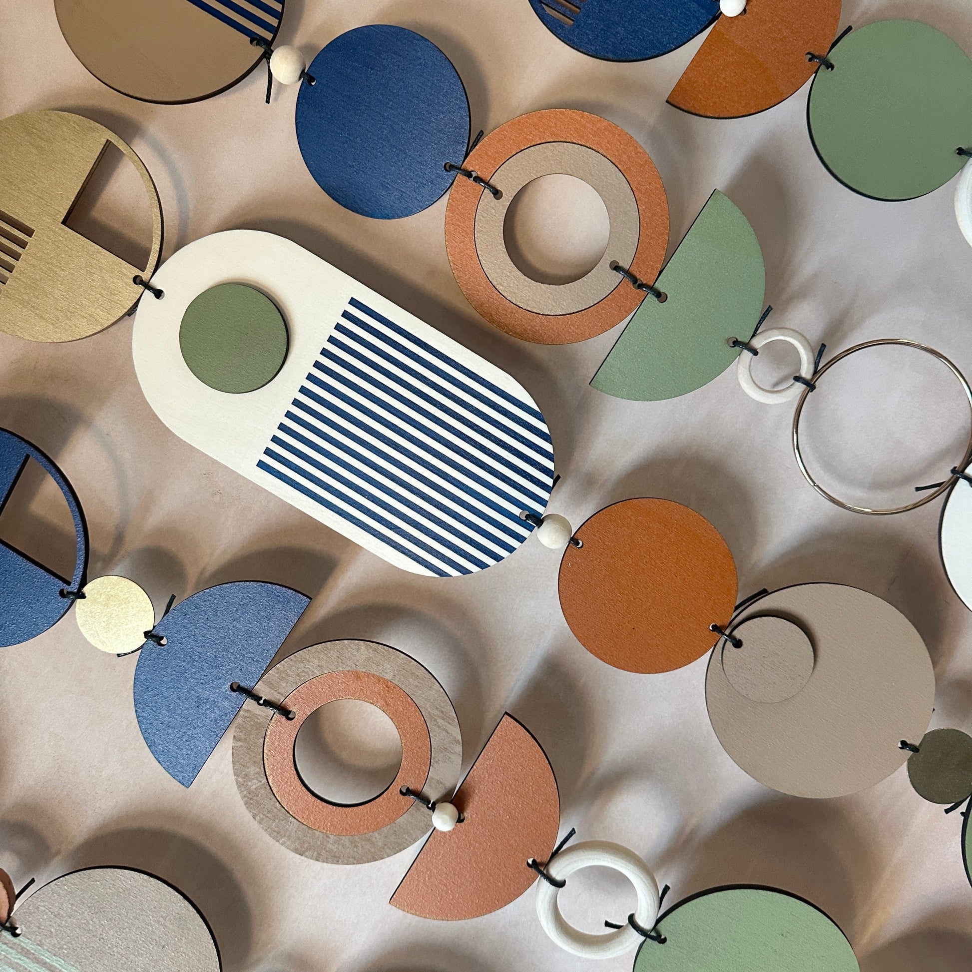 - Each plywood piece is painted in the mid century colour palette of green, orange, navy and beige. Some pieces are left unpainted to let the natural colour of the wood show.