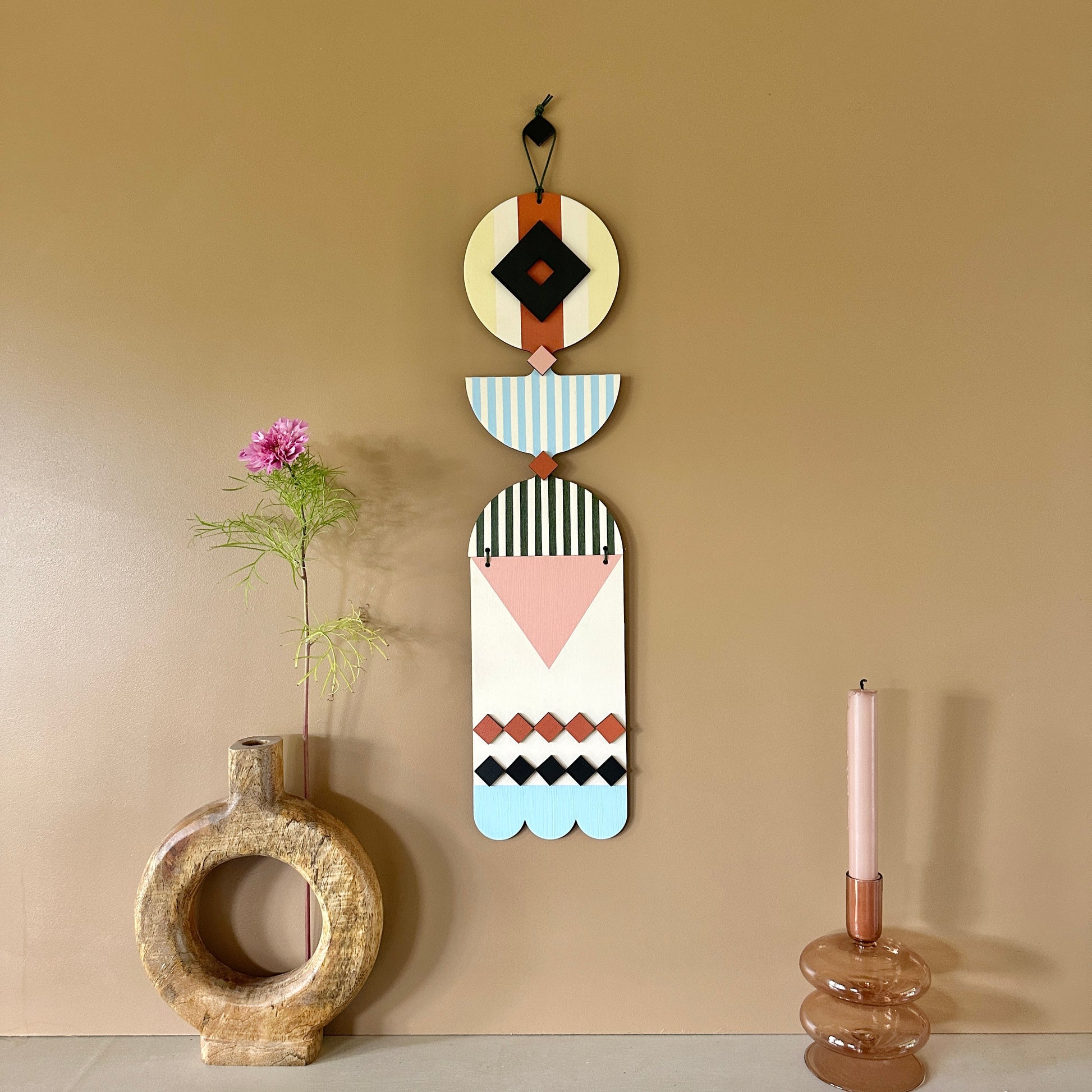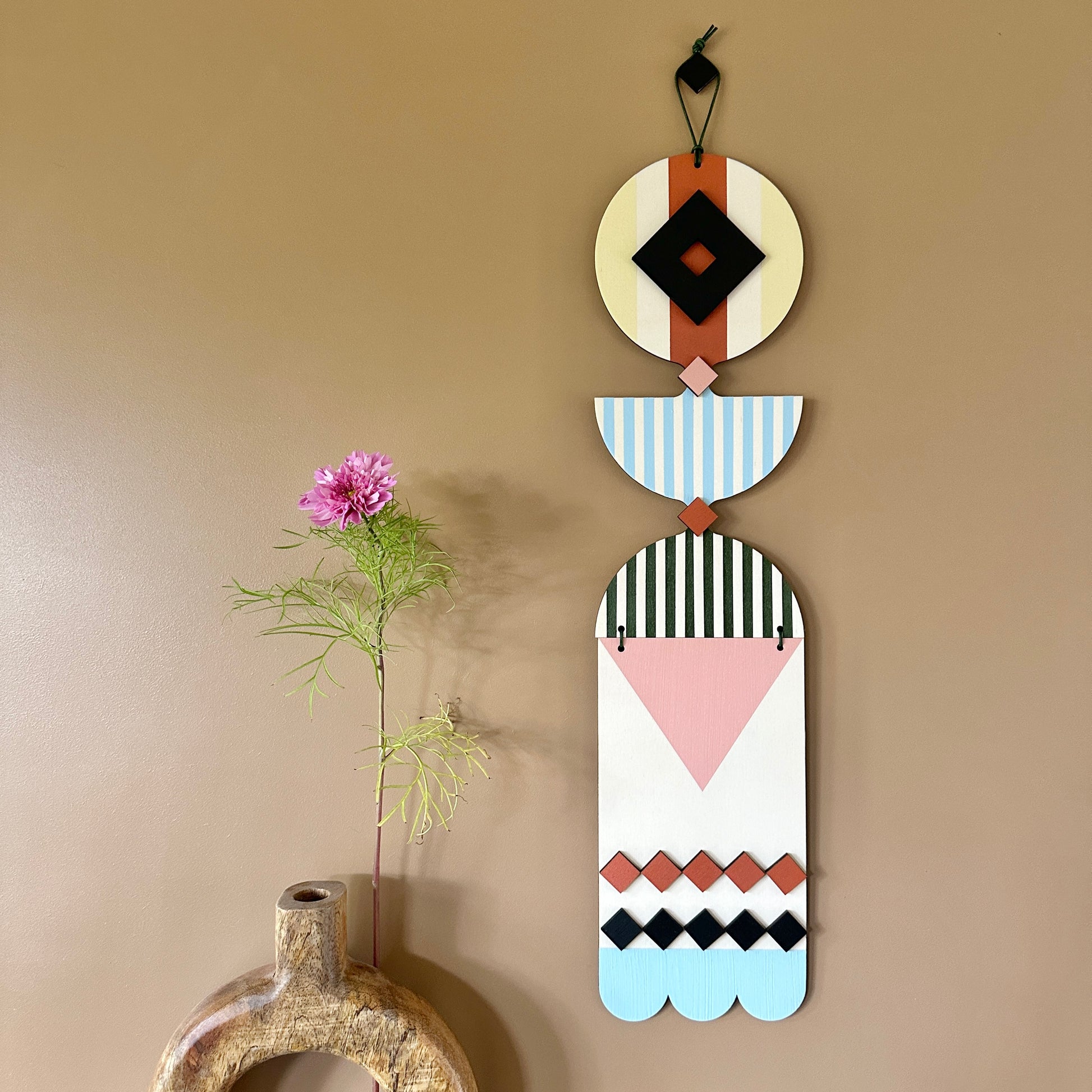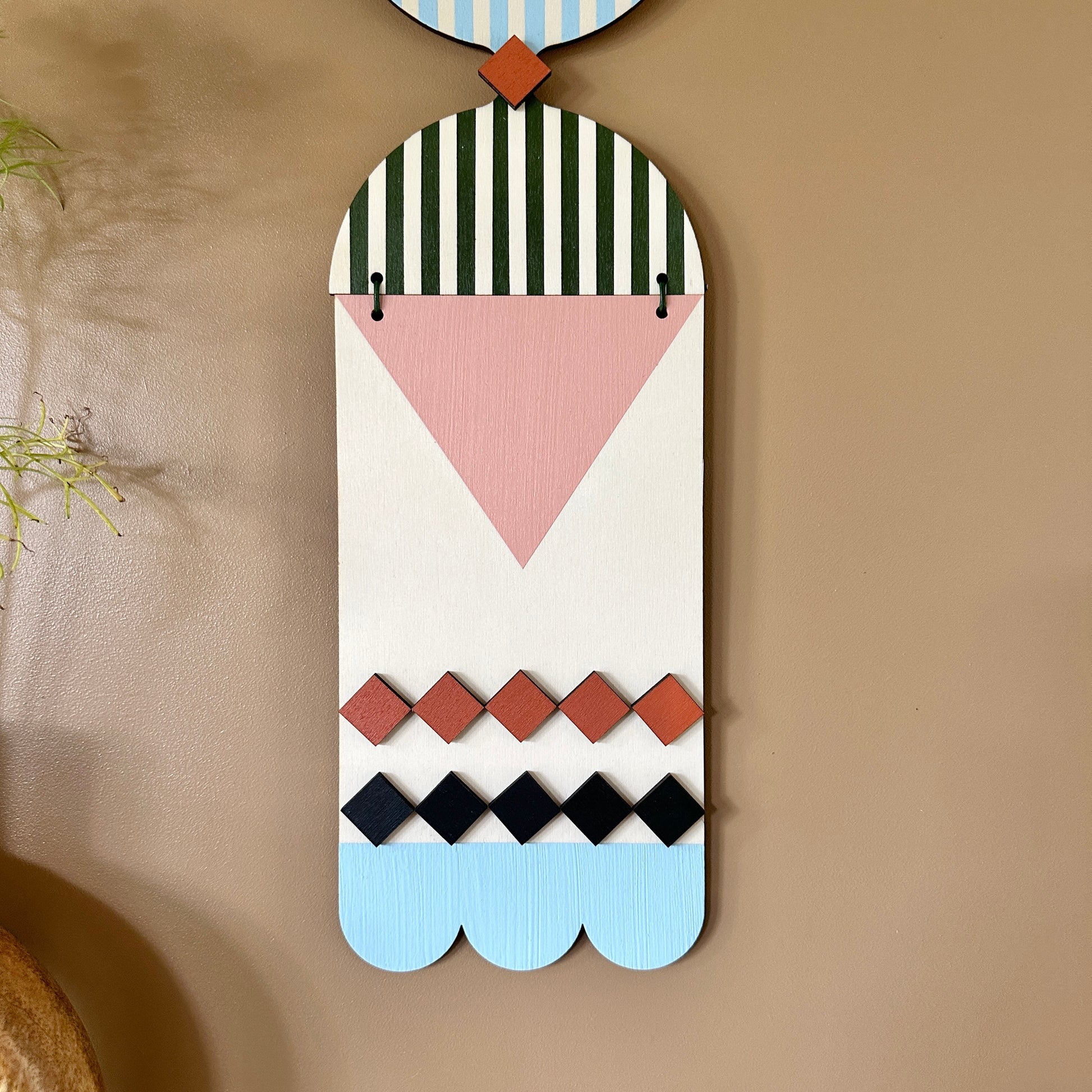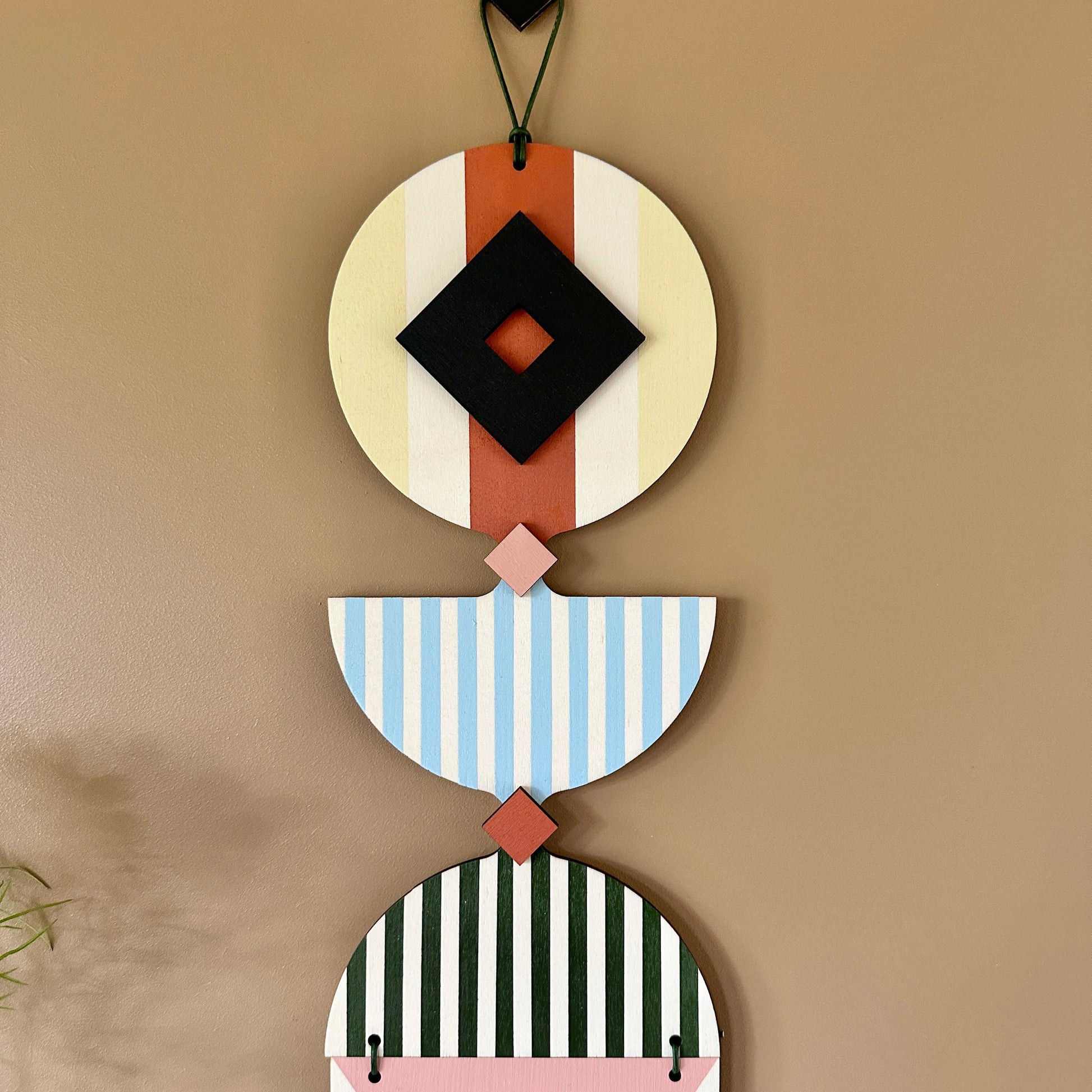 Add some interest to your decor with our abstract handmade wall sculpture. This unusual decorative wall hanging is sure to add some interest to a blank wall with its unusual colour scheme and use of geometric shapes.