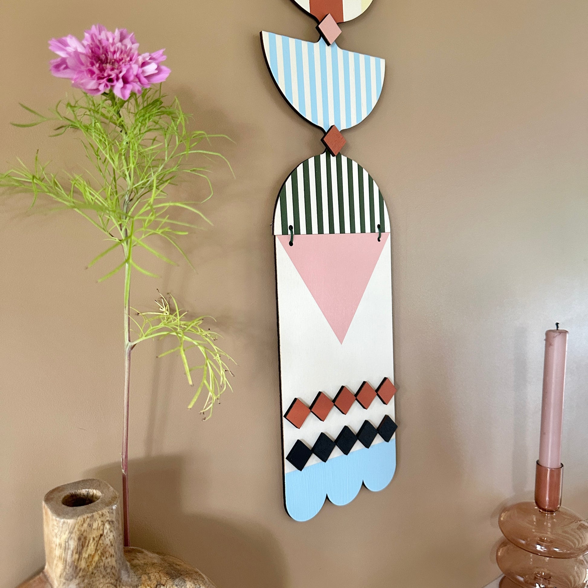 - Each plywood piece is hand painted in the colours of blue, black, orange, green, pink and white.