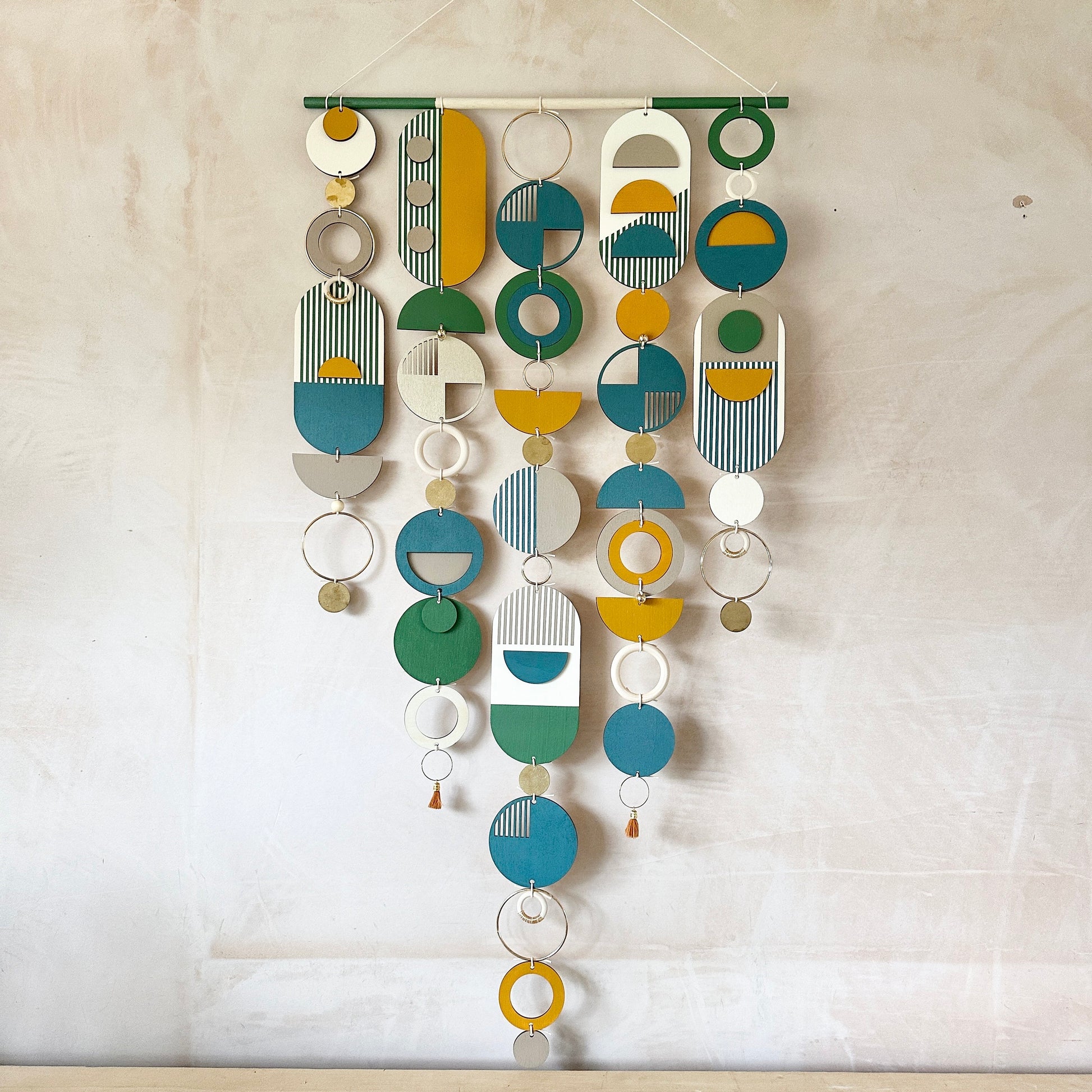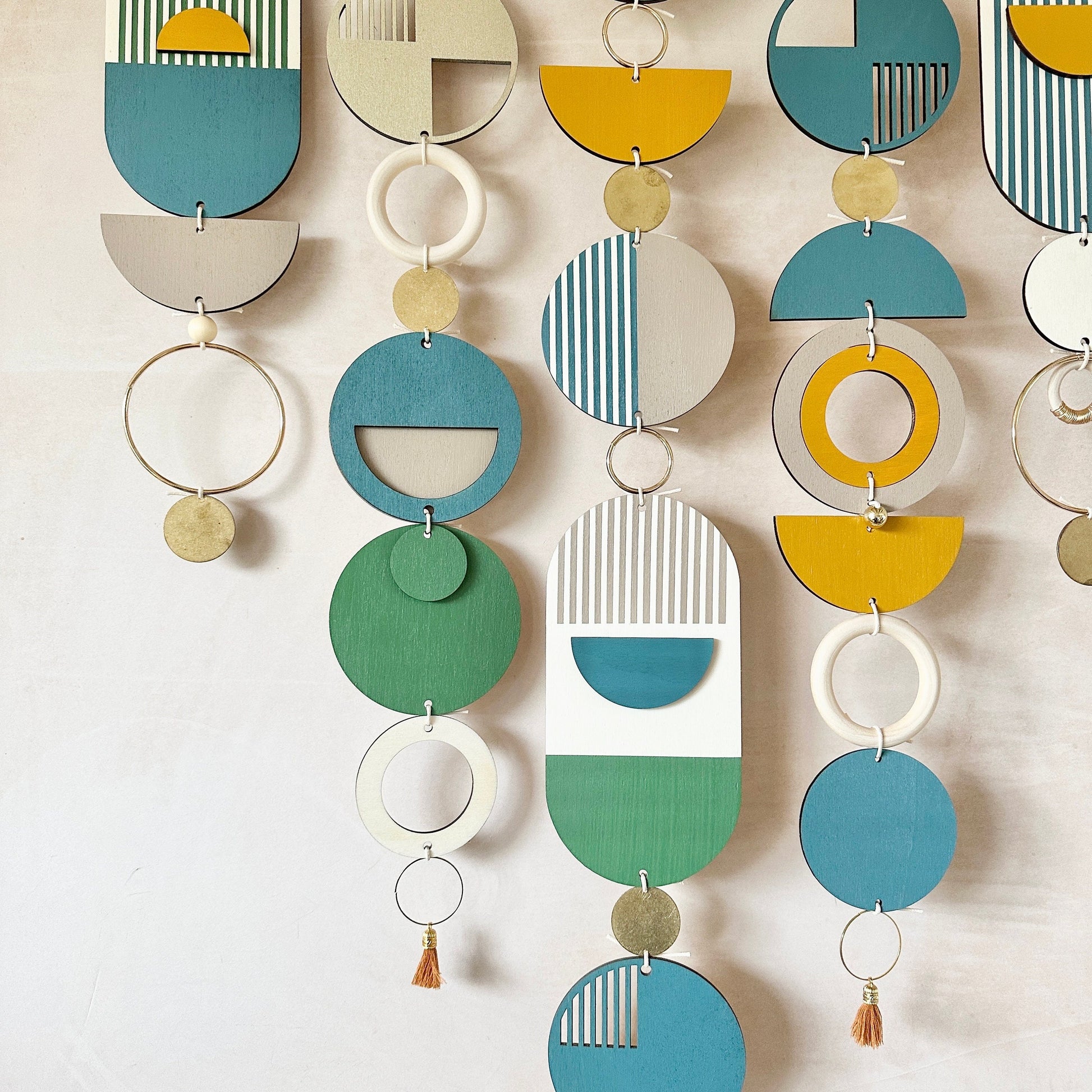 This wall sculpture will add a touch of Bauhaus design to your home decor great for filling an empty wall with some interest. This modern geometric wall art is handmade and painted in a colourful palette of yellow, teal, green, brown and gold. Some pieces are left unpainted to let the natural colour of the wood show.