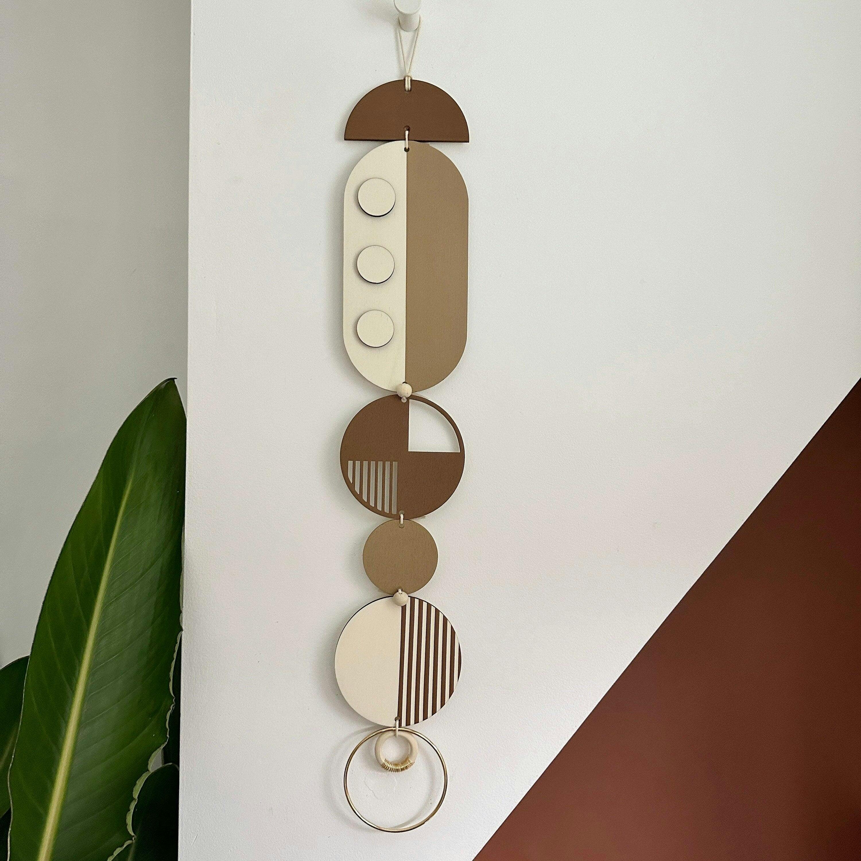 Lovingly handmade modern wall art. This Piece is made from plywood, paint, metal, waxed cord and wooden beads. The colours used are all brown and Earthy tones. This slim wall hanging would make a beautiful addition to any room to create a modern mid-century feel. Made from sustainable plywood, hand painted and constructed in Milton Keynes, England.