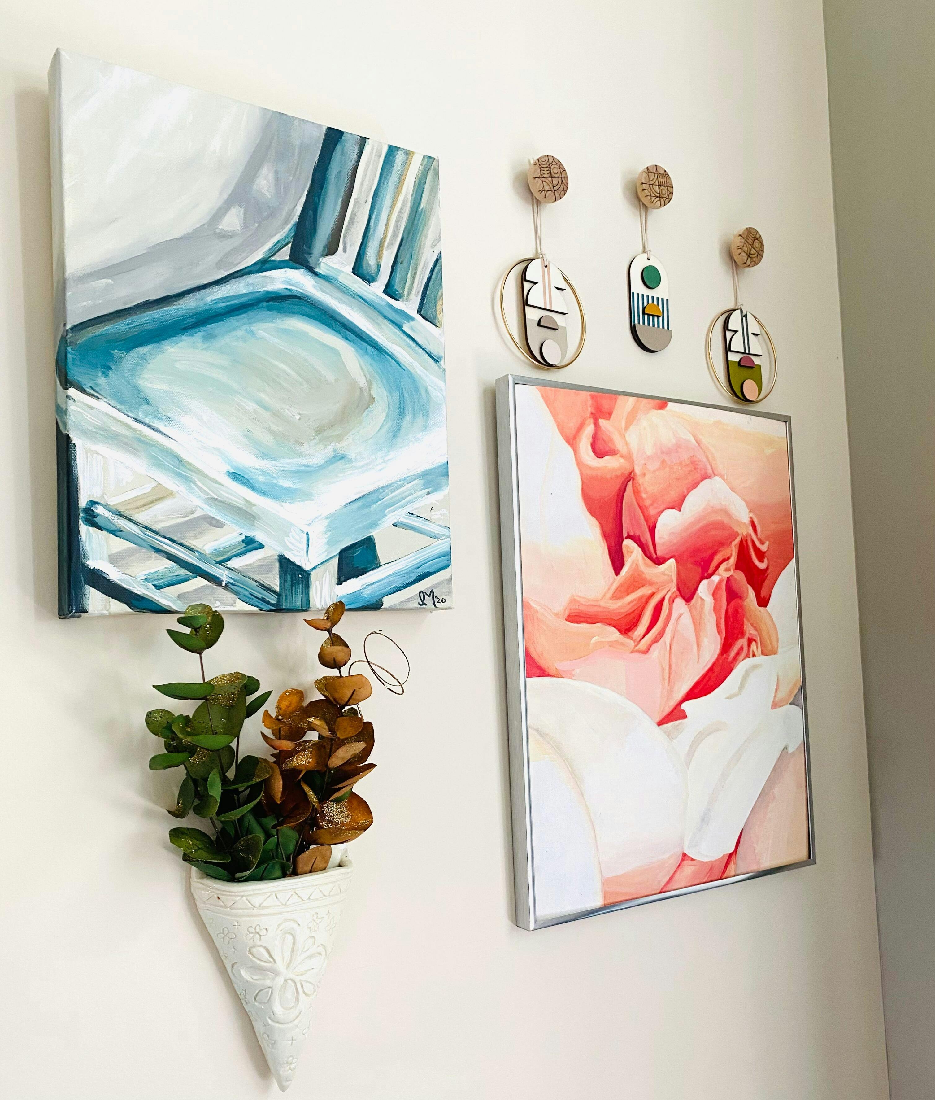 I have a larger piece in my living-room I bought years ago - recently I needed several small pieces to balance a wall grouping and I had fun selection 3 pieces to match the colors of the existing art