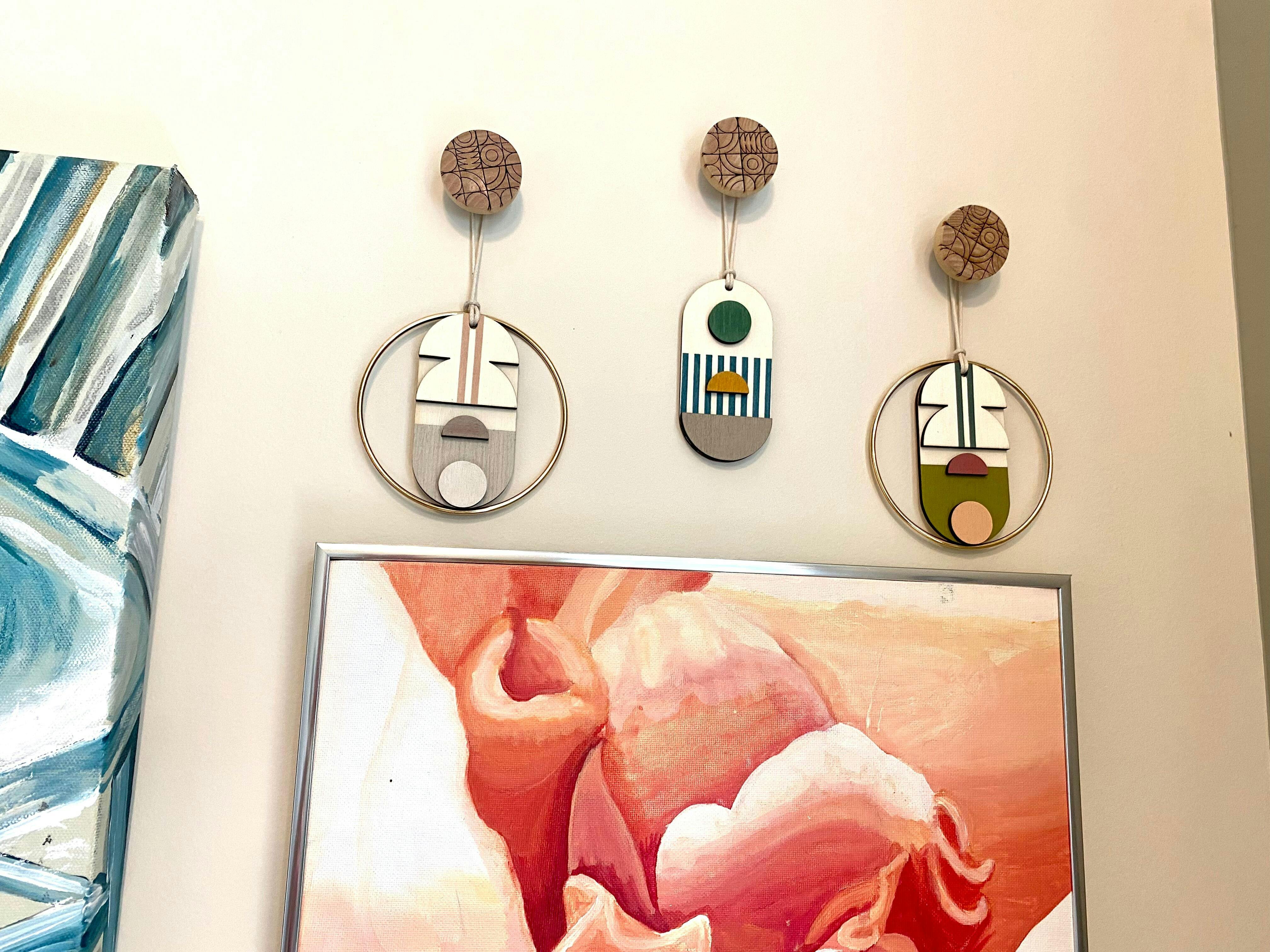 These colourful wall hooks feature a laser etched geometric pattern and are hand painted in an array of different colours. These wooden wall hooks could be used as decorative features, or functional hooks for hanging clothes, jewellery or for pairing with our handmade wall art. You could even use them as drawer pulls.