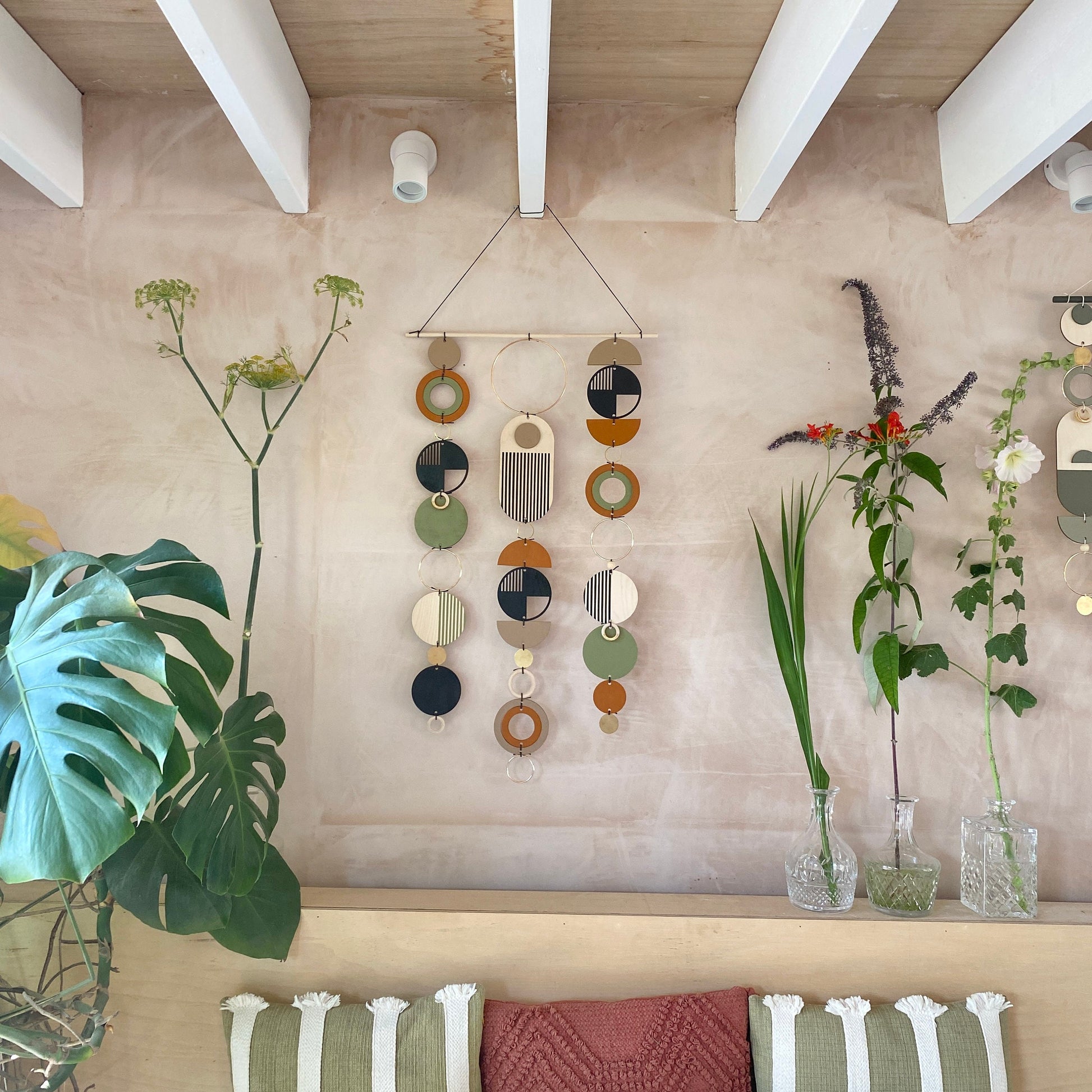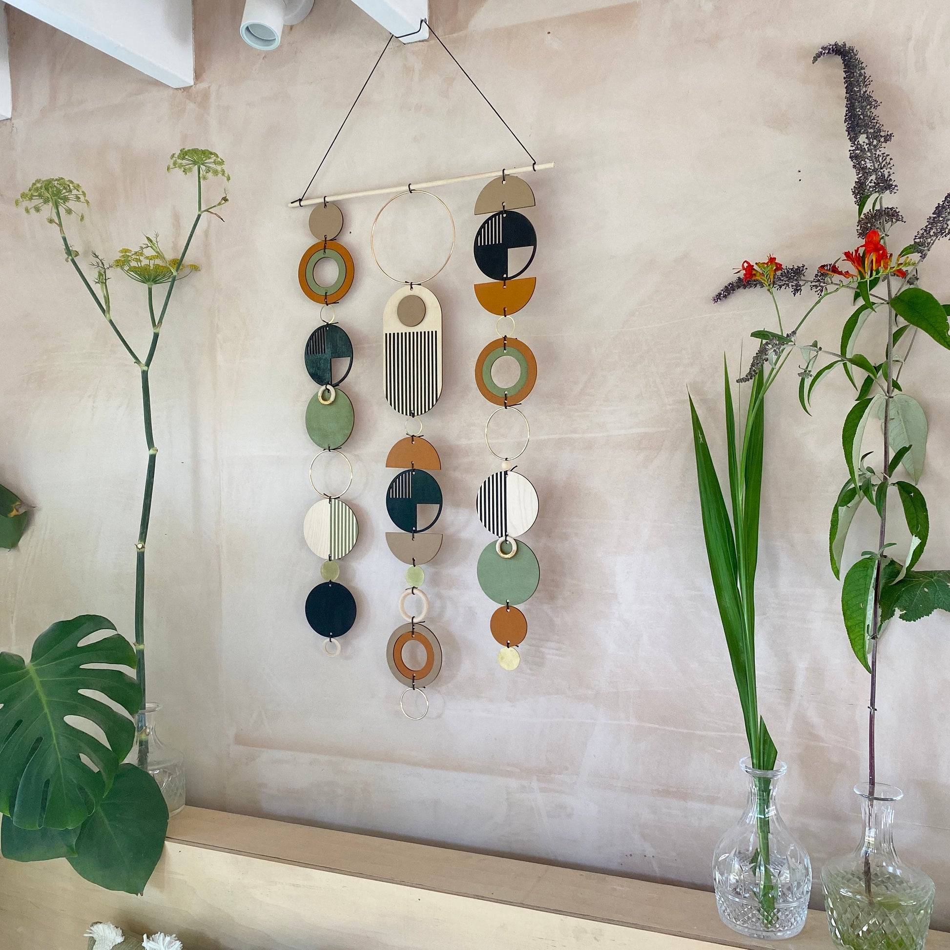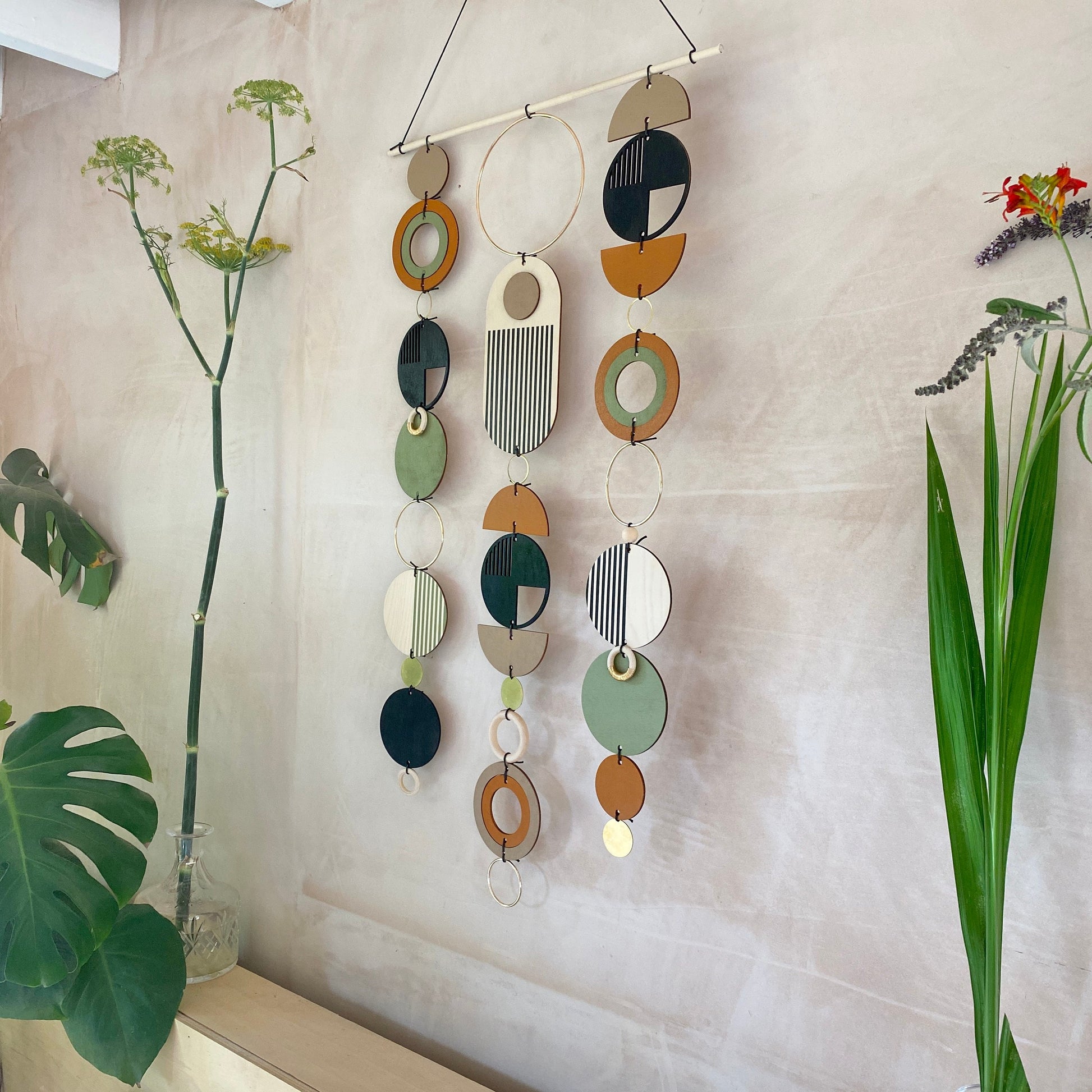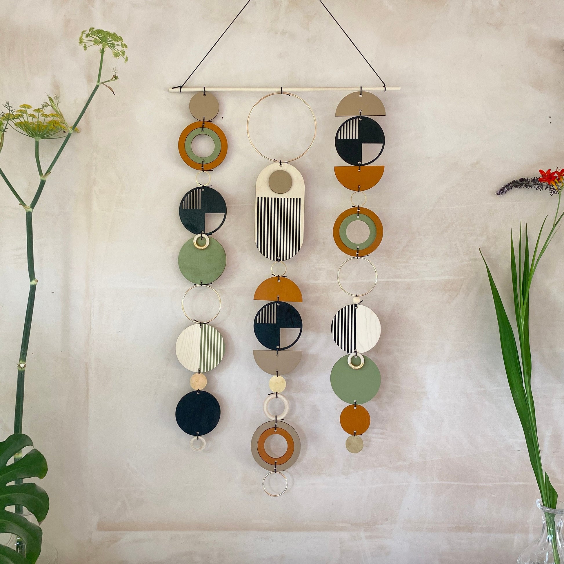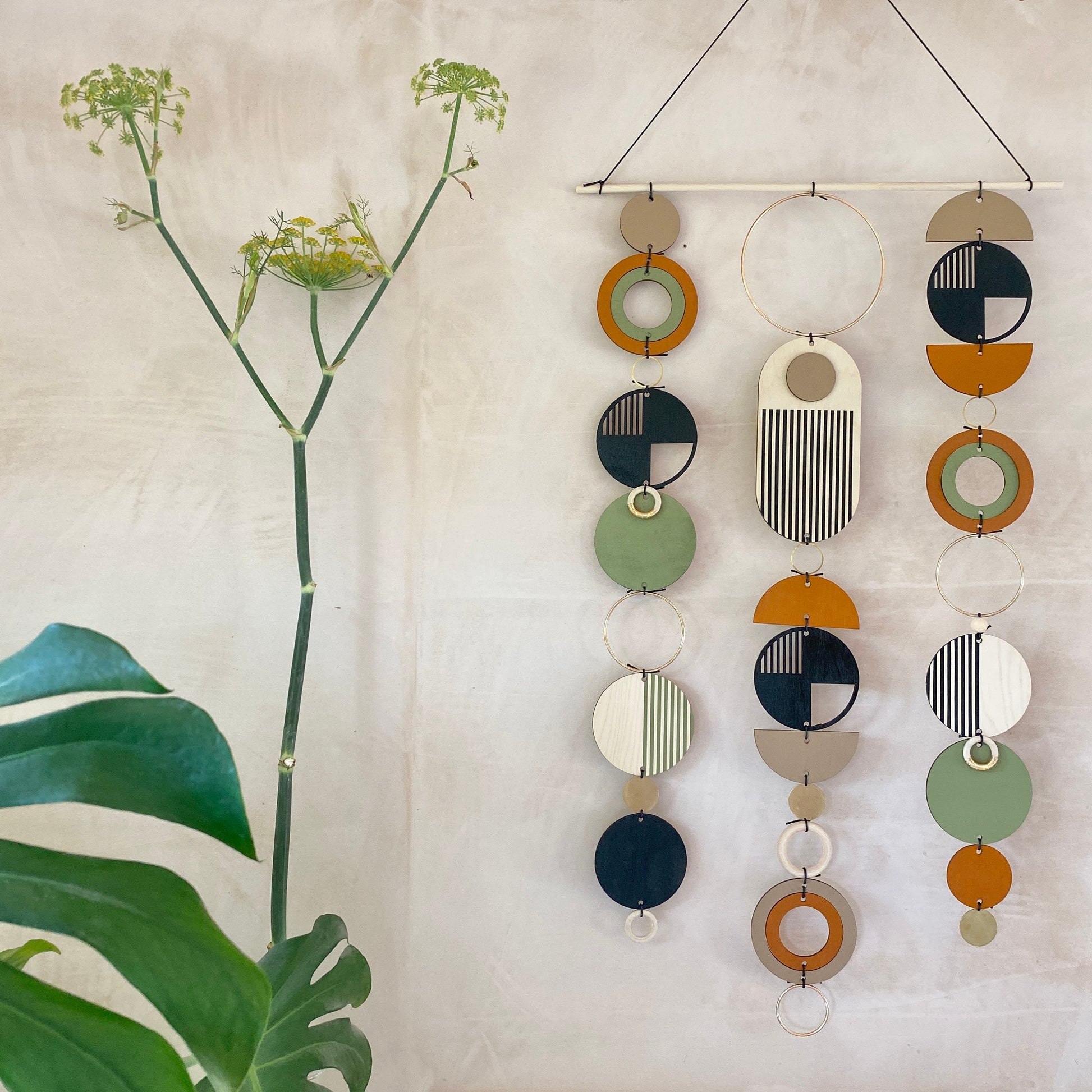 Lovingly handmade modern wall art. This Piece is made from plywood, paint, metal, waxed cord and wooden beads. The colours used are a burnt orange, olive green, black, beige and gold. This modern wall hanging would make a beautiful addition to any room to create a modern mid-century feel. Made from sustainable Birch plywood, hand painted and constructed in Milton Keynes, England.