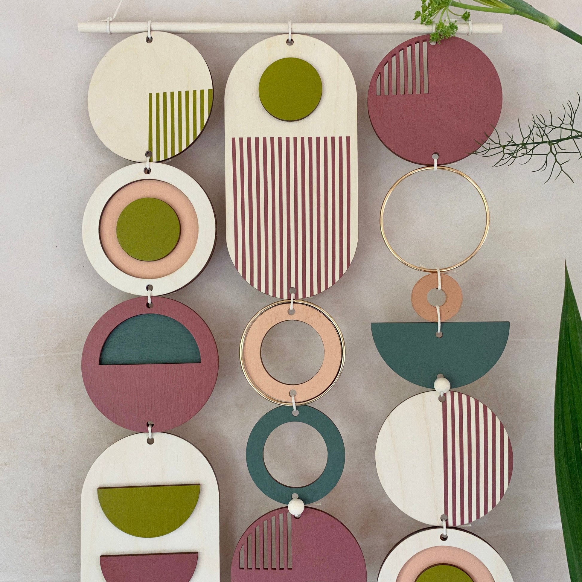 Gold coloured metal hoop detailing and laser cut pieces make this one of my hybrid pieces (using parts from all of my wall hangings).