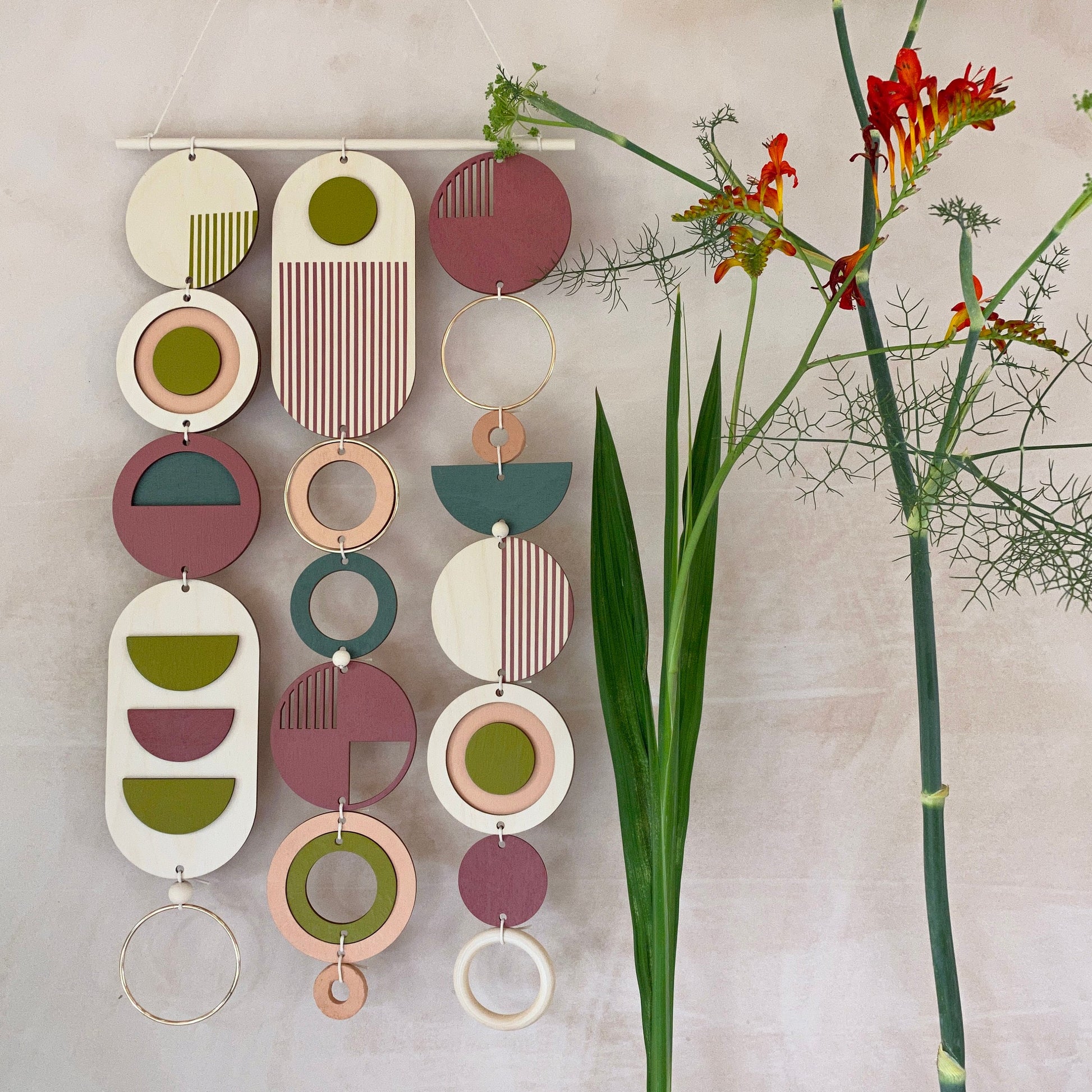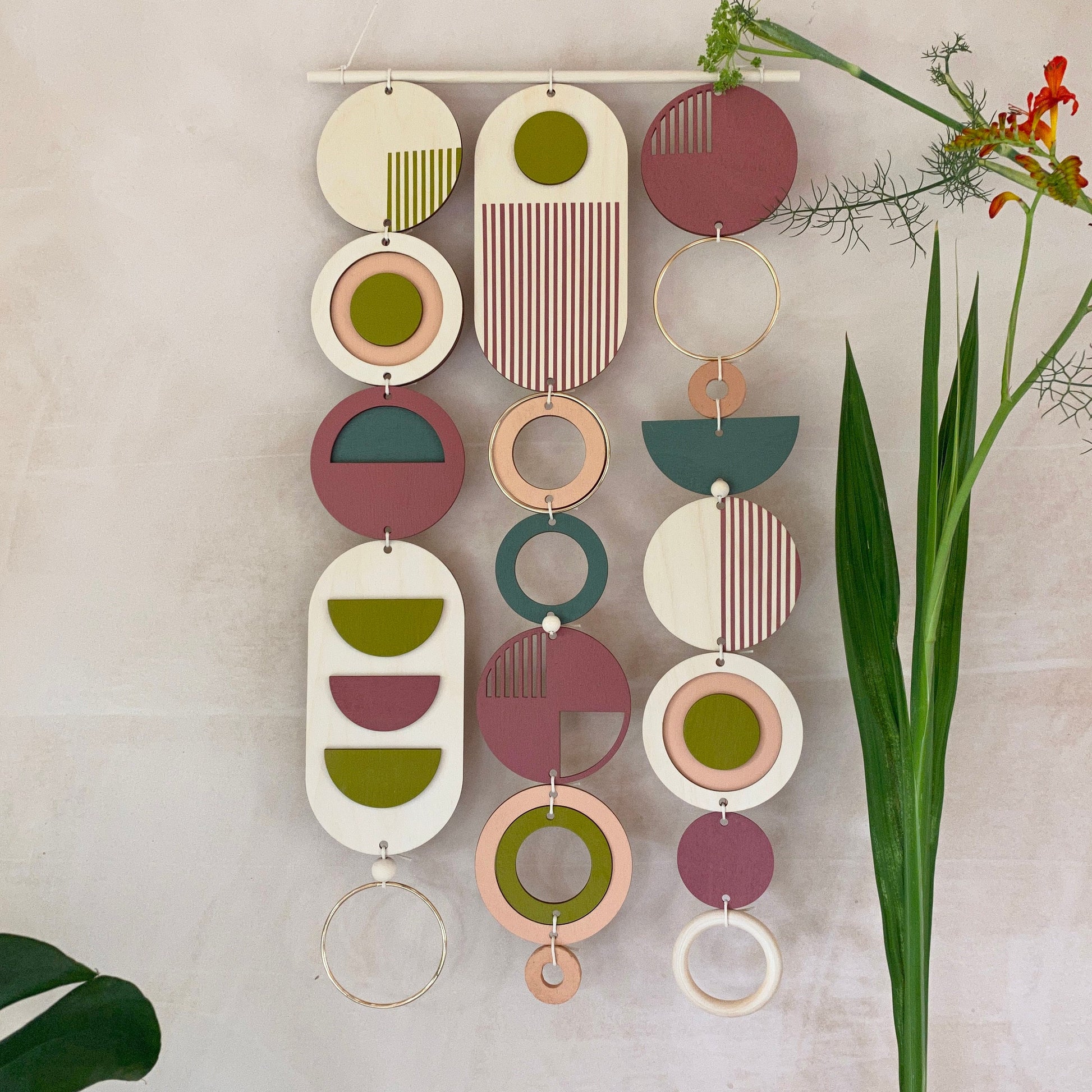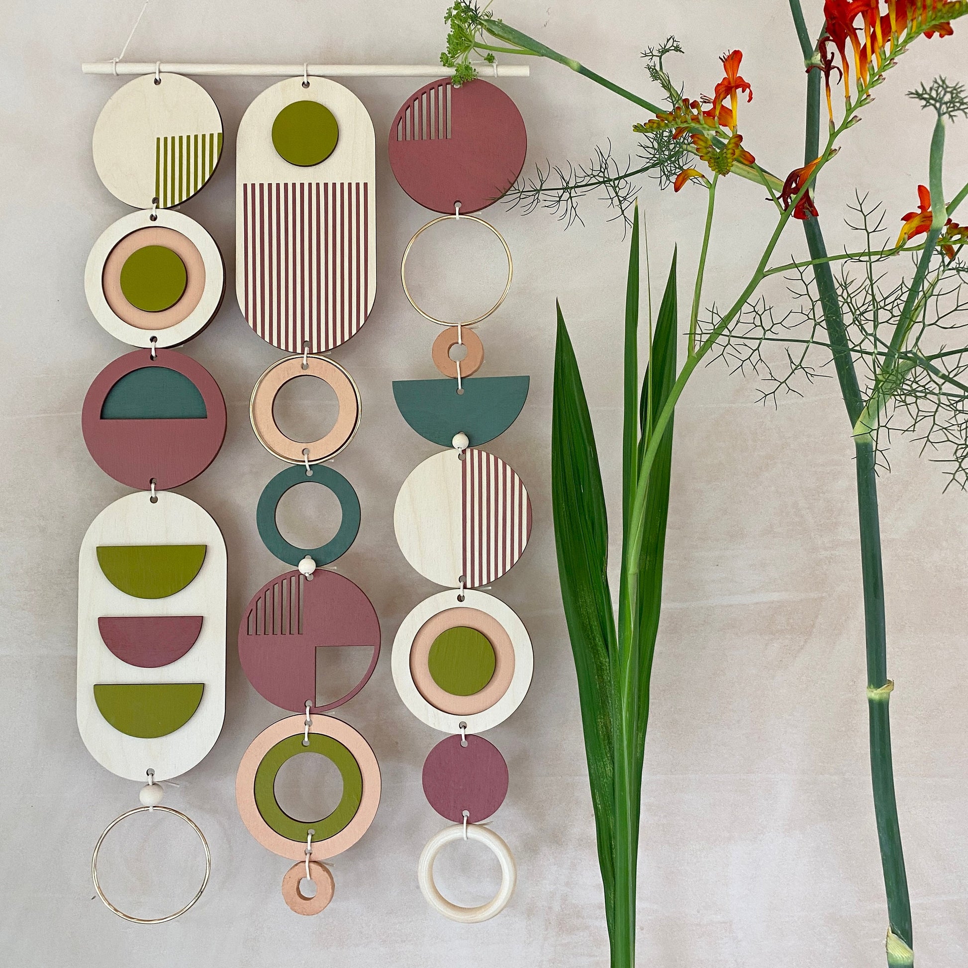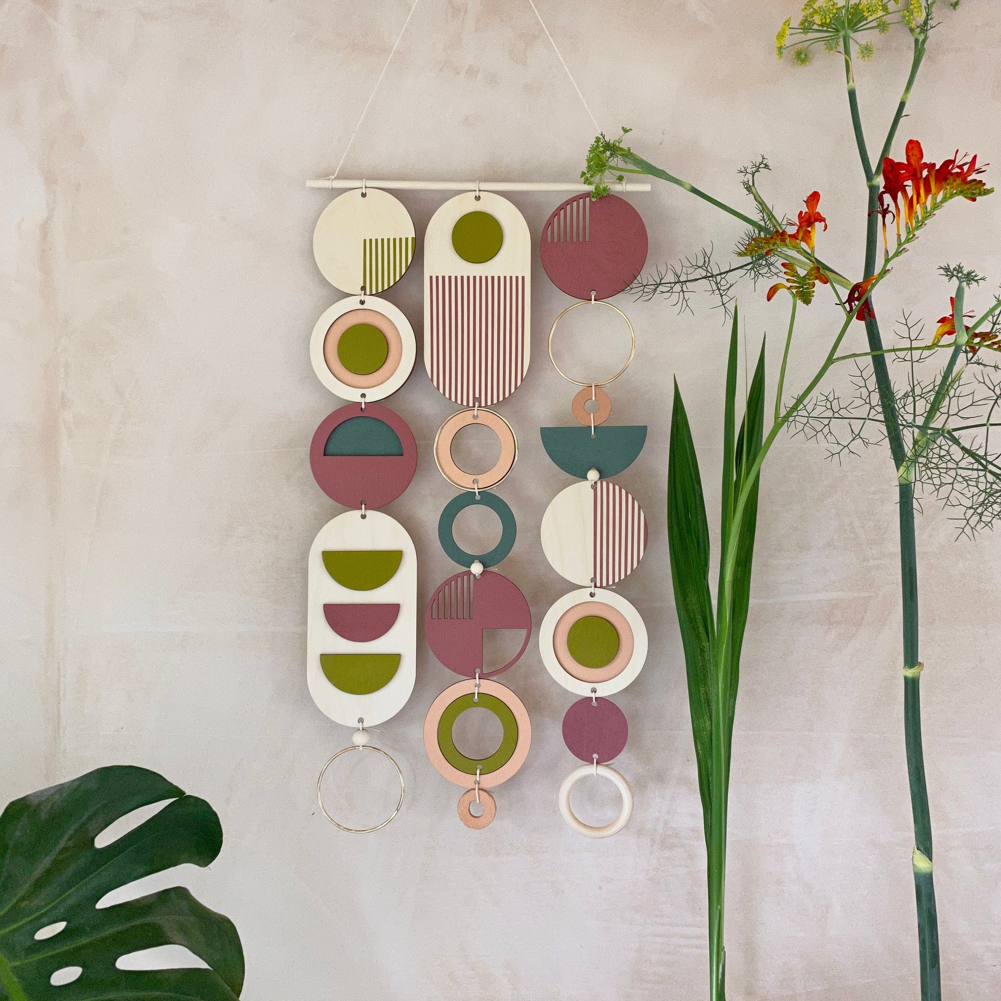 This slim wall hanging would make a beautiful addition to any room to create a modern mid-century feel. Made from sustainable Birch plywood, hand painted and constructed in Milton Keynes, England.