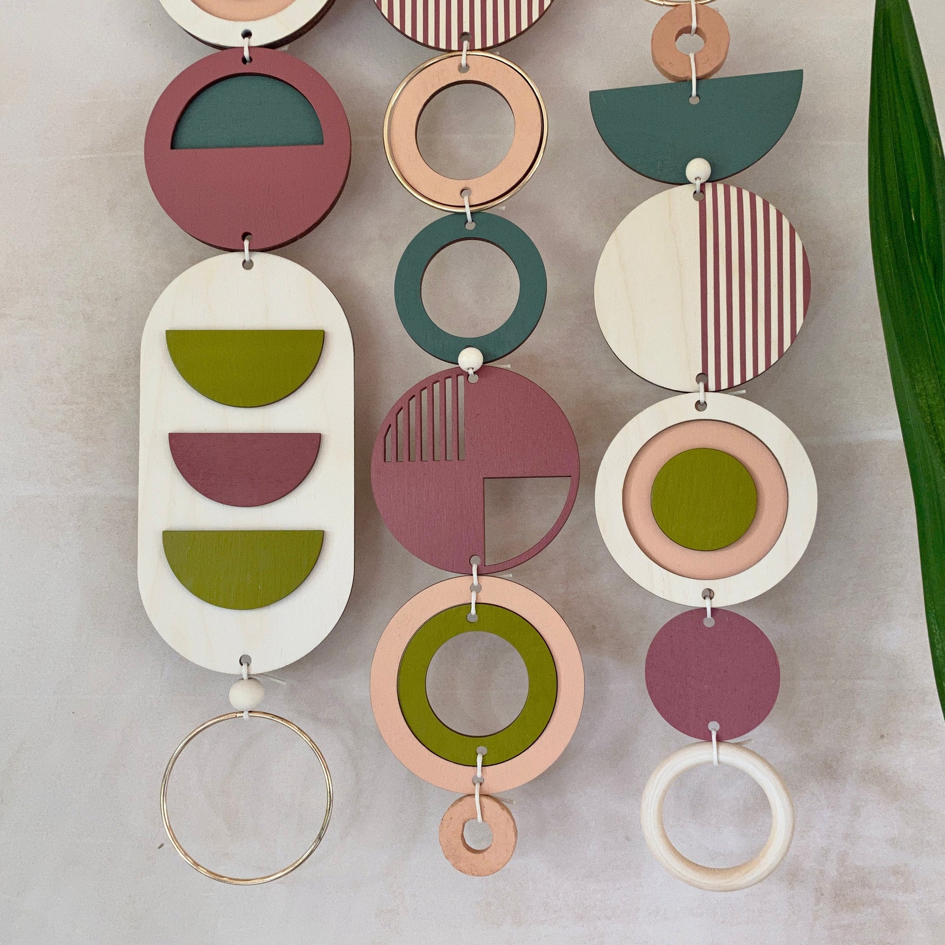 Lovingly handmade modern wall art. This Piece is made from plywood, paint, metal, ceramics, waxed cord and wooden beads.