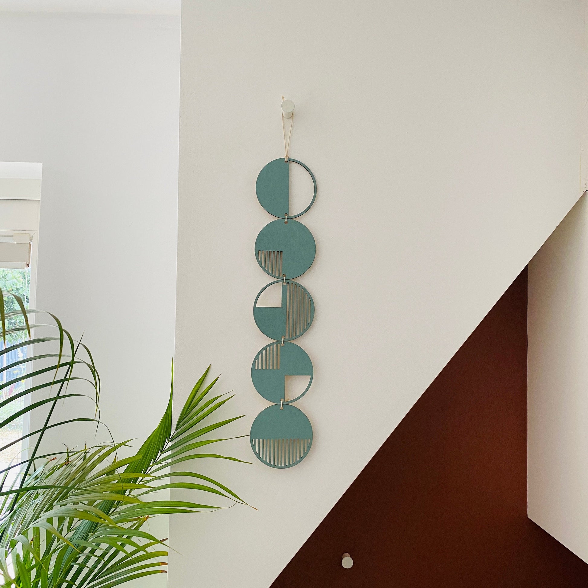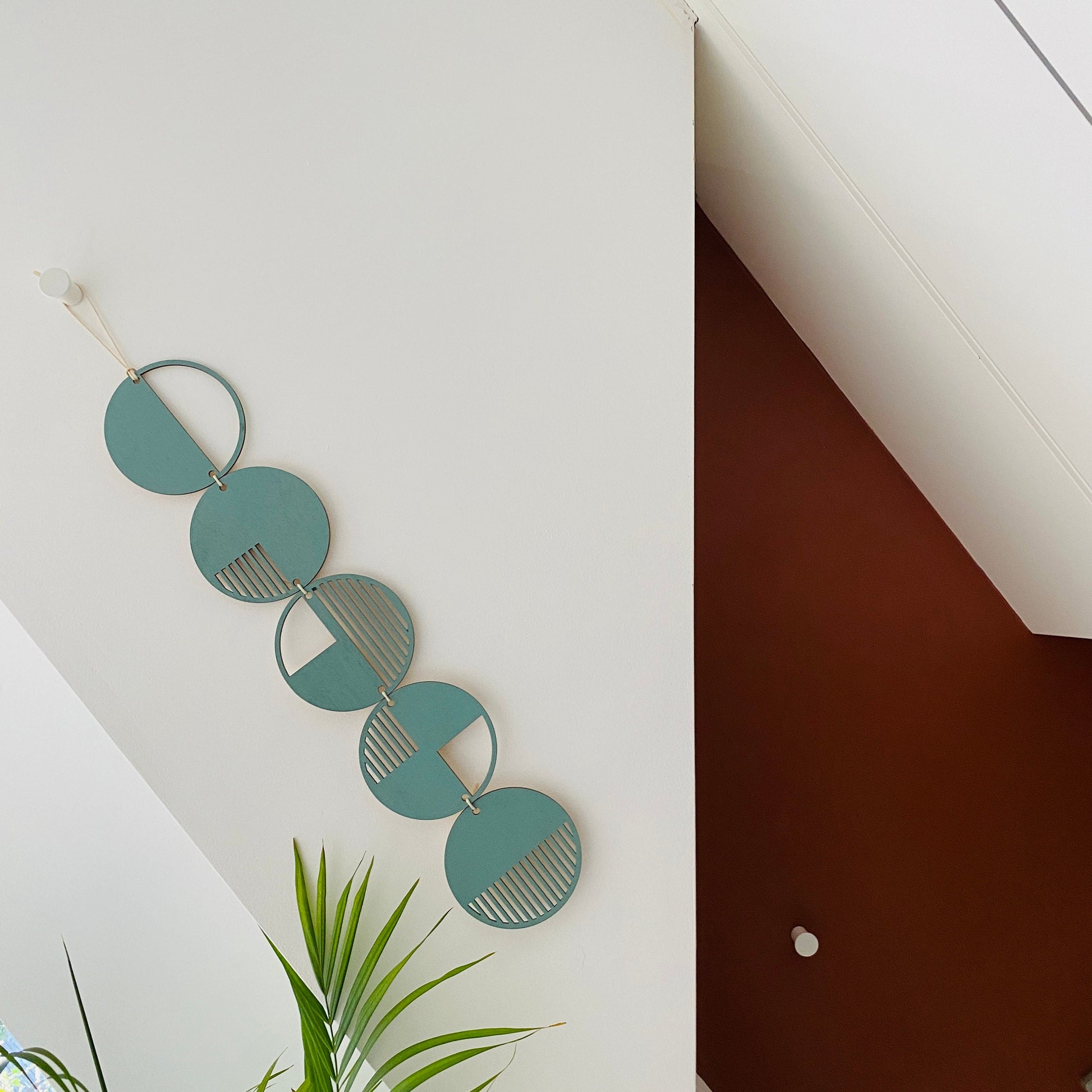 Lovingly handmade 5 tier hanger. This Modern style Eucalyptus Green colour wall hanging would make a beautiful addition to any room to create a modern contemporary feel. Made from laser cut Birch Plywood and painted in Milton Keynes by myself.
