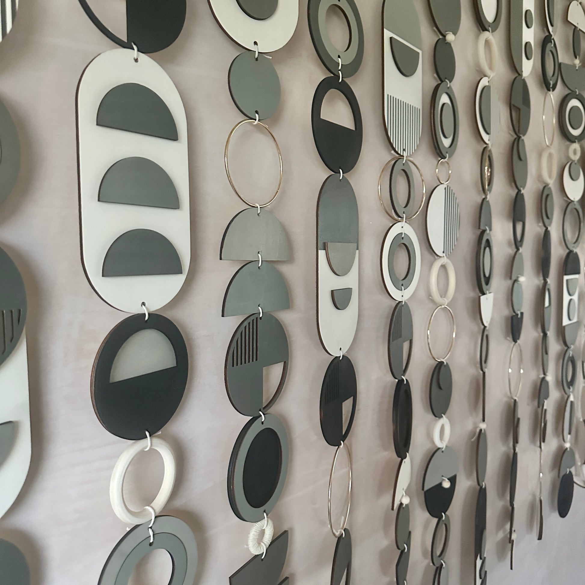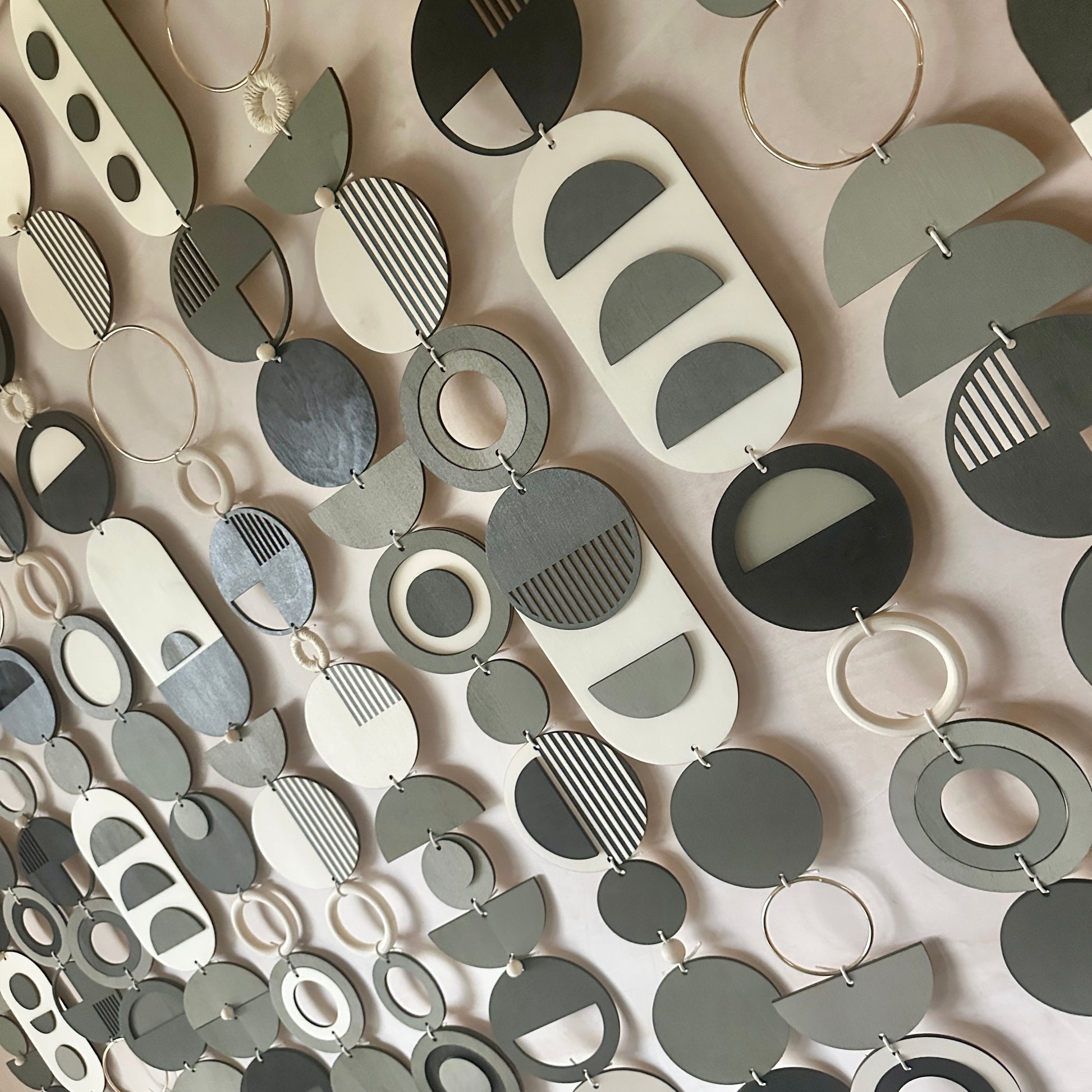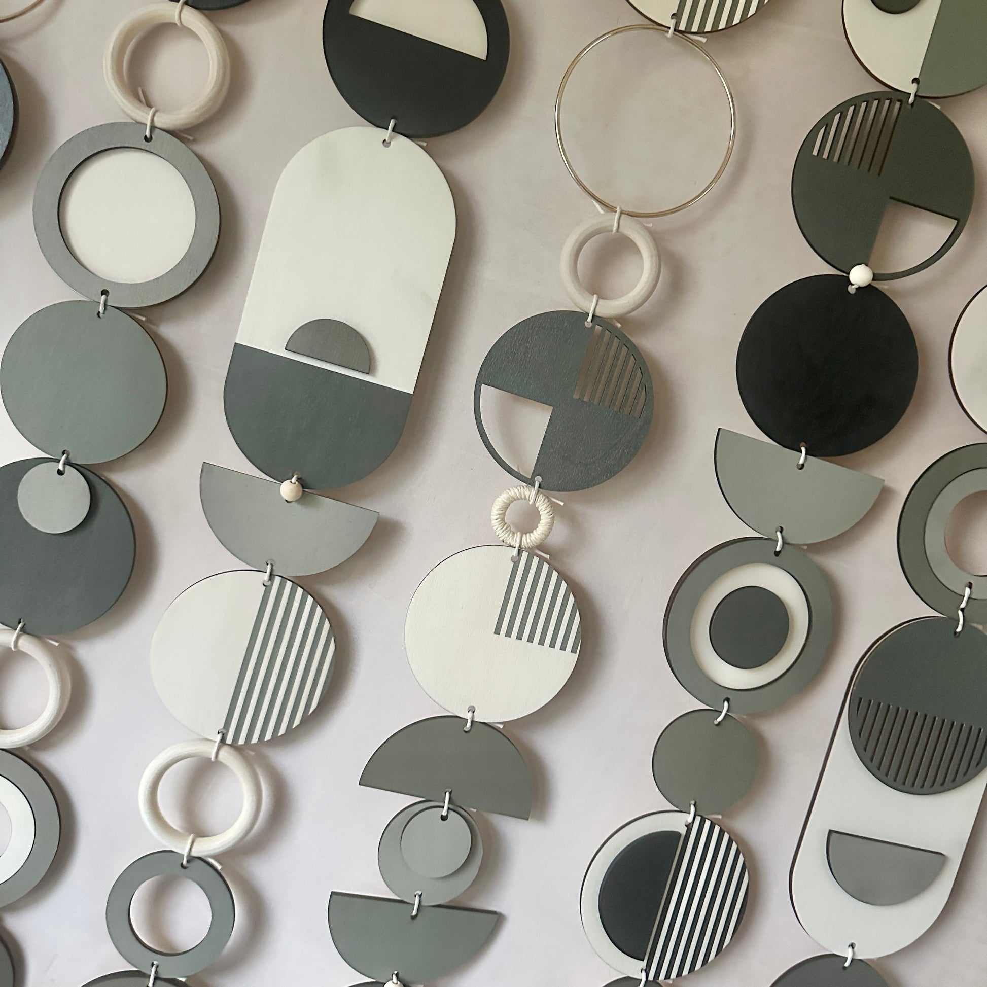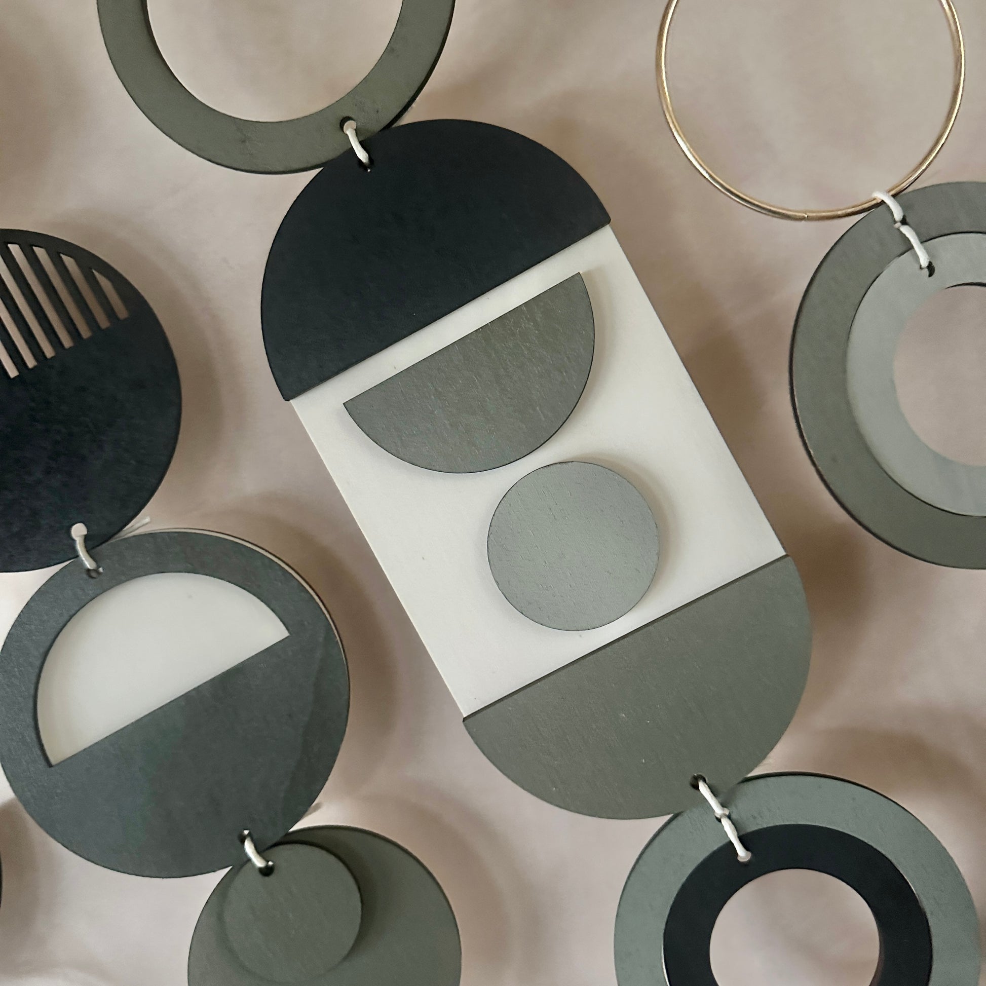 - Each plywood piece is painted in a dark colour palette of greys and blacks. Some pieces are left unpainted to let the natural colour of the wood show.