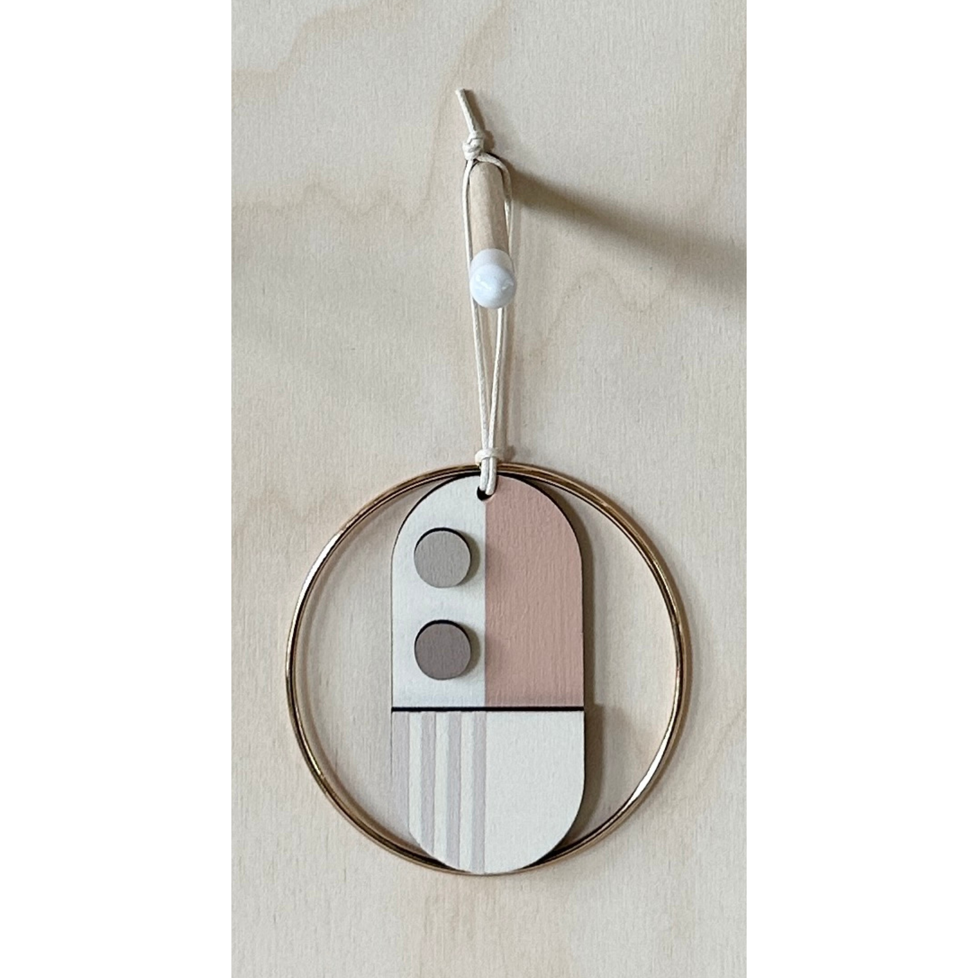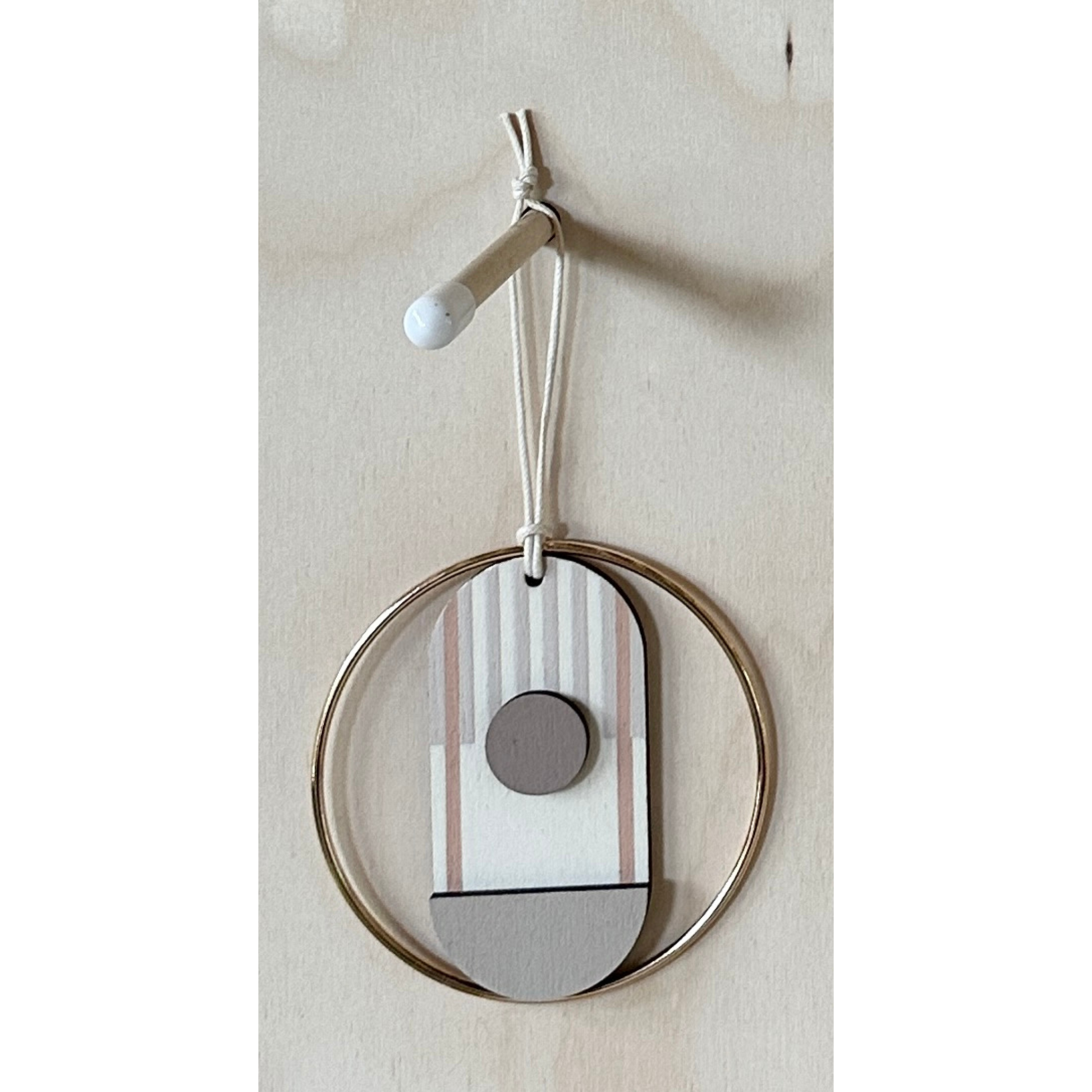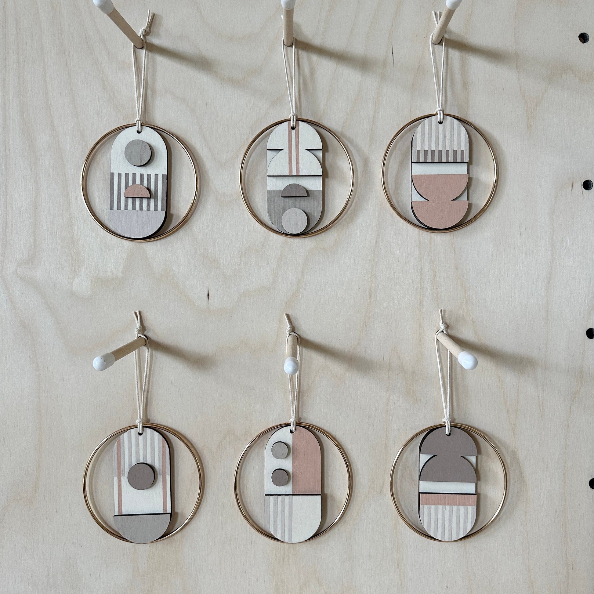 Lovingly handmade modern mini wall art. These decorations are made from plywood, paint, metal and waxed cord. The colours used are natural tones with a light pink and gold. This mini wall hanging would make a beautiful addition to any room to create a modern mid-century feel. Made from sustainable plywood, hand painted and constructed in Milton Keynes, England.