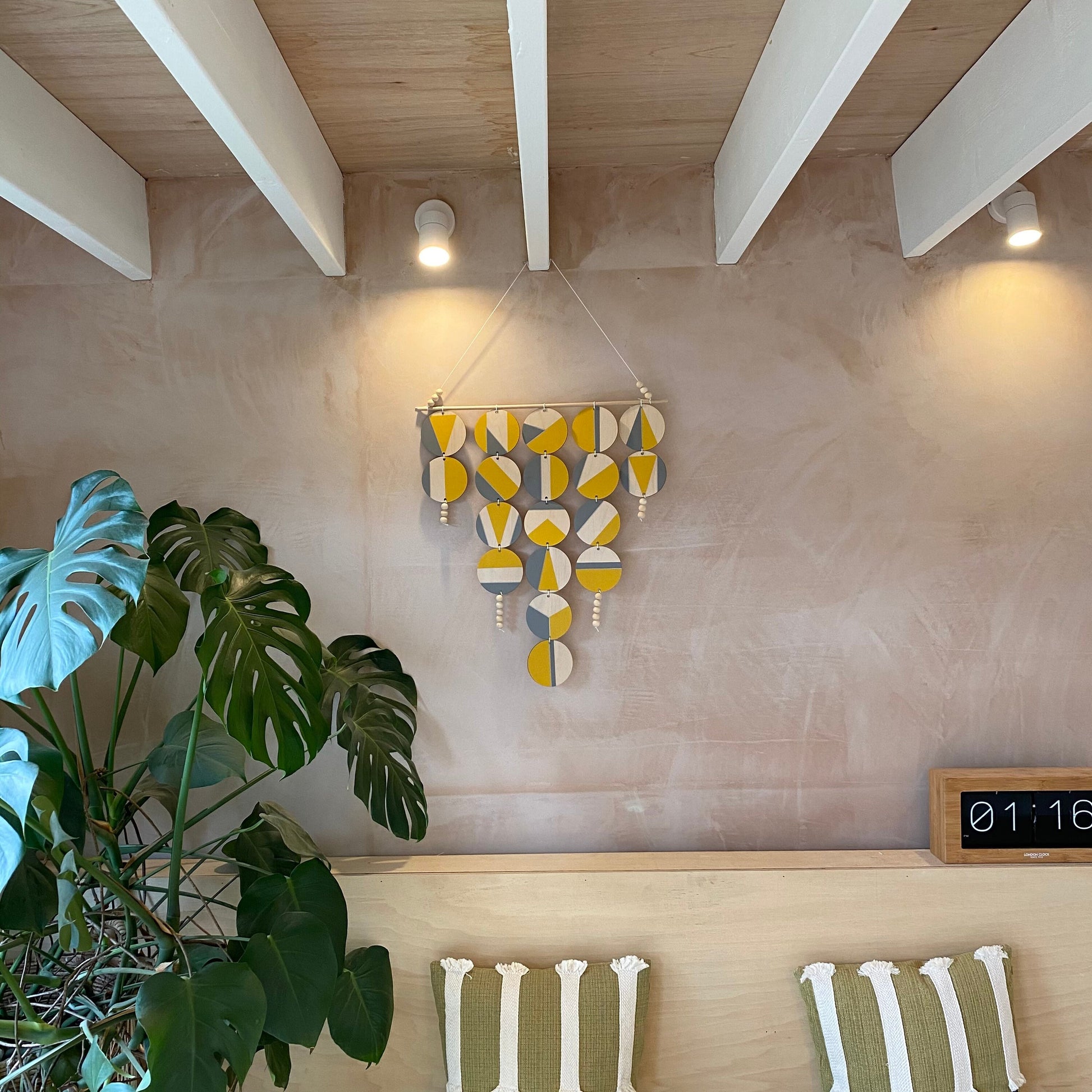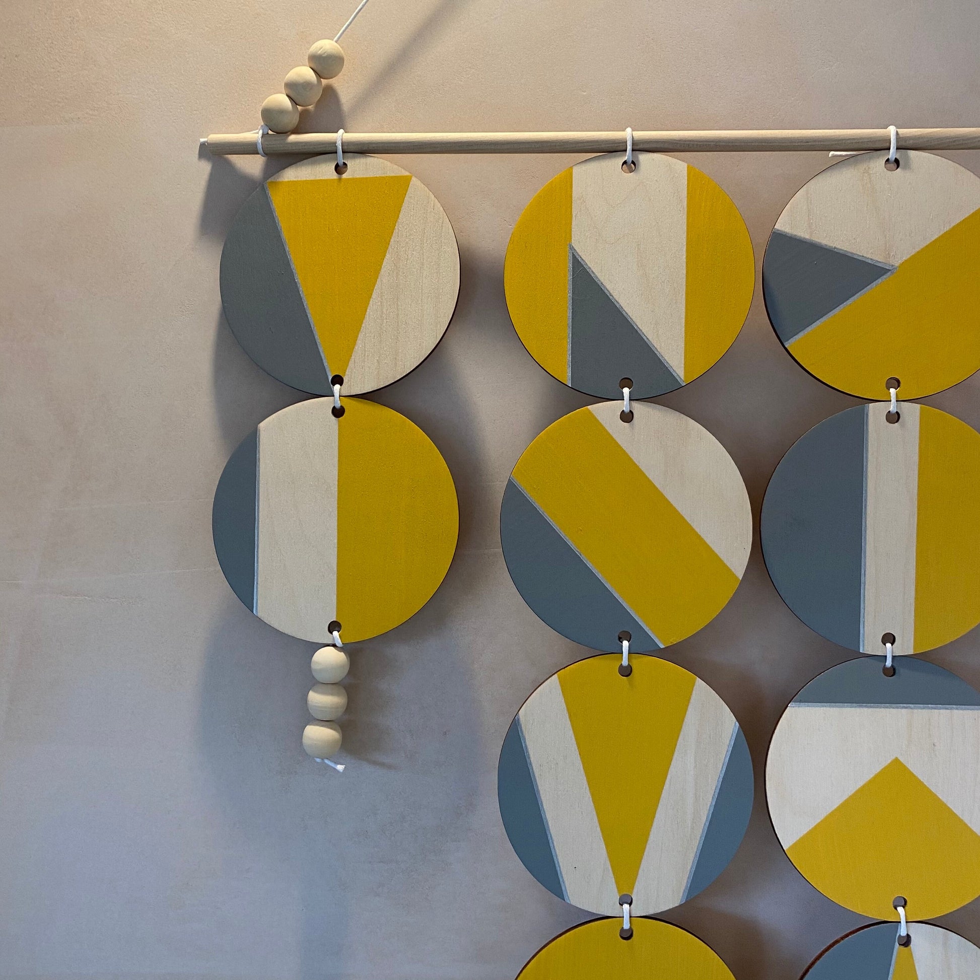 Lovingly handmade 18 disc hanger. This Ochre Yellow and Grey plywood wall hanging would make a beautiful addition to any room to create a modern stylish feel. Made from sustainable plywood, hand painted and constructed in Milton Keynes, England.