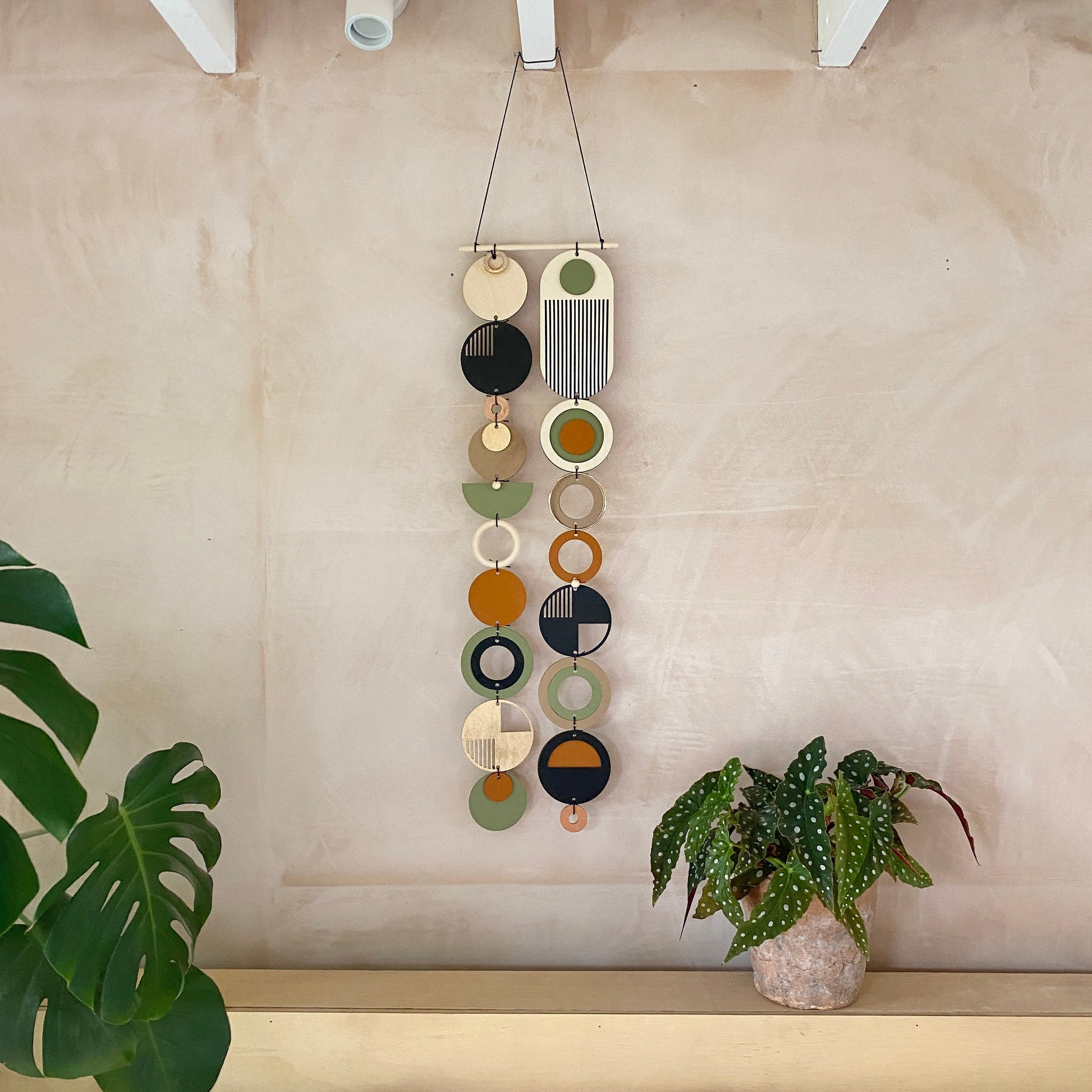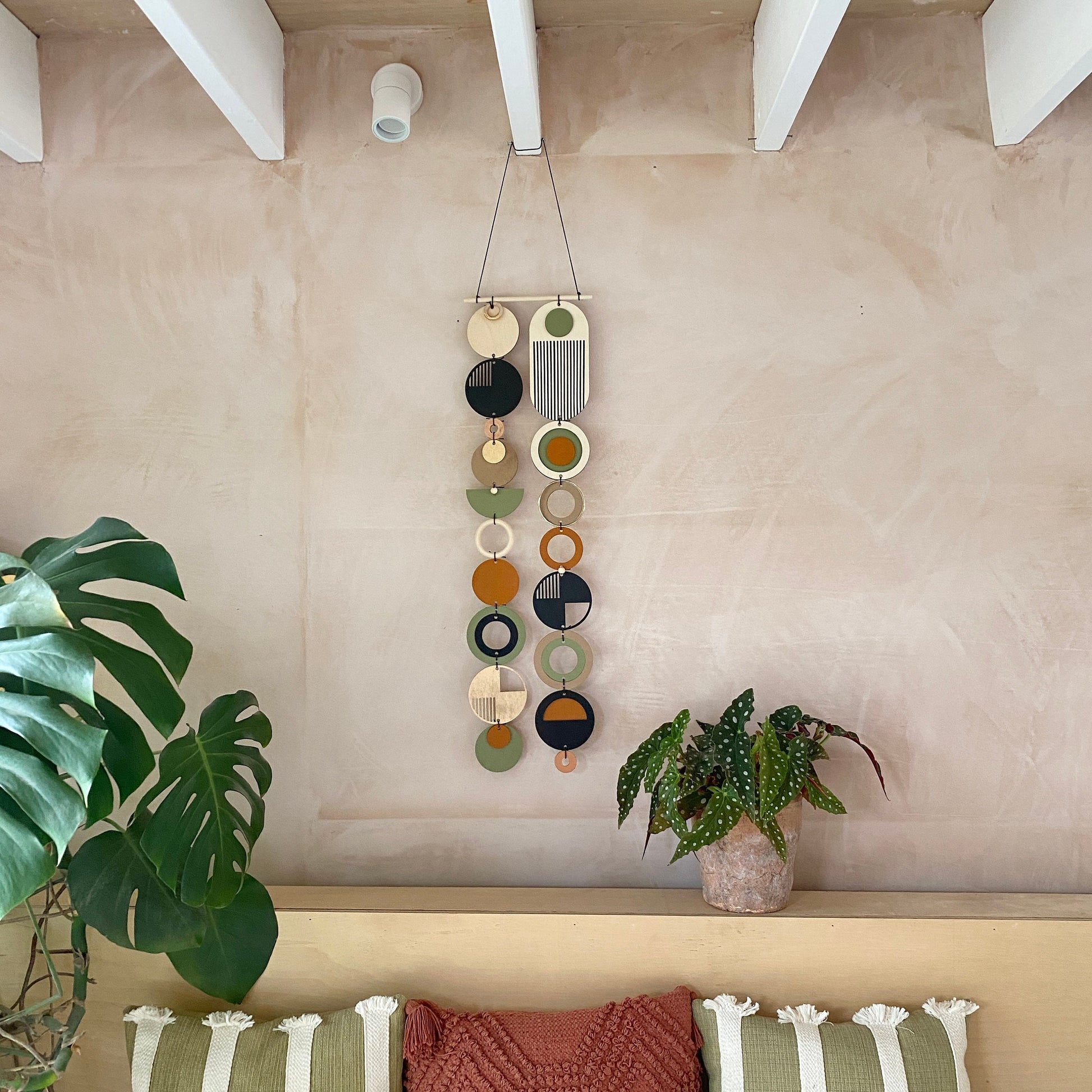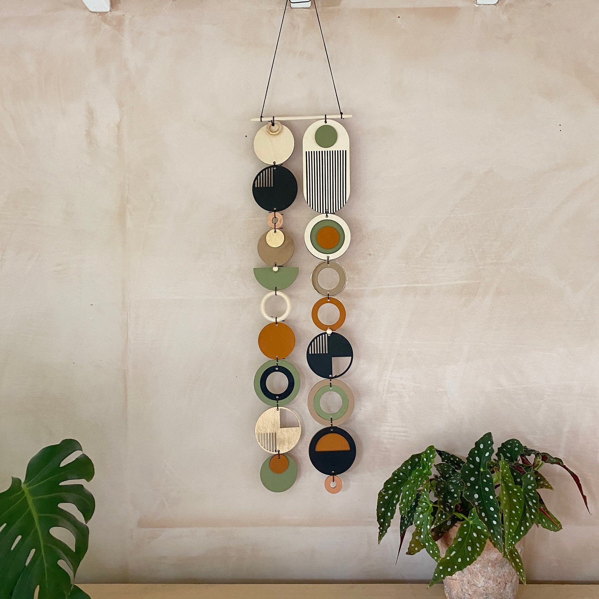Lovingly handmade modern wall art. This Piece is made from plywood, paint, metal, ceramics, waxed cord and wooden beads. The colours used are a burnt orange, olive green, black, beige and gold. This slim wall hanging would make a beautiful addition to any room to create a modern mid-century feel. Made from sustainable Birch plywood, hand painted and constructed in Milton Keynes, England.