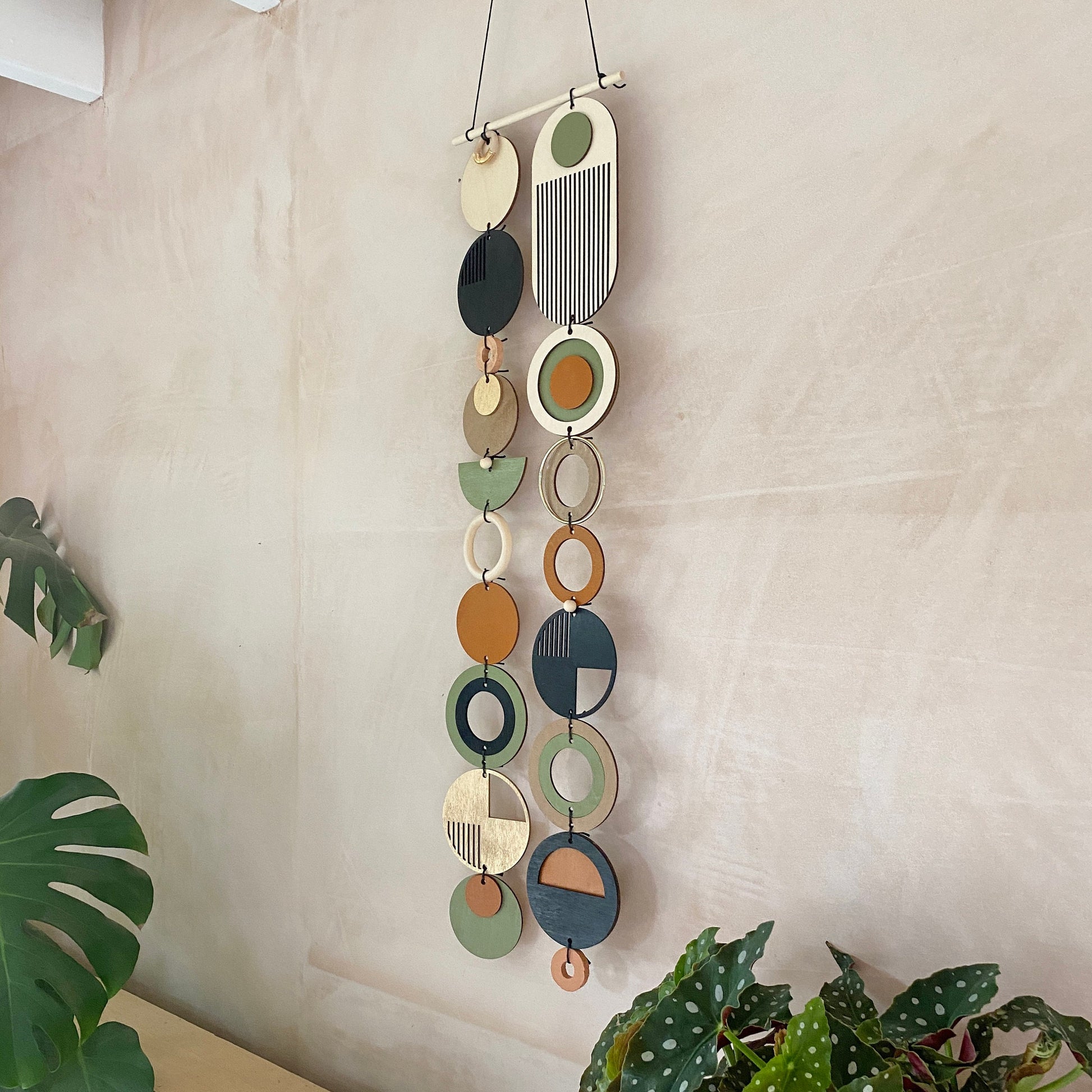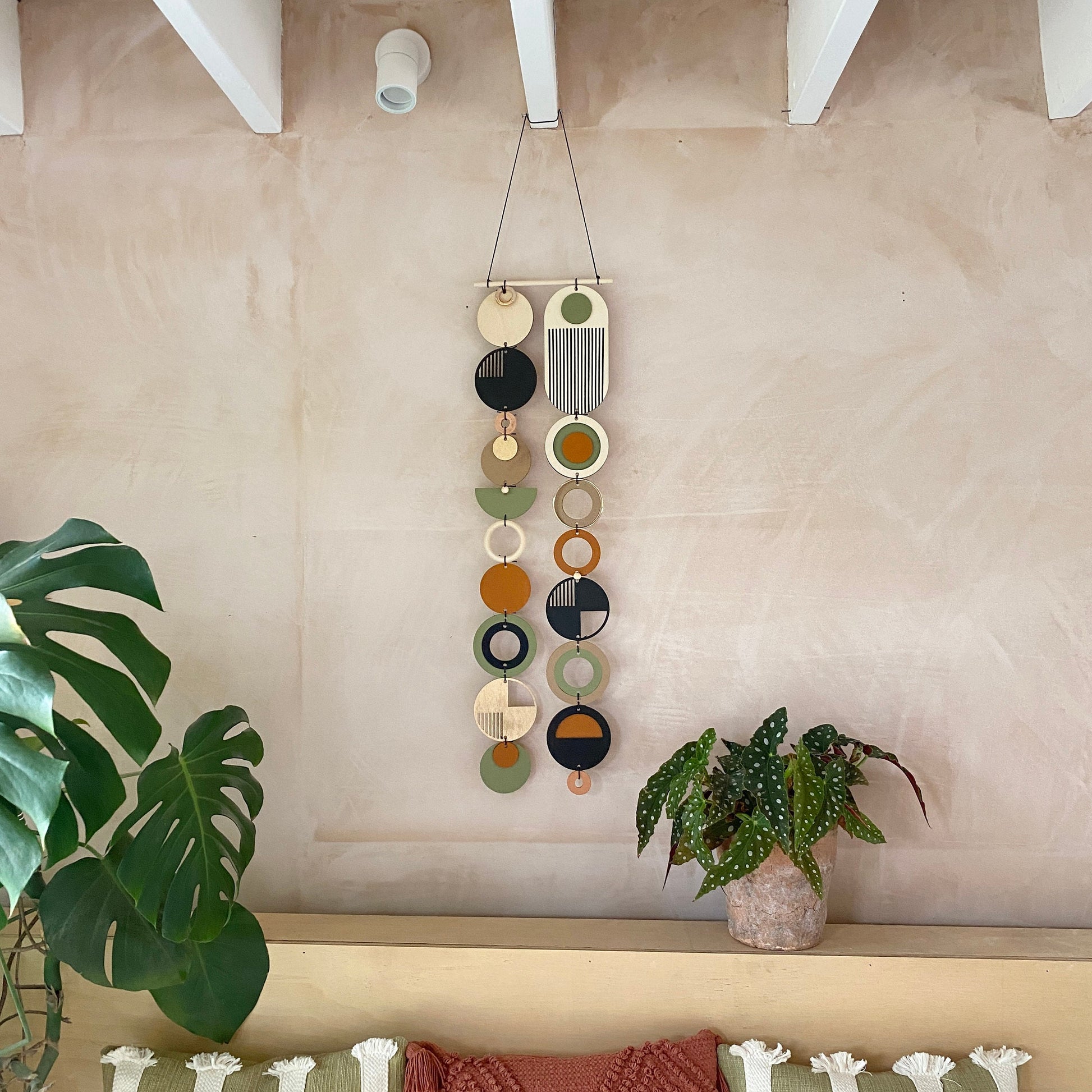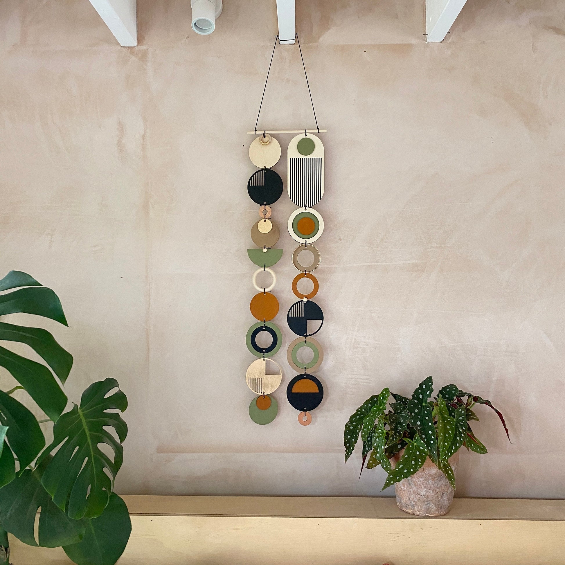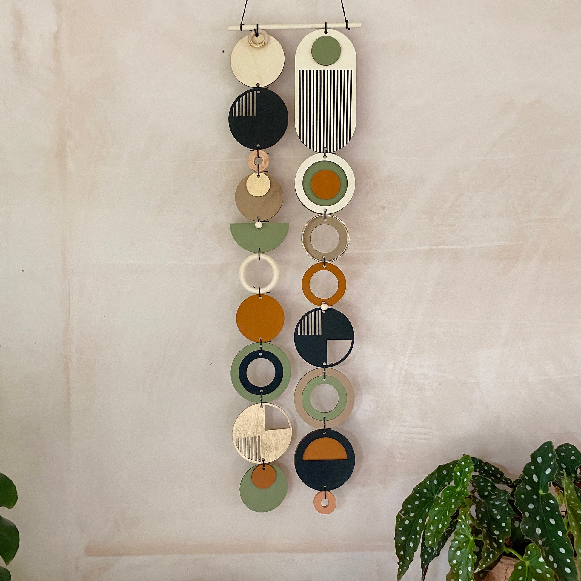 Lovingly handmade modern wall art. This Piece is made from plywood, paint, metal, ceramics, waxed cord and wooden beads. The colours used are a burnt orange, olive green, black, beige and gold. This slim wall hanging would make a beautiful addition to any room to create a modern mid-century feel. Made from sustainable Birch plywood, hand painted and constructed in Milton Keynes, England.
