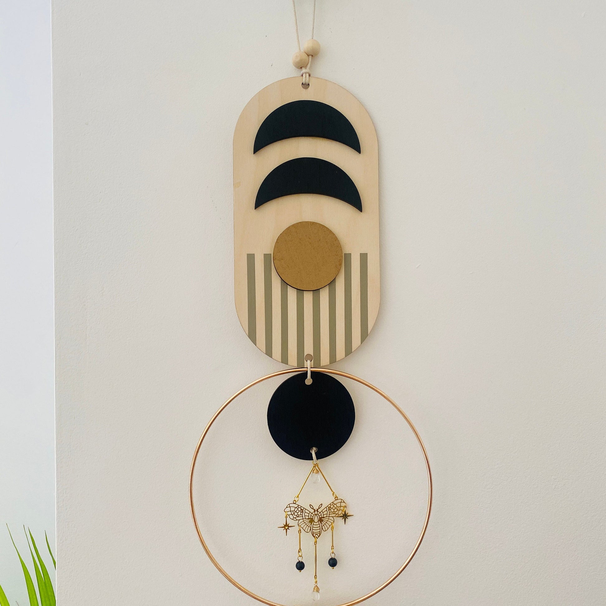 Gold coloured metal hoop detailing and laser cut pieces make this one of my hybrid pieces (using parts from all of my wall hangings).