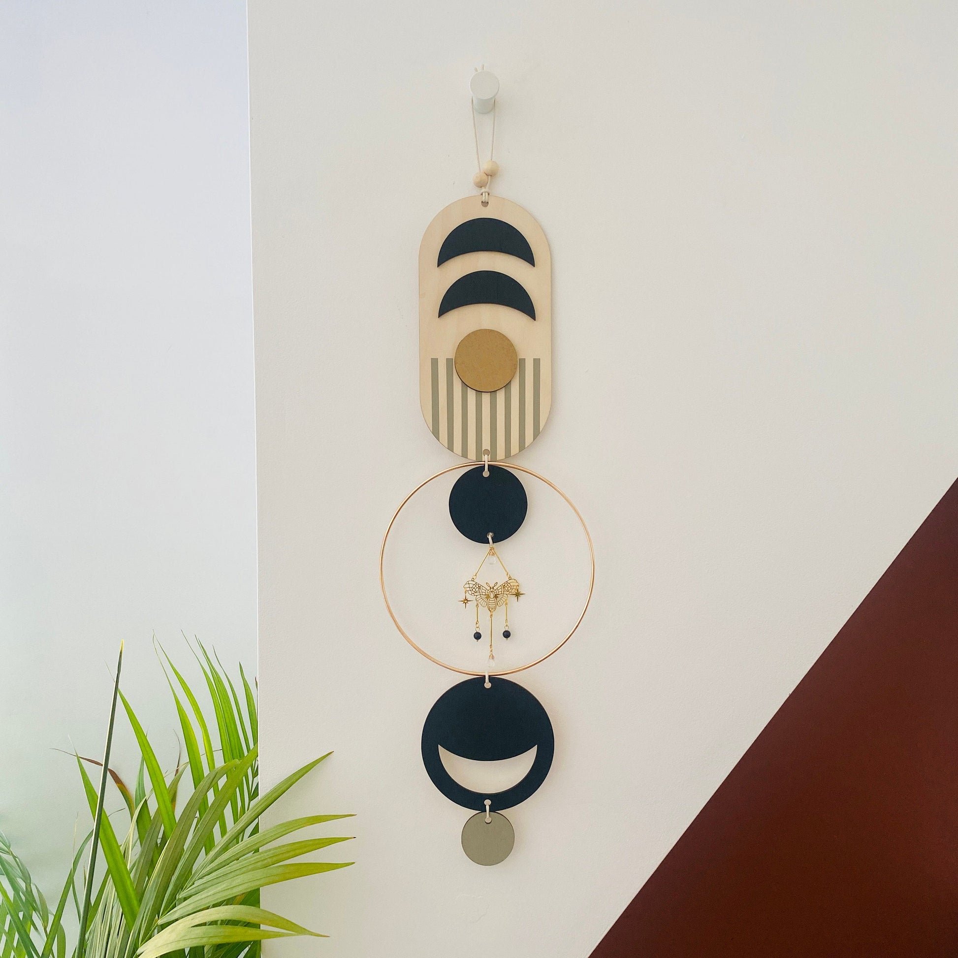 Lovingly handmade modern wall art. This Piece is made from plywood, paint, metal, waxed cord and wooden beads. The colours used are a Taupe, Grey Green, Black and Gold. This slim wall hanging would make a beautiful addition to any room to create an eye catching display. Made from sustainable Birch plywood, hand painted and constructed in Milton Keynes, England.