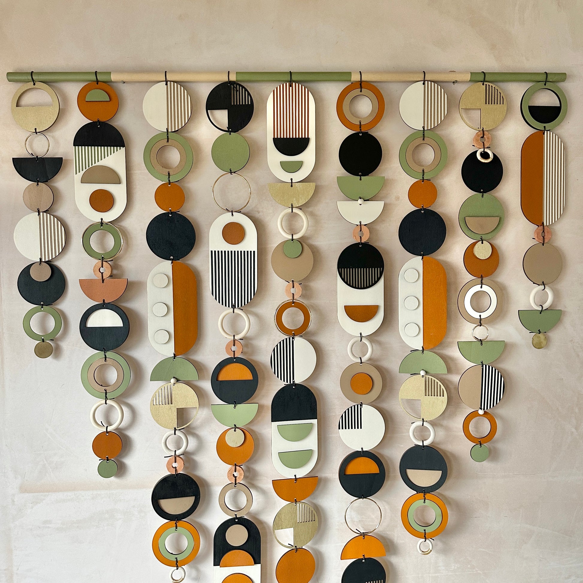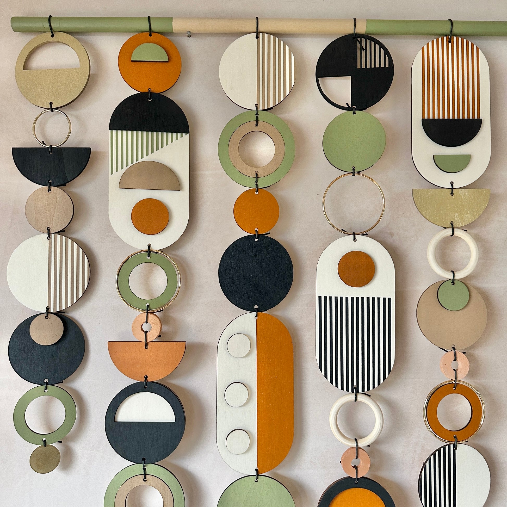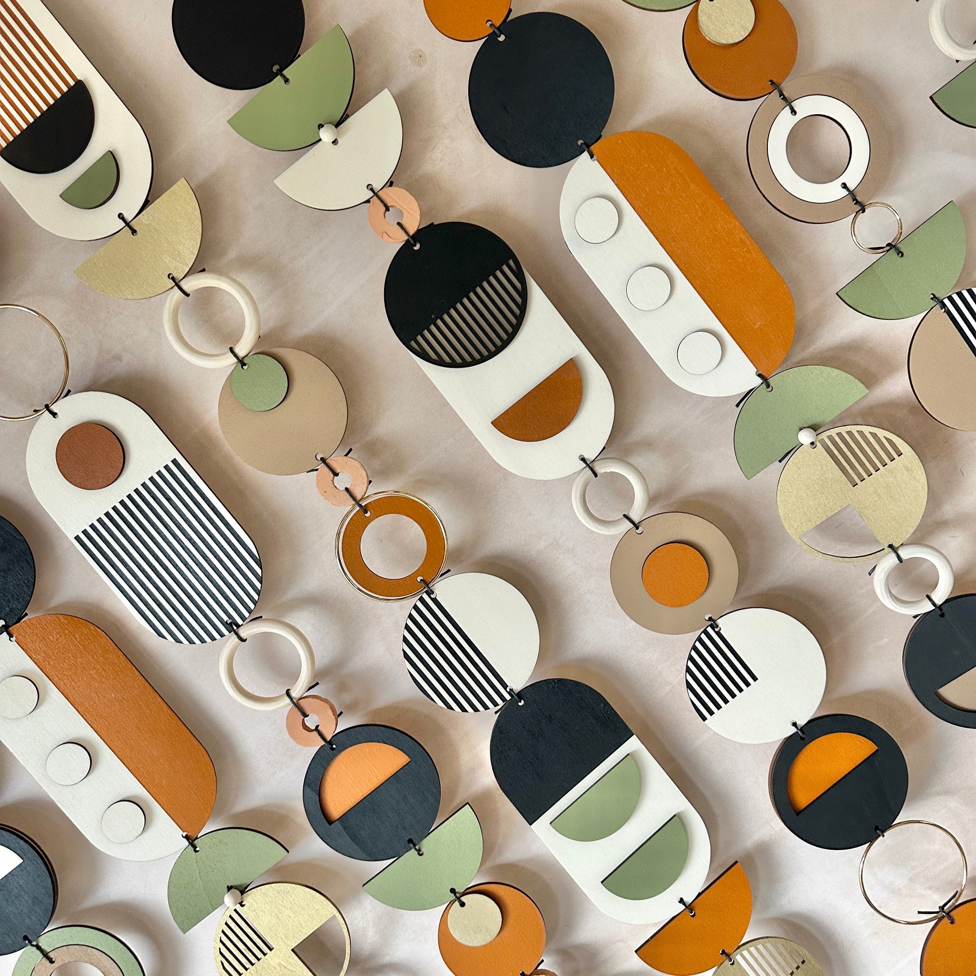- Each plywood piece is painted in a carefully curated mid century colour palette of green, orange, black, beige and gold. Some pieces are left unpainted to let the natural colour of the wood show.