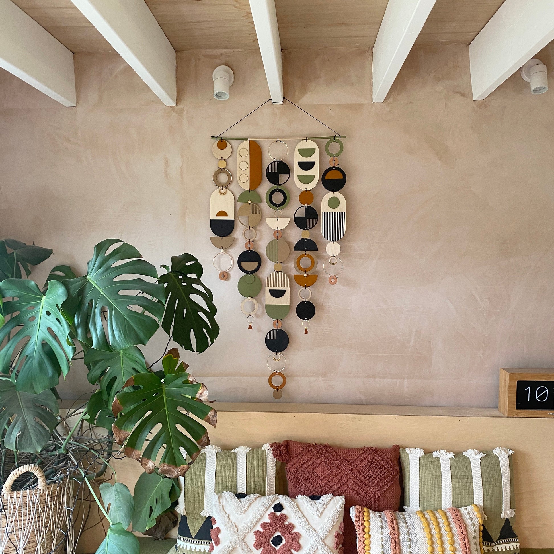Lovingly handmade modern wall art. This Piece is made from plywood, paint, metal, ceramics, waxed cord, tassels and wooden beads. The colours used are a burnt orange, olive green, earthy beige, black and gold. This large wall hanging would make a beautiful addition to any room to create a modern mid-century feel. Made from sustainable Birch plywood, hand painted and constructed in Milton Keynes, England.
