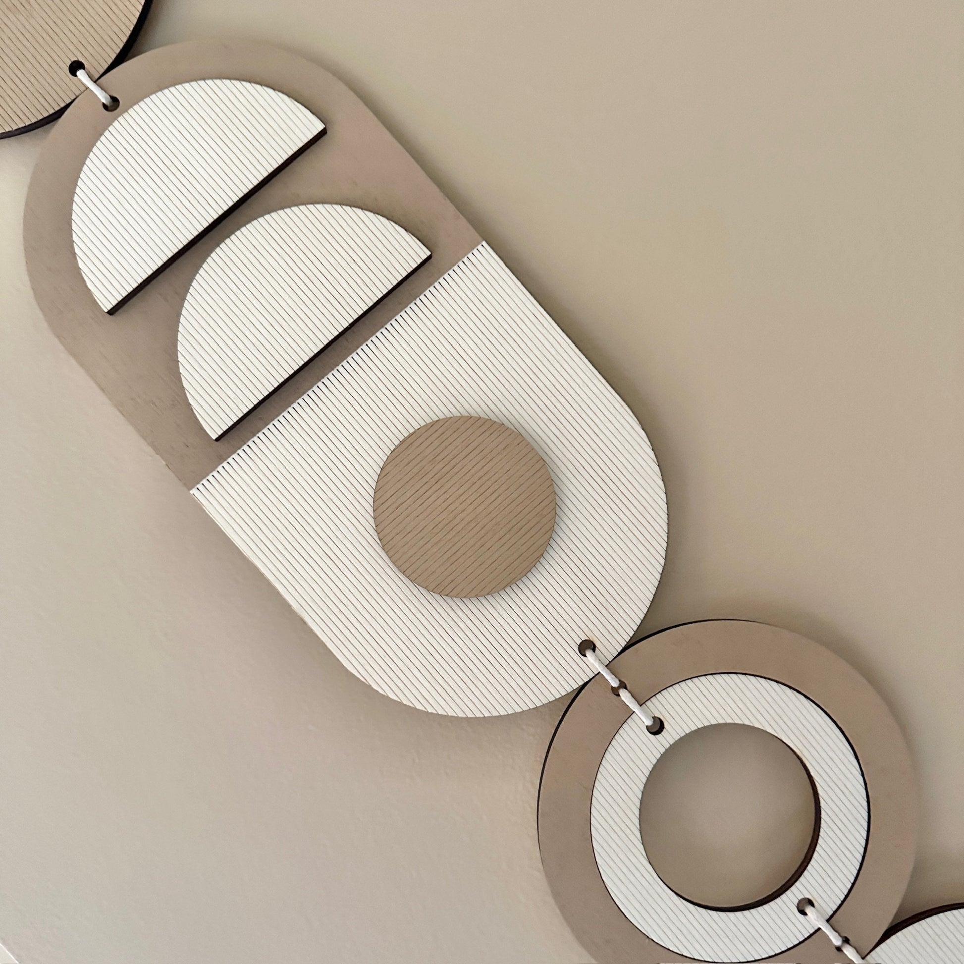 Lovingly handmade modern wall art. New etched design! This piece is made from plywood, paint and waxed cord. This wall hanging is painted in a neutral colour with unpainted areas to show the natural colour of the wood. This slim wall hanging would make a beautiful addition to any room to create a modern mid-century feel. Made from sustainable plywood, hand painted and constructed in Milton Keynes, England.