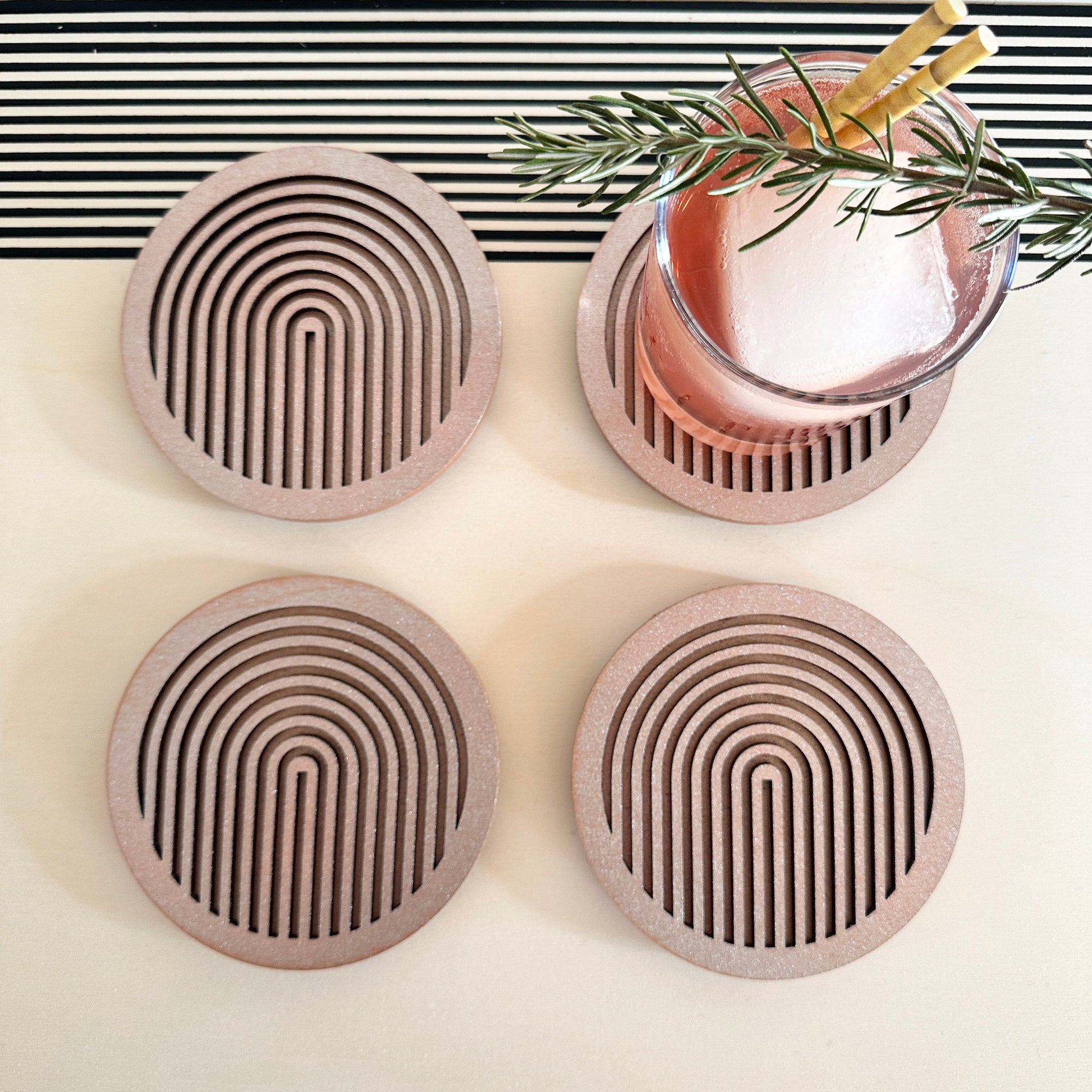 Introducing our set of 4 copper geometric coasters, perfect for protecting your furniture while adding a touch of modern style to any room. Each coaster is lovingly handmade in Milton Keynes, England from sustainable plywood and laser cut to create a unique and striking design.