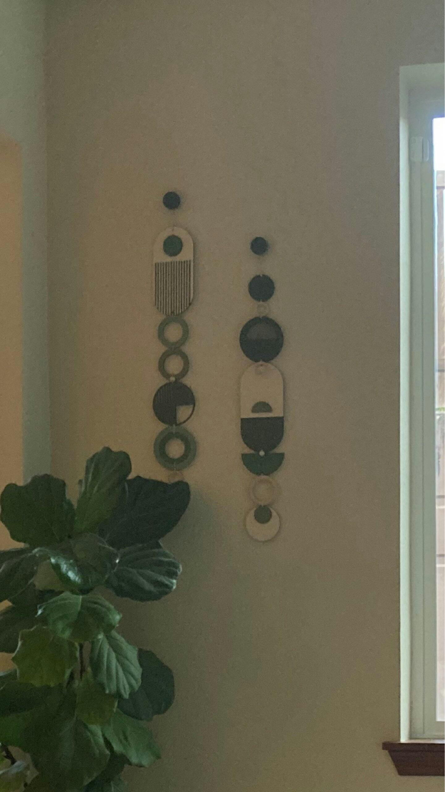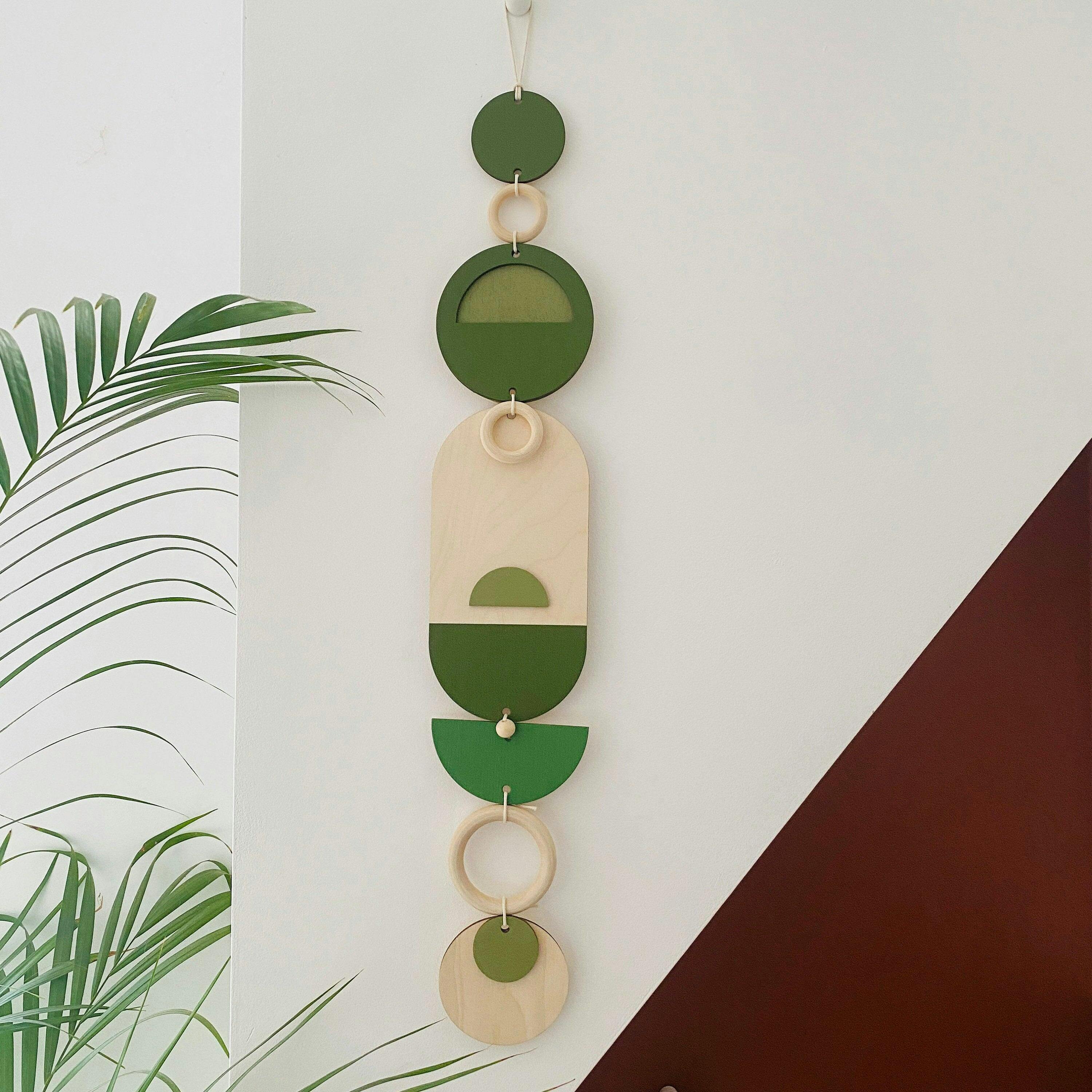 Lovingly handmade modern wall art. This Piece is made from plywood, paint, waxed cord and wooden beads. The colours used are green tones. This slim wall hanging would make a beautiful addition to any room to create a modern mid-century feel. Made from sustainable plywood, hand painted and constructed in Milton Keynes, England.