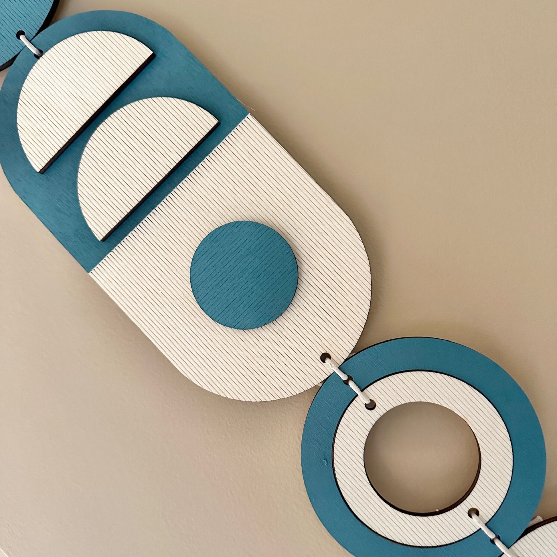 Lovingly handmade modern wall art. New etched design! This piece is made from plywood, paint and waxed cord. This wall hanging is painted in teal with unpainted areas to show the natural colour of the wood. This slim wall hanging would make a beautiful addition to any room to create a modern mid-century feel. Made from sustainable plywood, hand painted and constructed in Milton Keynes, England.