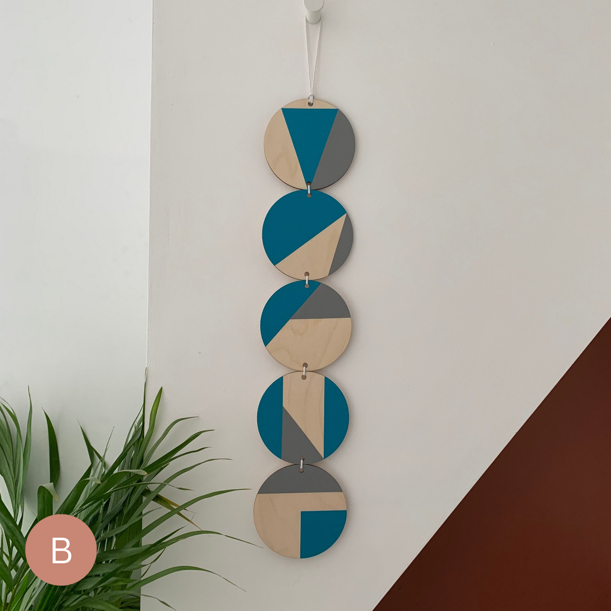 Choose your favorite style from A-E, including Ochre Yellow and Grey, Teal and Grey, Pink and Grey, Neon Pink and Neon Mint, or Dark Terracotta and Dusky Pink. For added flair, select one of our hand-painted engraved hooks to hang your new wall art from.