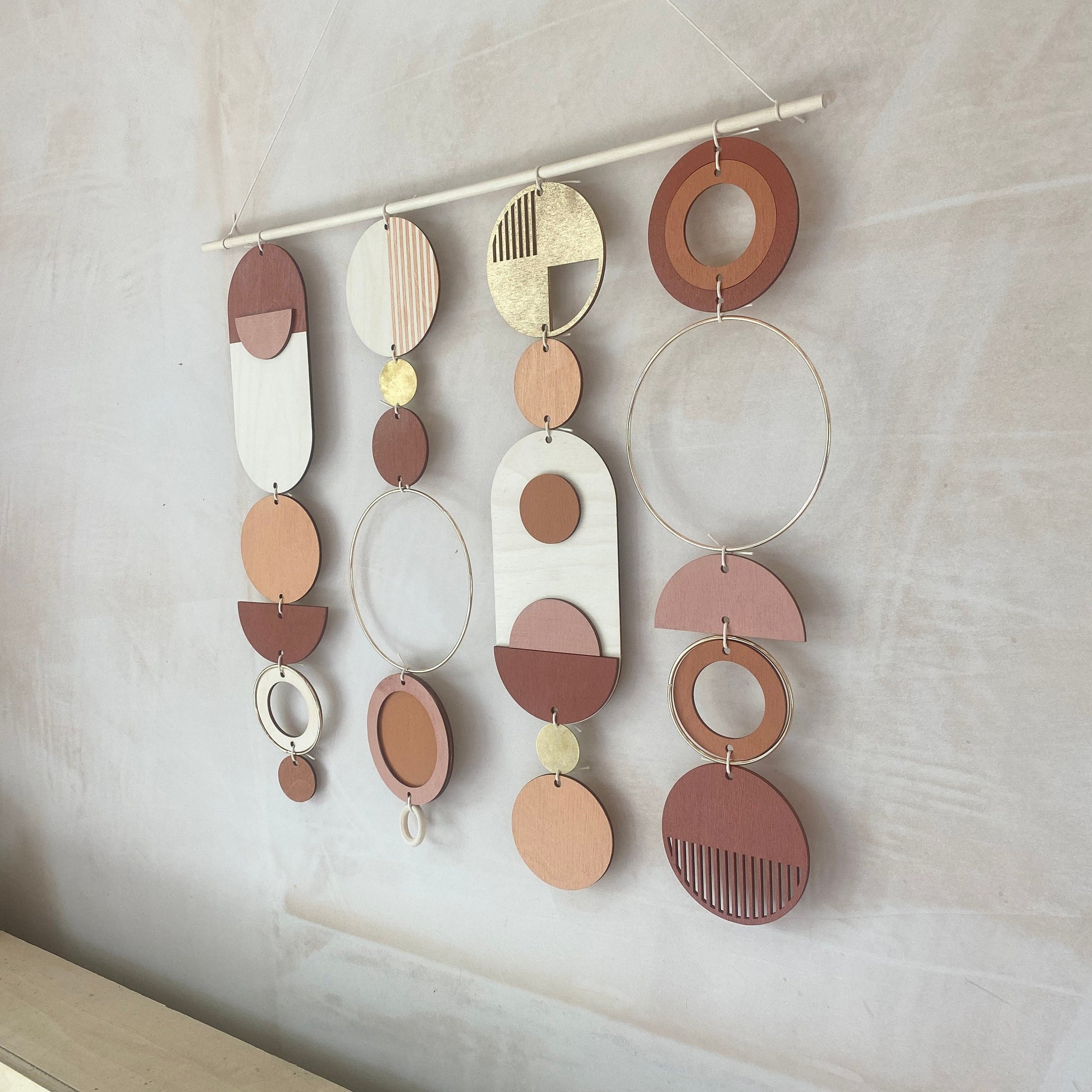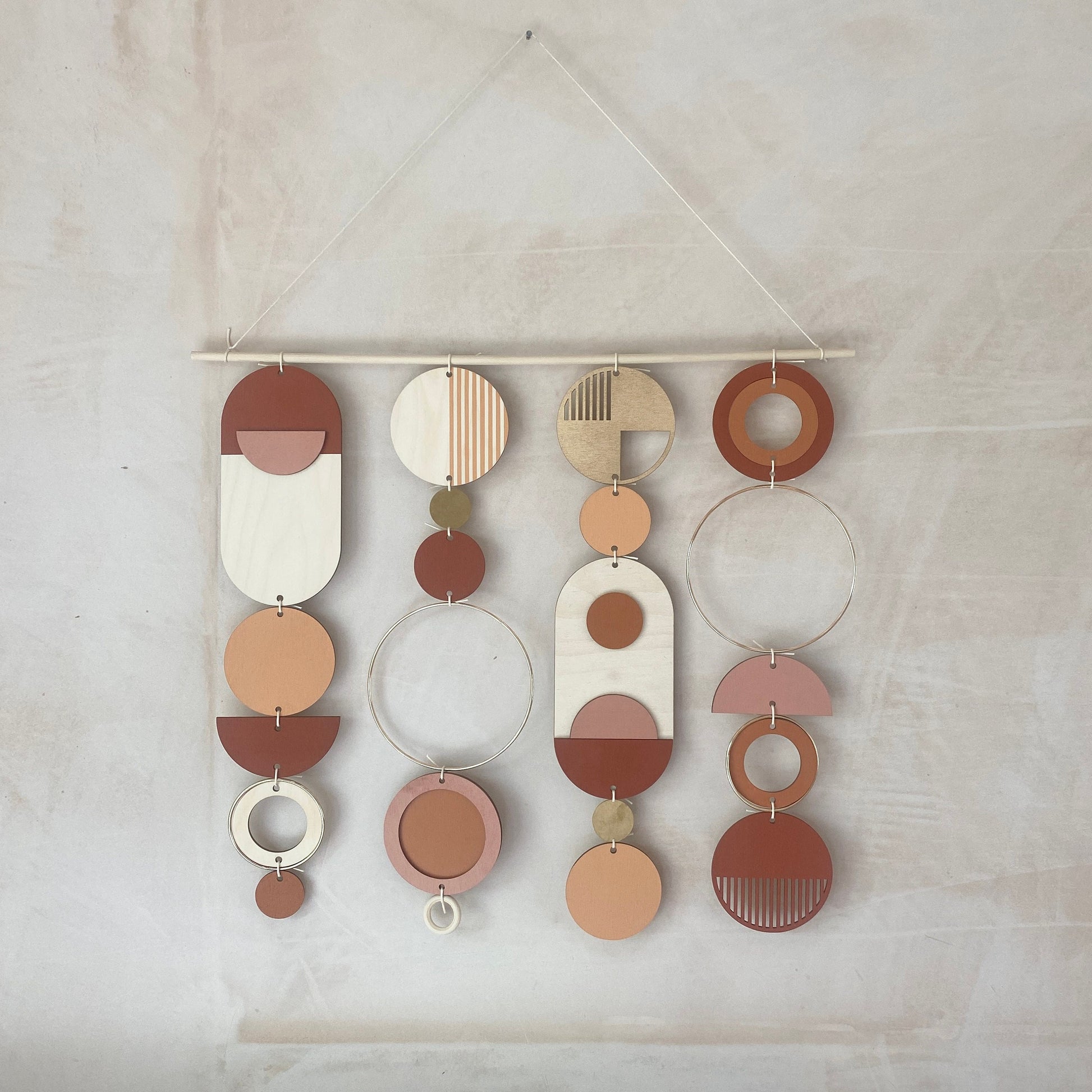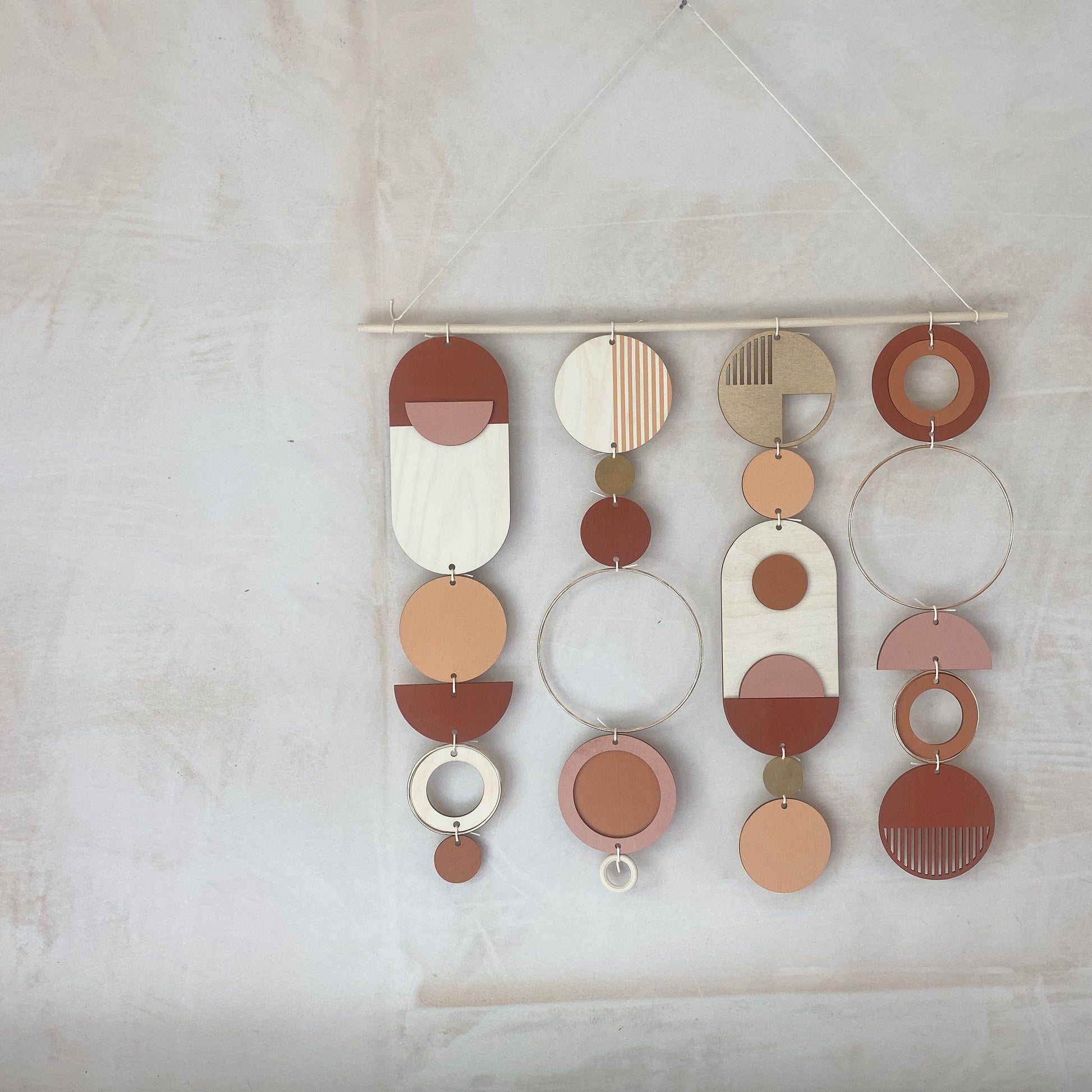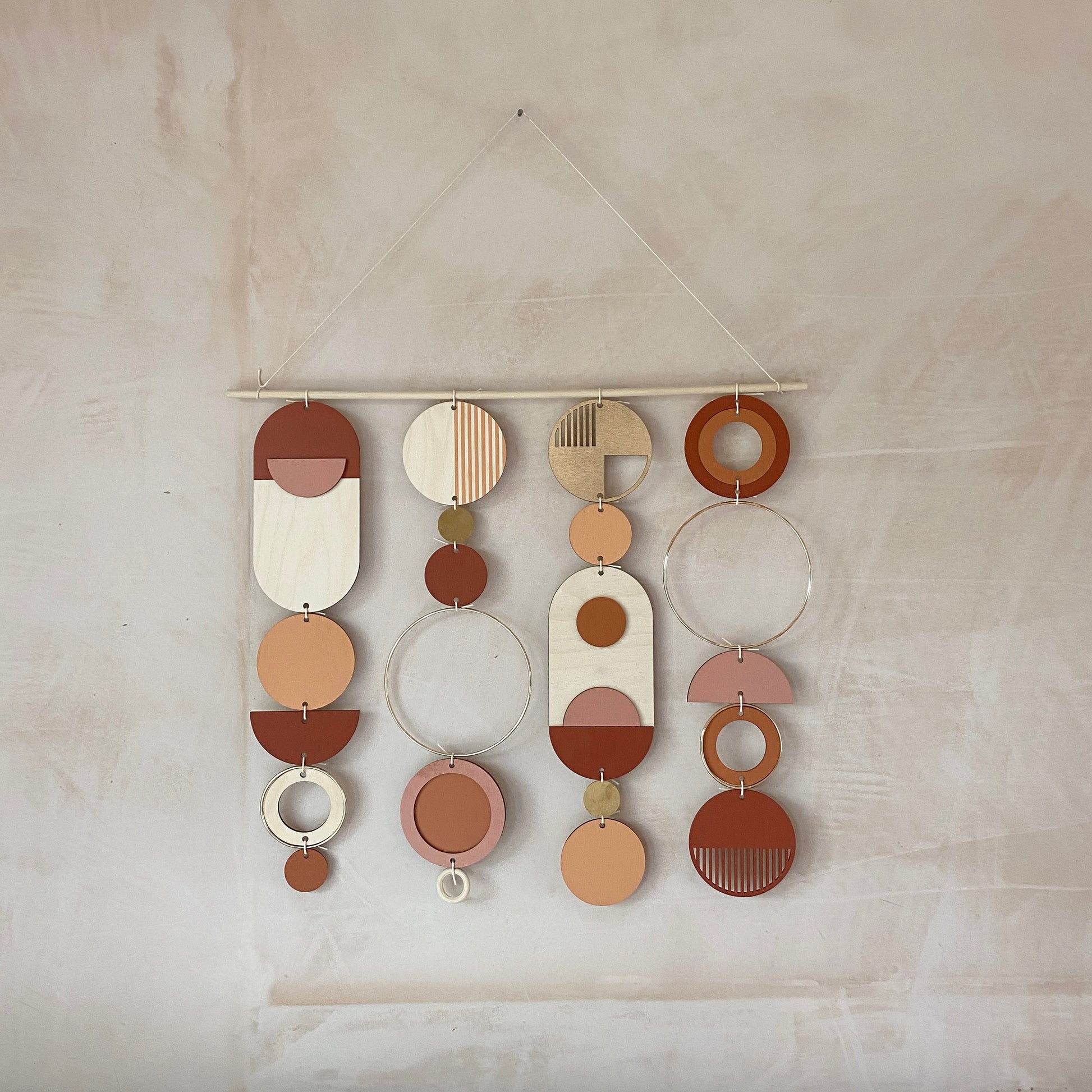 Lovingly handmade modern wall art. This Piece is made from plywood, paint, metal and waxed cord. The colours used are warm tones and gold. This slim wall hanging would make a beautiful addition to any room to create a modern mid-century feel. Made from sustainable Birch plywood, hand painted and constructed in Milton Keynes, England.