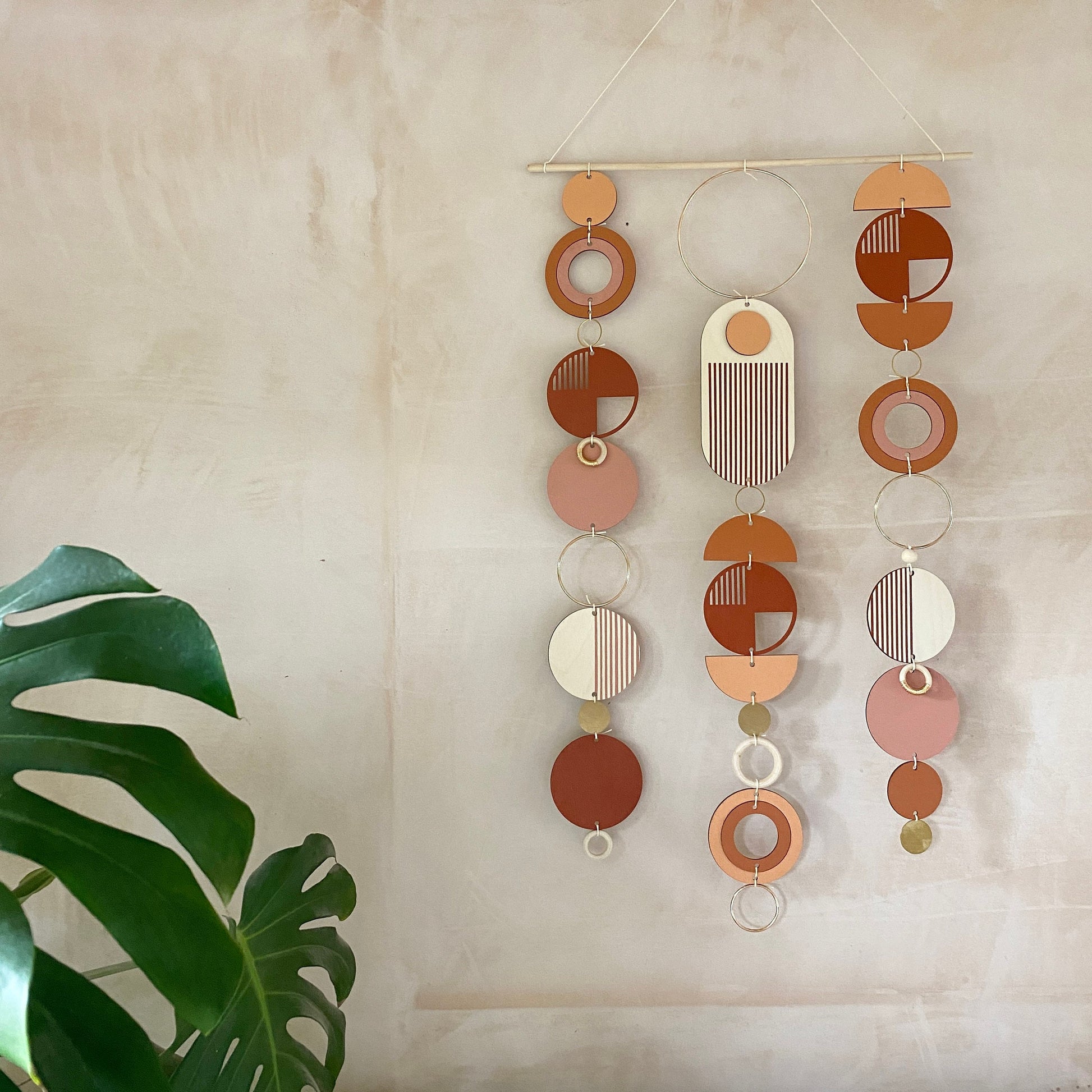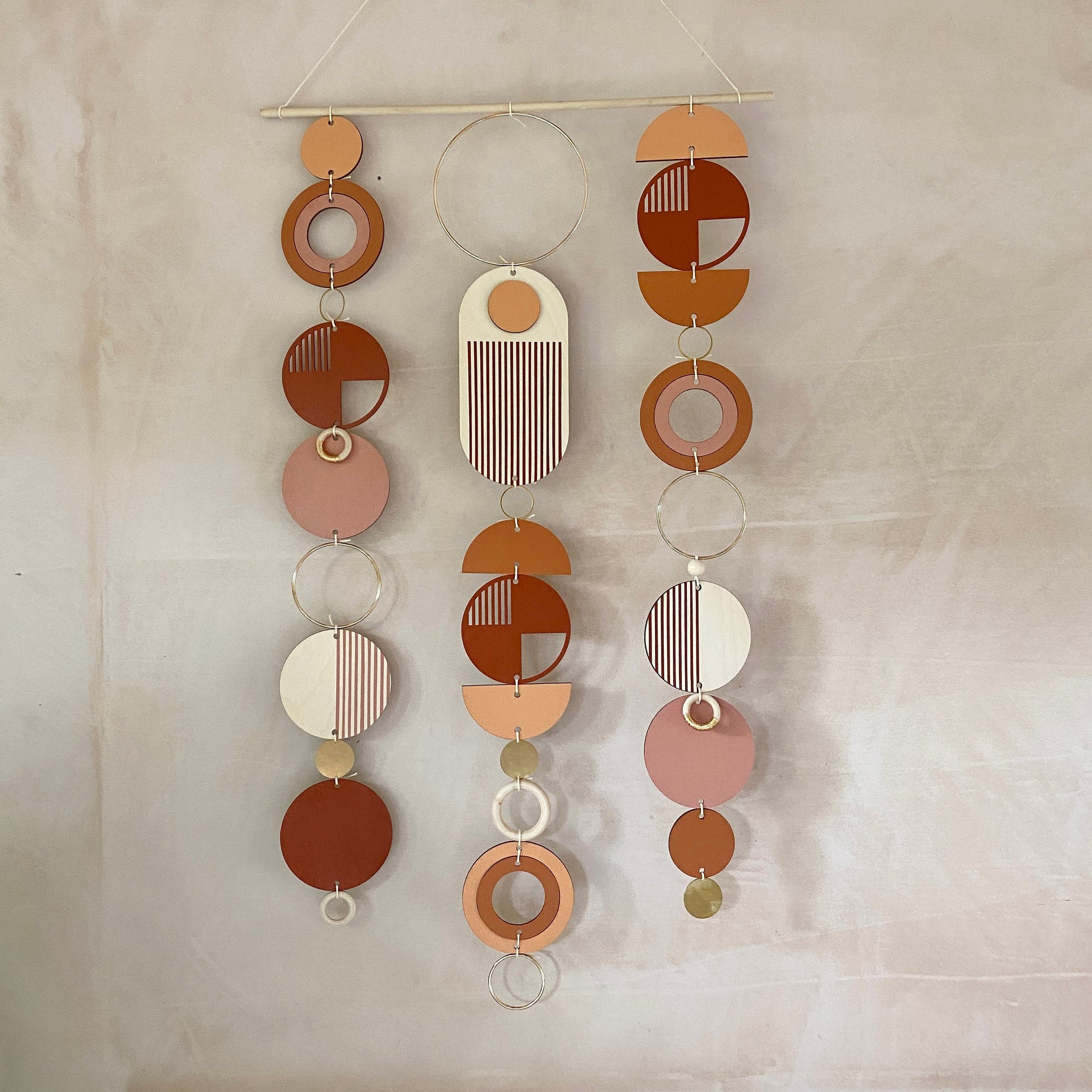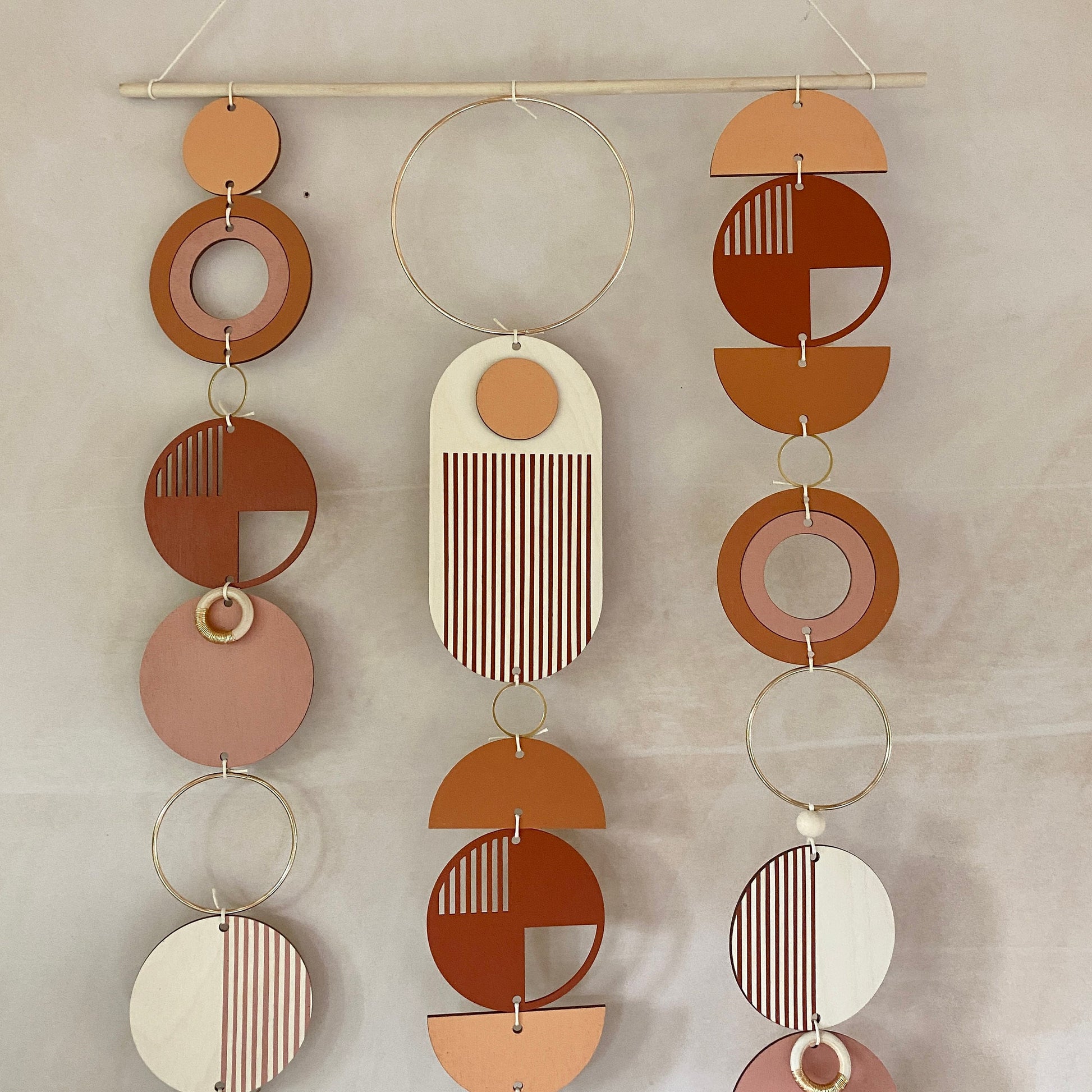 Lovingly handmade modern wall art. This Piece is made from plywood, paint, metal, waxed cord and wooden beads. The colours used are warm and rich tones with gold detail. This lovely wall hanging would make a beautiful addition to any room to create a modern mid-century feel. Made from sustainable Birch plywood, hand painted and constructed in Milton Keynes, England.