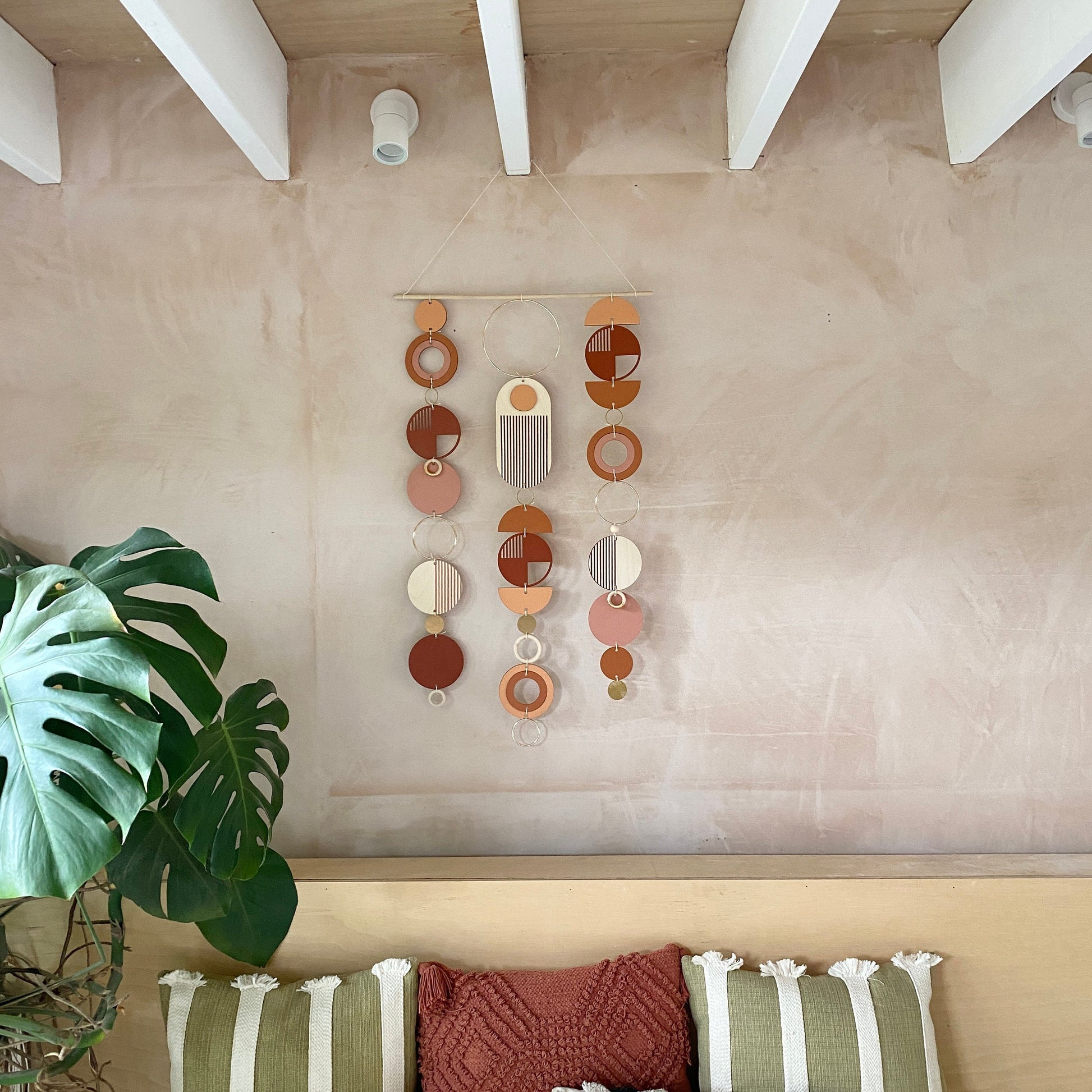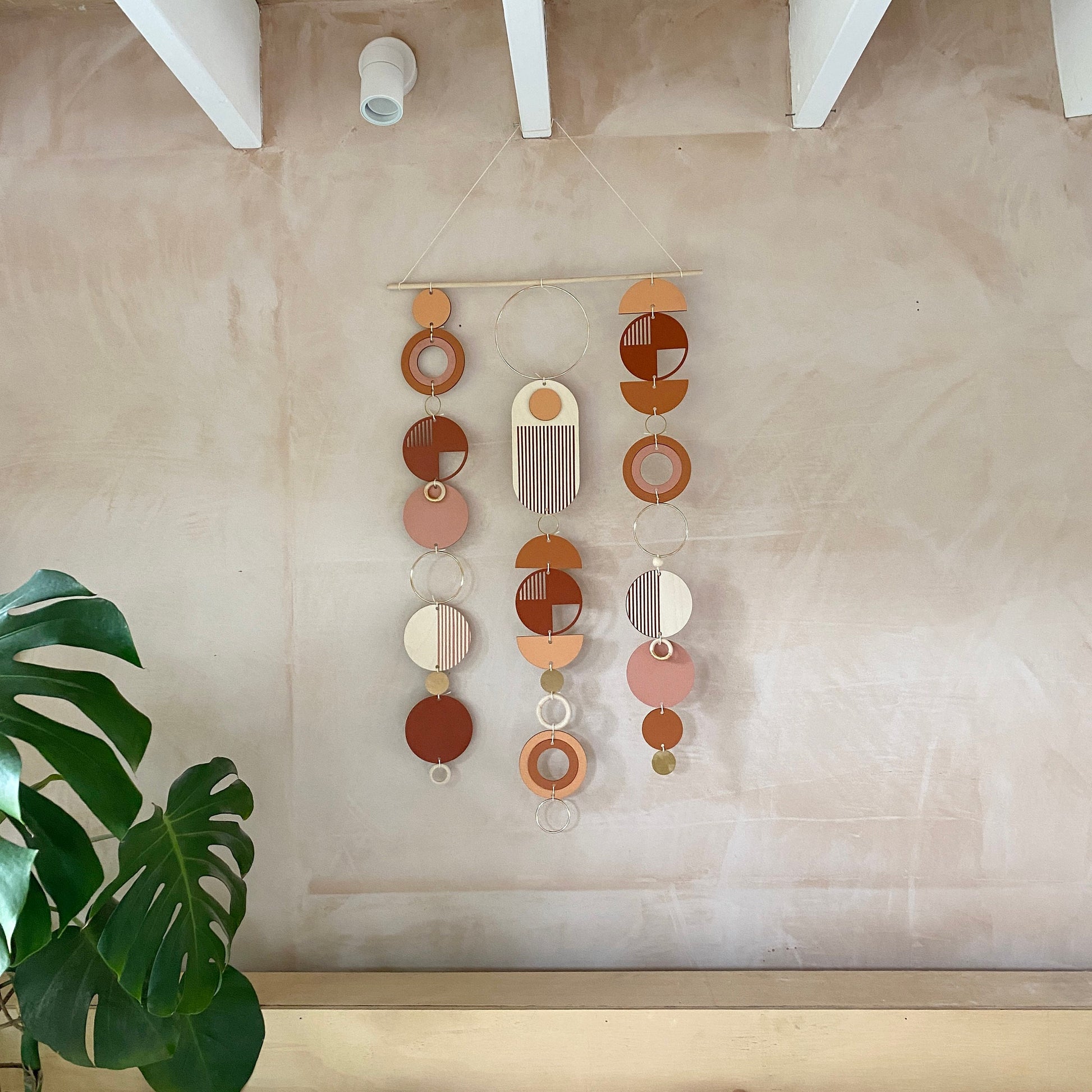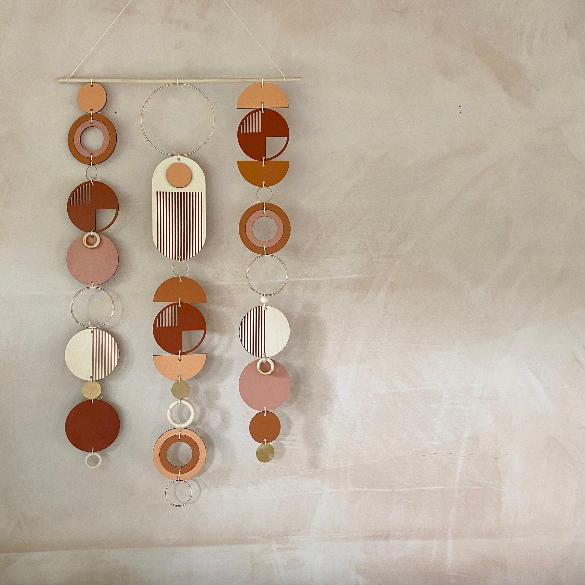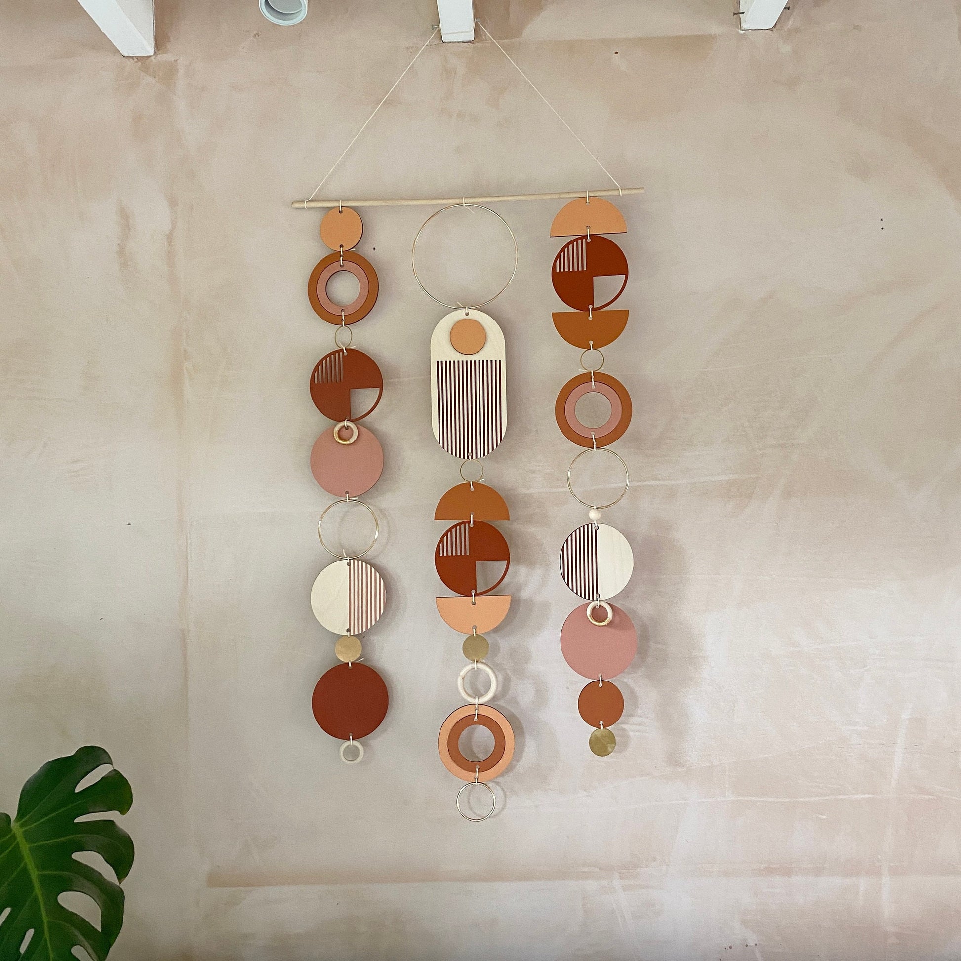 Lovingly handmade modern wall art. This Piece is made from plywood, paint, metal, waxed cord and wooden beads. The colours used are warm and rich tones with gold detail. This lovely wall hanging would make a beautiful addition to any room to create a modern mid-century feel. Made from sustainable Birch plywood, hand painted and constructed in Milton Keynes, England.